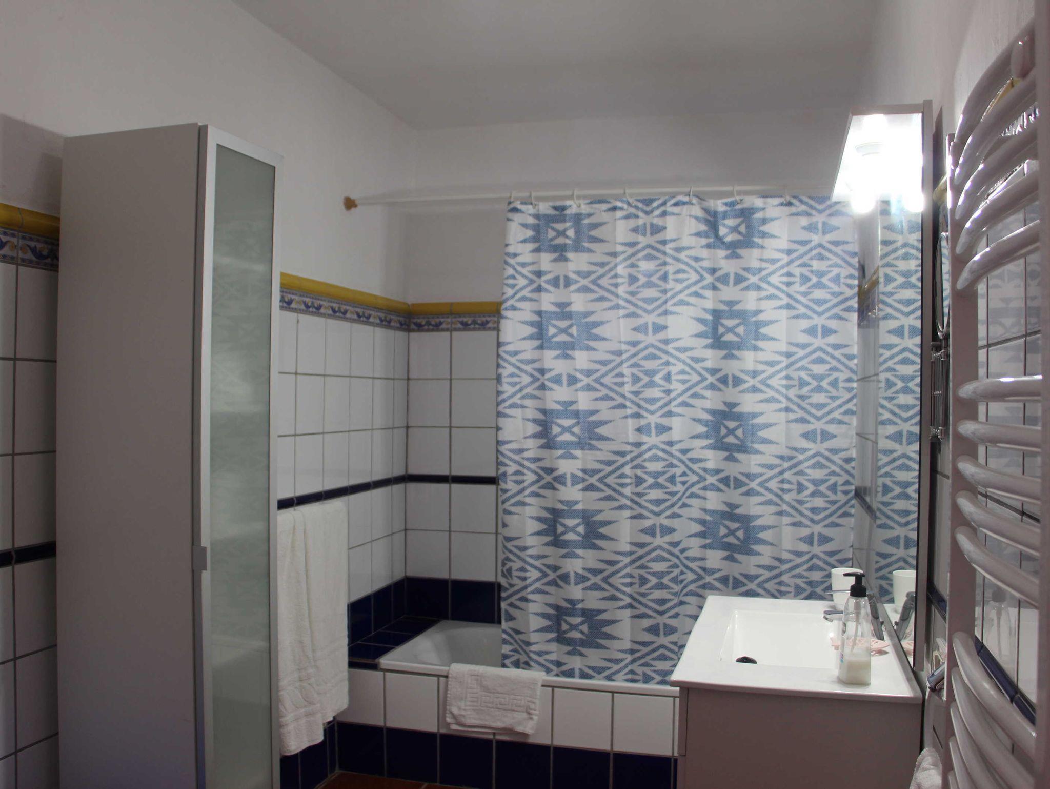Von diesem Hauptraum gehen das Schlafzimmer mit zwei Einzelbetten sowie das Bad mit Duschwanne, WC und WB ab. Vom Schlafzimmer aus haben Sie Blick auf den Pool und das Meer. Die Waschmaschine ist in einem separaten, von außen zugänglichen Raum untergebracht.