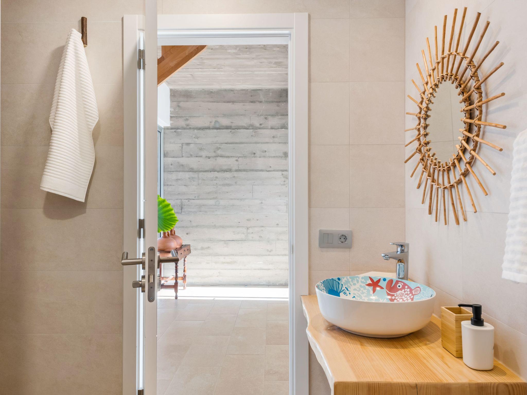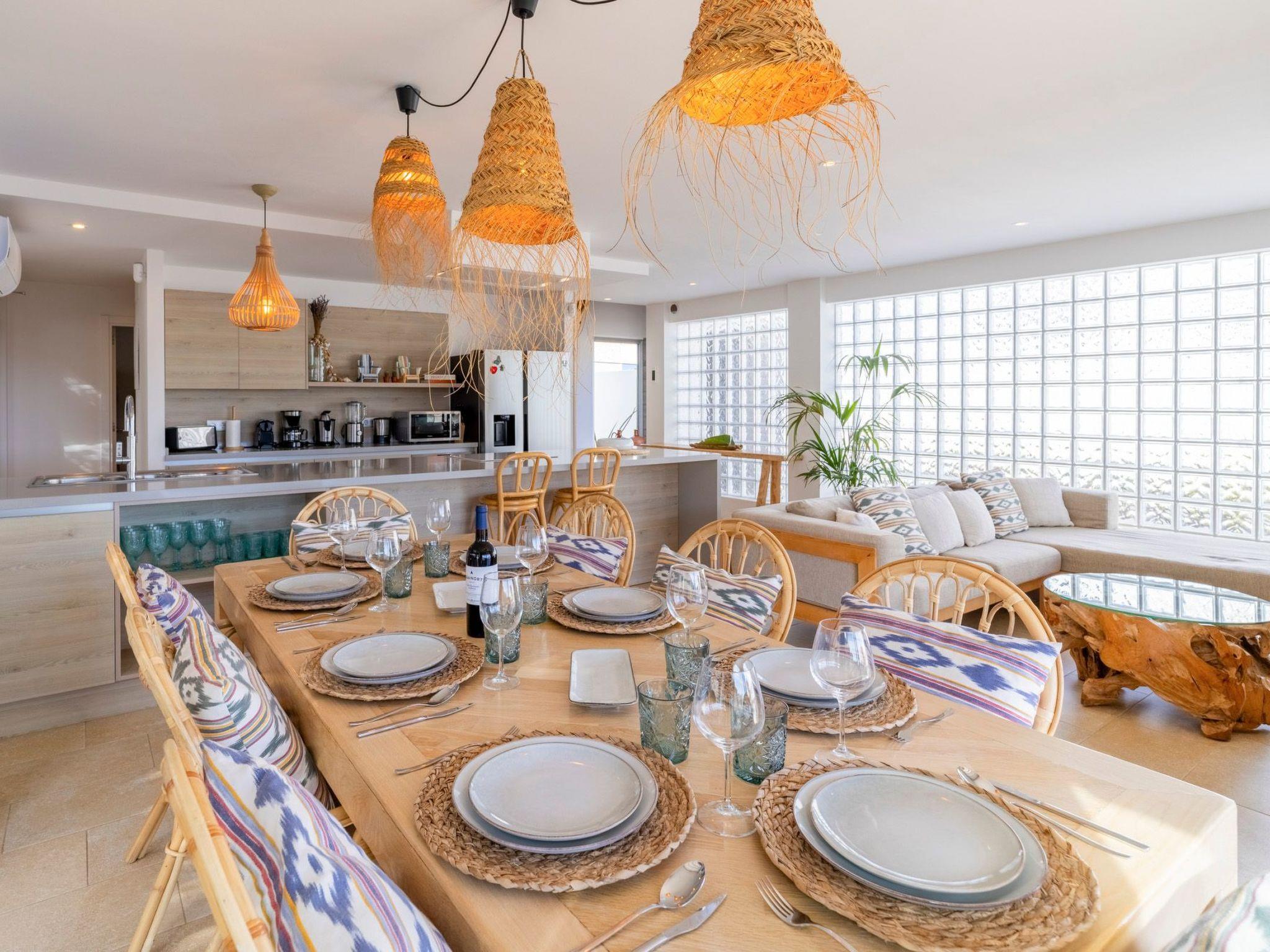 Vollständig ausgestattete offene Küche. King und Queen Size Betten. Esstisch aus Holz für 8 Personen. Geräumige Schränke aus Naturholz. Klimaanlage in allen Schlafzimmern und im Wohnzimmer. Ökologischer Deckenventilator aus Holz in der Suite. Eigenes Bad. Luxuriöse Regenduschen, Waschbecken und Wasserhähne. Luxuriöse Baumwollbettwäsche, Bademäntel, Handtücher und Strandtücher. Möbel und Dekoration im Öko-Holz-Stil. Umweltfreundliche Toilettenartikel. Kostenloses Wi-Fi. 65"- und 55"-Smart-TVs mit Kabel-/Satellitenempfang und internationalen europäischen Kanälen sowie Premium-Sportkanälen. Bluetooth-Audio. System: Kinderbett, zusätzliche Kinderbettmatratze und Hochstuhl. Waschmaschine und Bügelset. Safe.