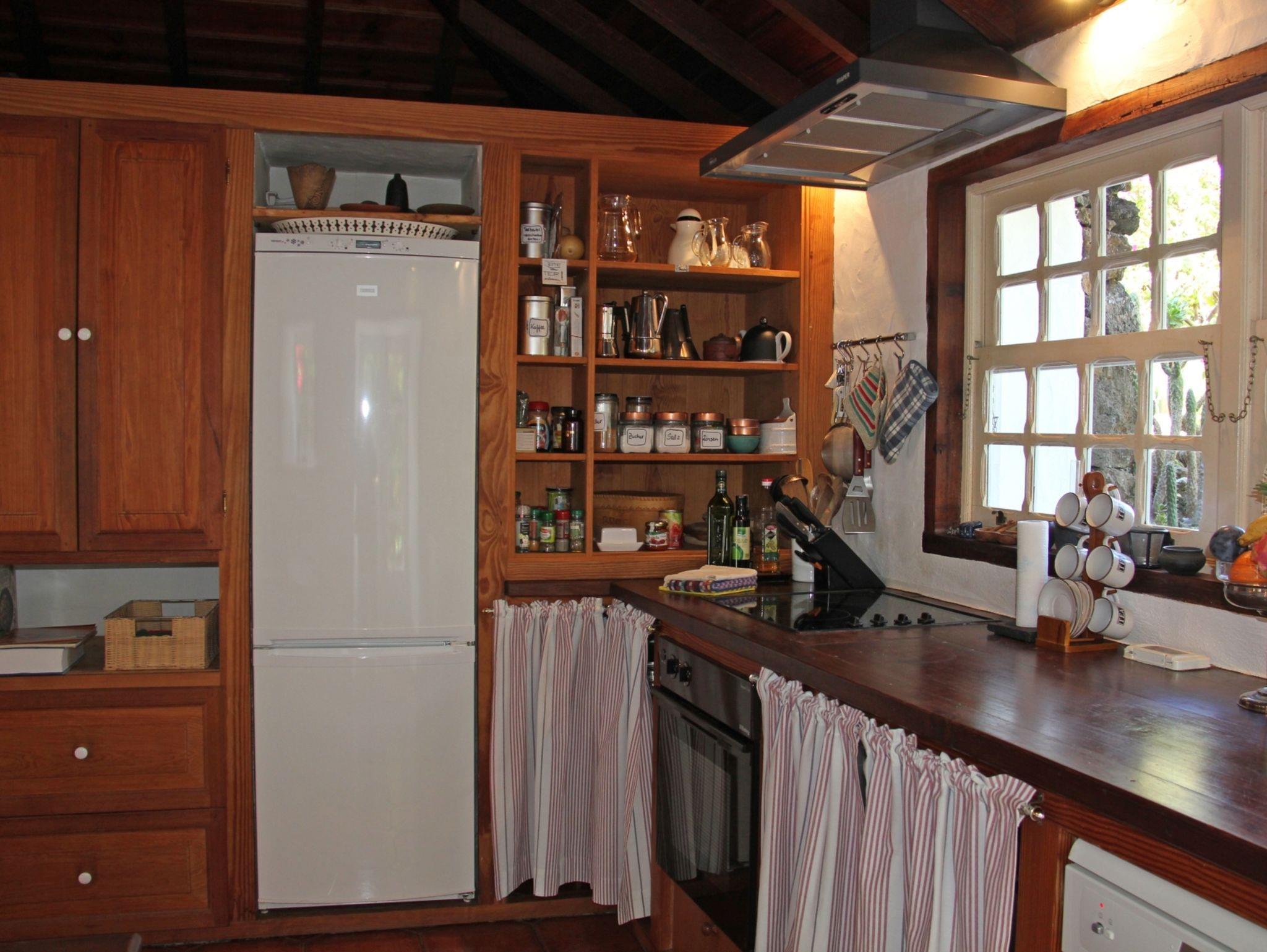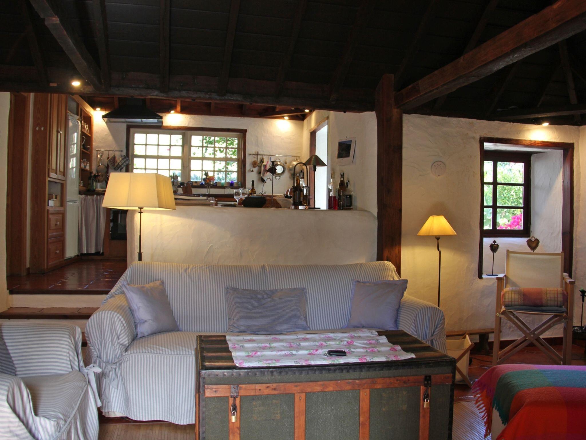 Man betritt das Haus durch den Wohnbereich, der in die offene Küche übergeht. Der Wohnraum mit dem kanarischen Holzgiebeldach ist möbliert mit einer Sitzgruppe, sowie einem Lesestuhl samt Leselampe direkt am Kamin.