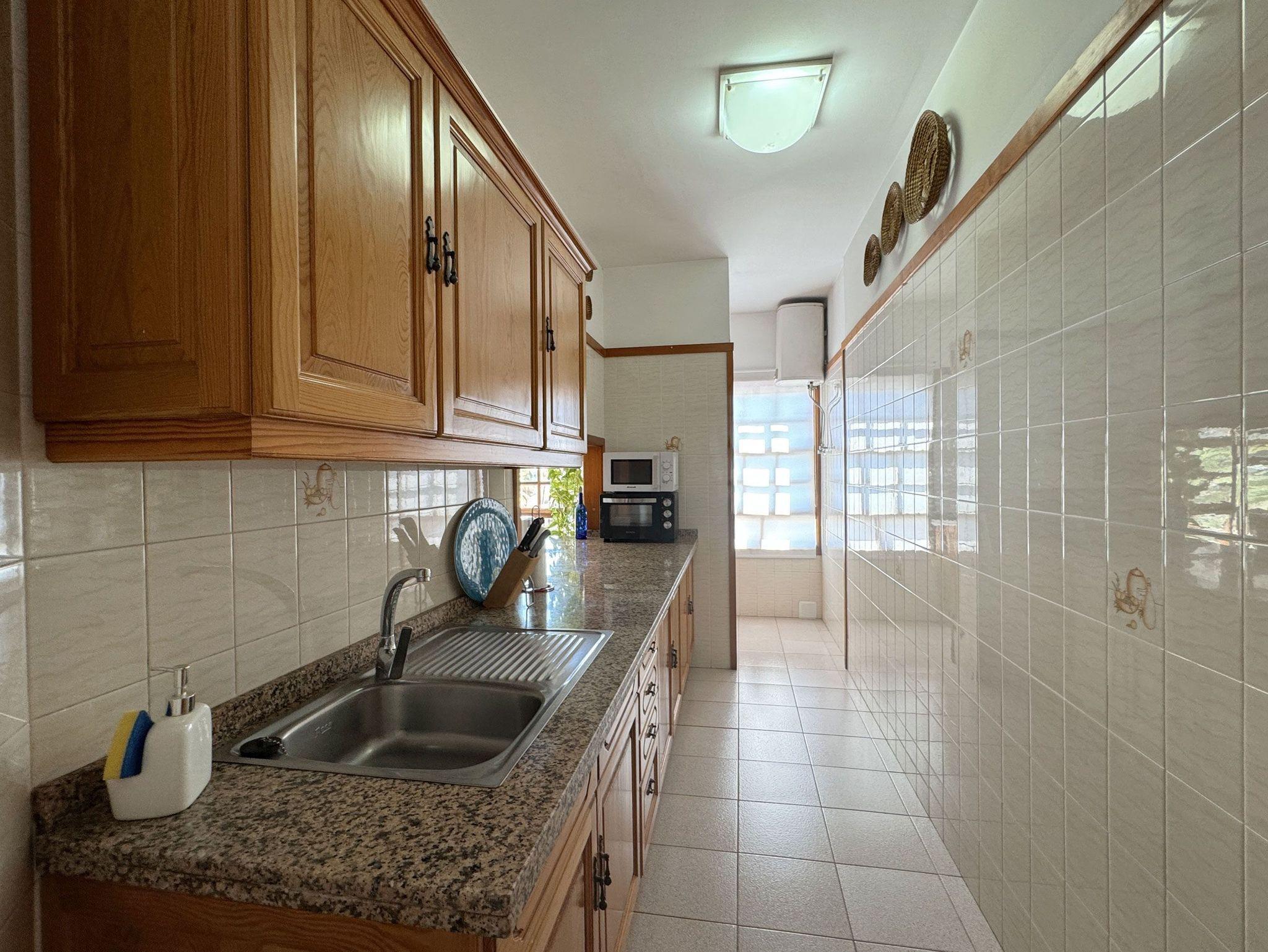 Der helle Wohn- und Essbereich ist mit einer gemütlichen Sitzgruppe und Sat-TV ausgestattet. Vor dem Fenster steht ein großer Esstisch mit vier Stühlen. Die gut ausgestattete, langgestreckte Küche ist durch eine praktische Durchreiche mit dem Wohnraum verbunden. WLAN ist vorhanden.