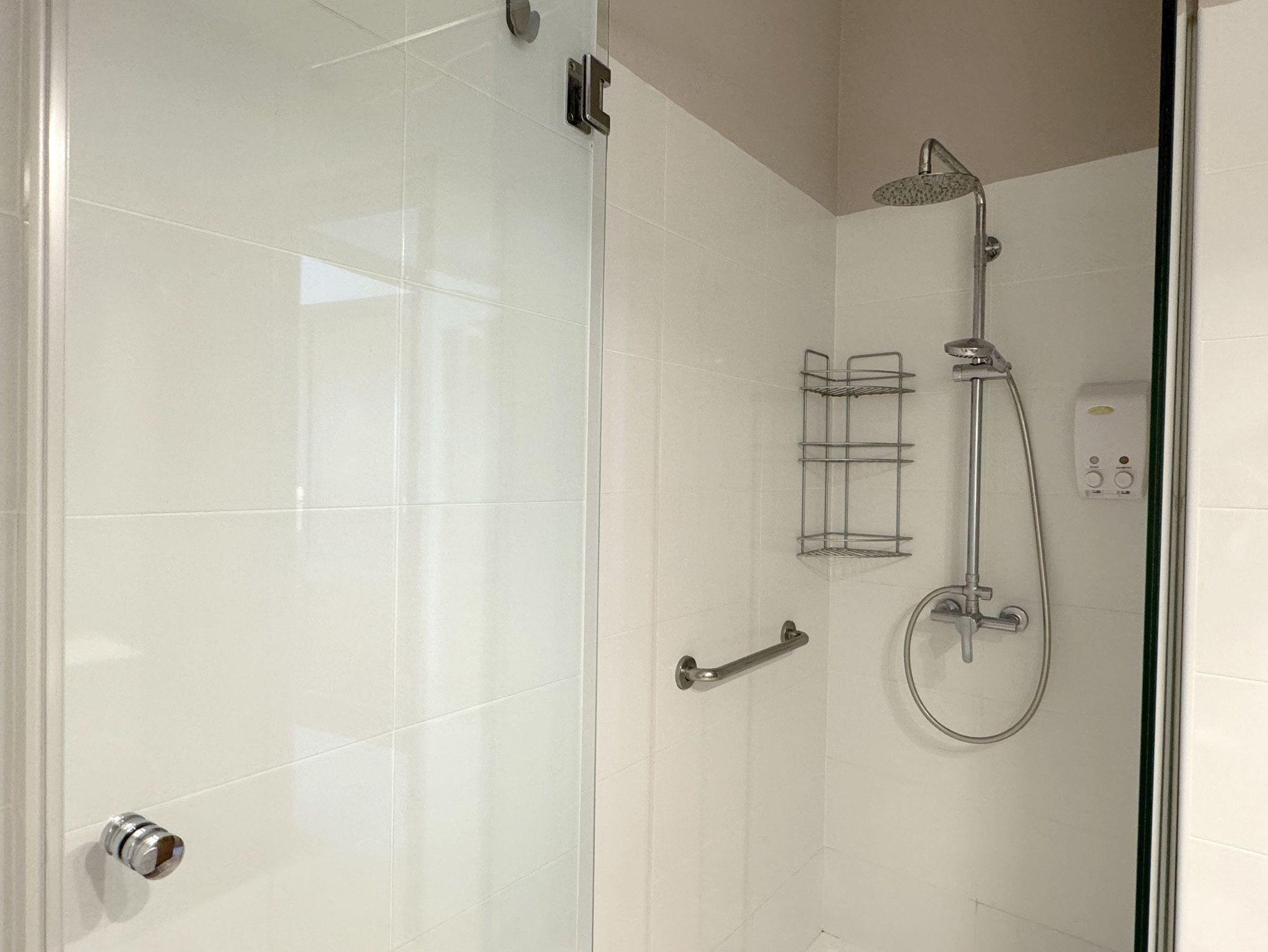 Das moderne Bad verfügt über eine begehbare Dusche, ein Waschbecken und ein WC.