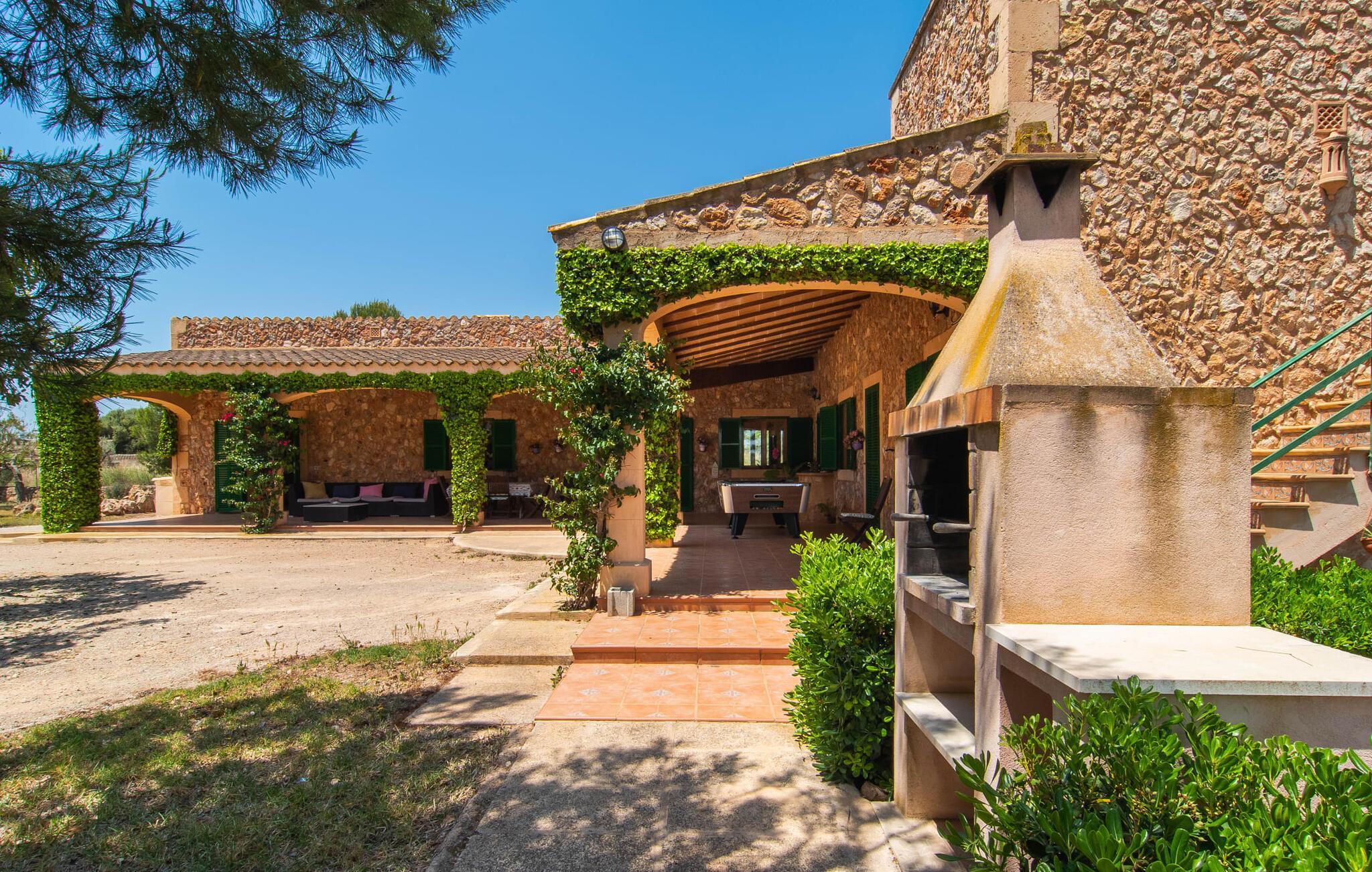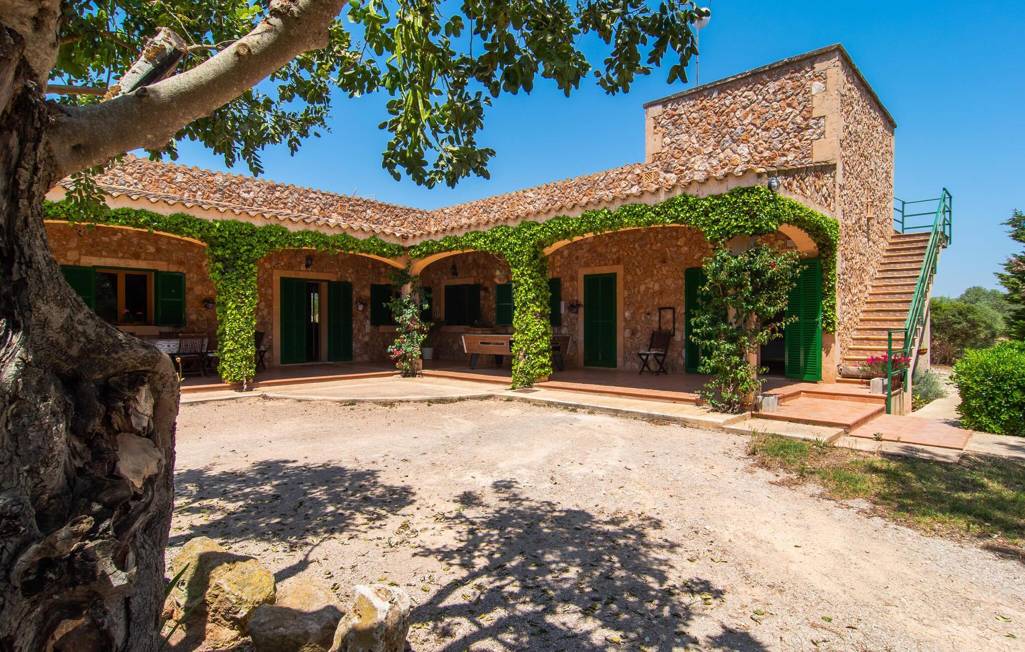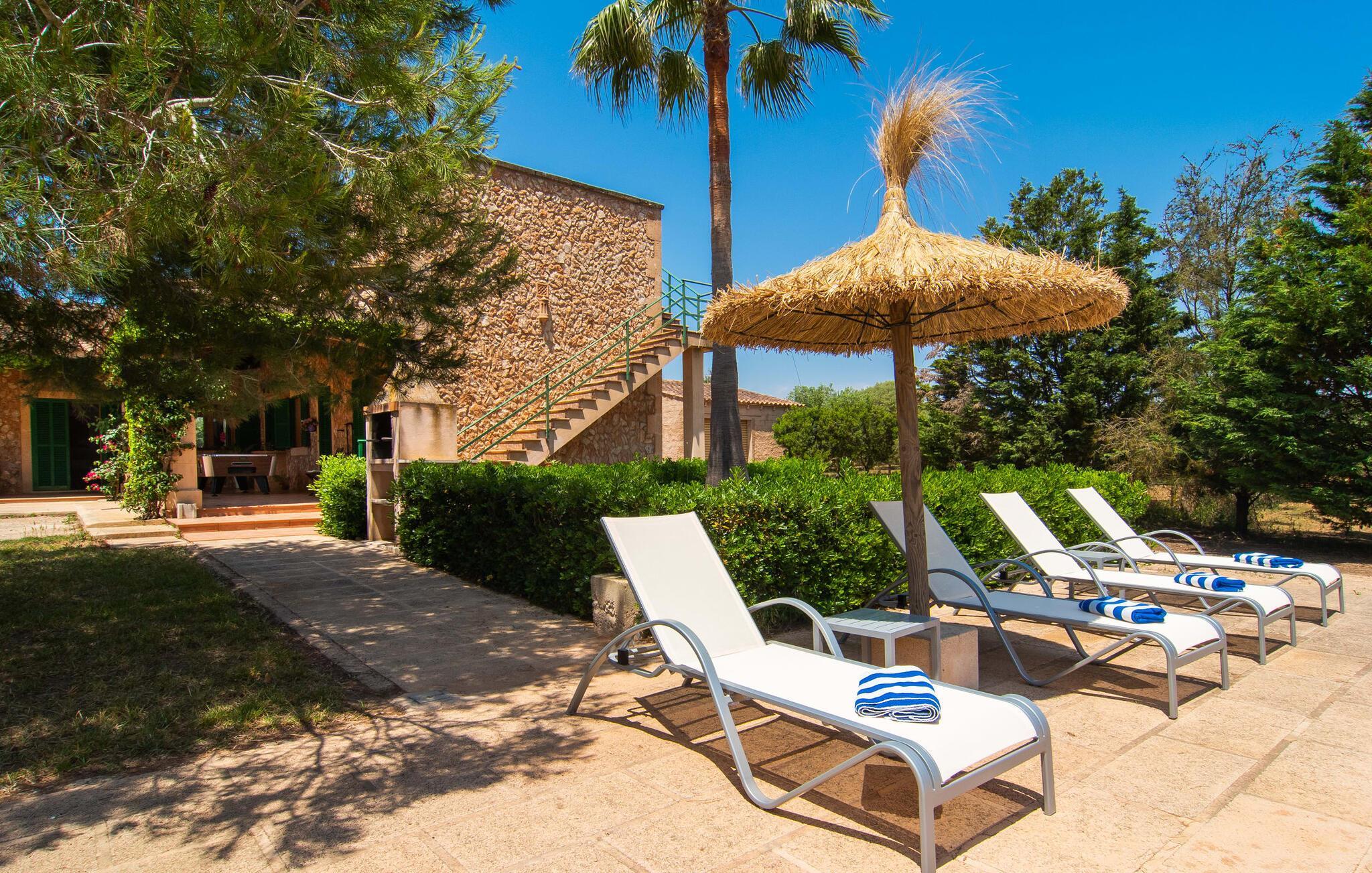 Die familienfreundliche Villa „Els Girasols“ ist ein ruhig gelegenes Landhaus, das durch eine sehr gelungene Mischung aus mallorquinischer Architektur und zeitgenössischem Innendesign besticht. Es ist mit dem inseltypischen Naturstein verkleidet und bietet sowohl innen als auch außen Großzügigkeit und Abwechslung. Auf dem 10.000 m² großen Außenbereich gibt es verschiedene Rasenflächen, liebevoll angelegte mediterrane Bepflanzungen, kleine Wege und niedliche Hecken. Dadurch ergibt sich ein angenehm entspanntes Gesamtbild, in das sich der geschmackvoll mit blauen Mosaikfliesen geflieste Pool mit bequemem Treppeneinstieg an der Vorderseite einfügt. Es ist auf zwei Seiten von einer Sonnenterrasse umgeben, auf der Sie sich in der Sonne oder unter einem der vorhandenen Sonnenschirme sonnen können. Insgesamt stehen acht bequeme Sonnenliegen zur Verfügung. Das Haus verfügt über eine großzügige überdachte Terrasse, die durch ihre teils mit Weinreben bewachsenen Säulen wunderbar heimelig wirkt. Ein entspanntes Lounge-Sofa und ein großer Esstisch laden zum Verweilen und Entspannen mit Blick auf den Garten ein – an schönen Tagen können Sie Ihre Zeit einfach im Freien verbringen und es genießen. Ein Highlight im überdachten Terrassenbereich dürfte wohl das Tischfußballset sein, auf dem Sie nach Lust und Laune spielen können.