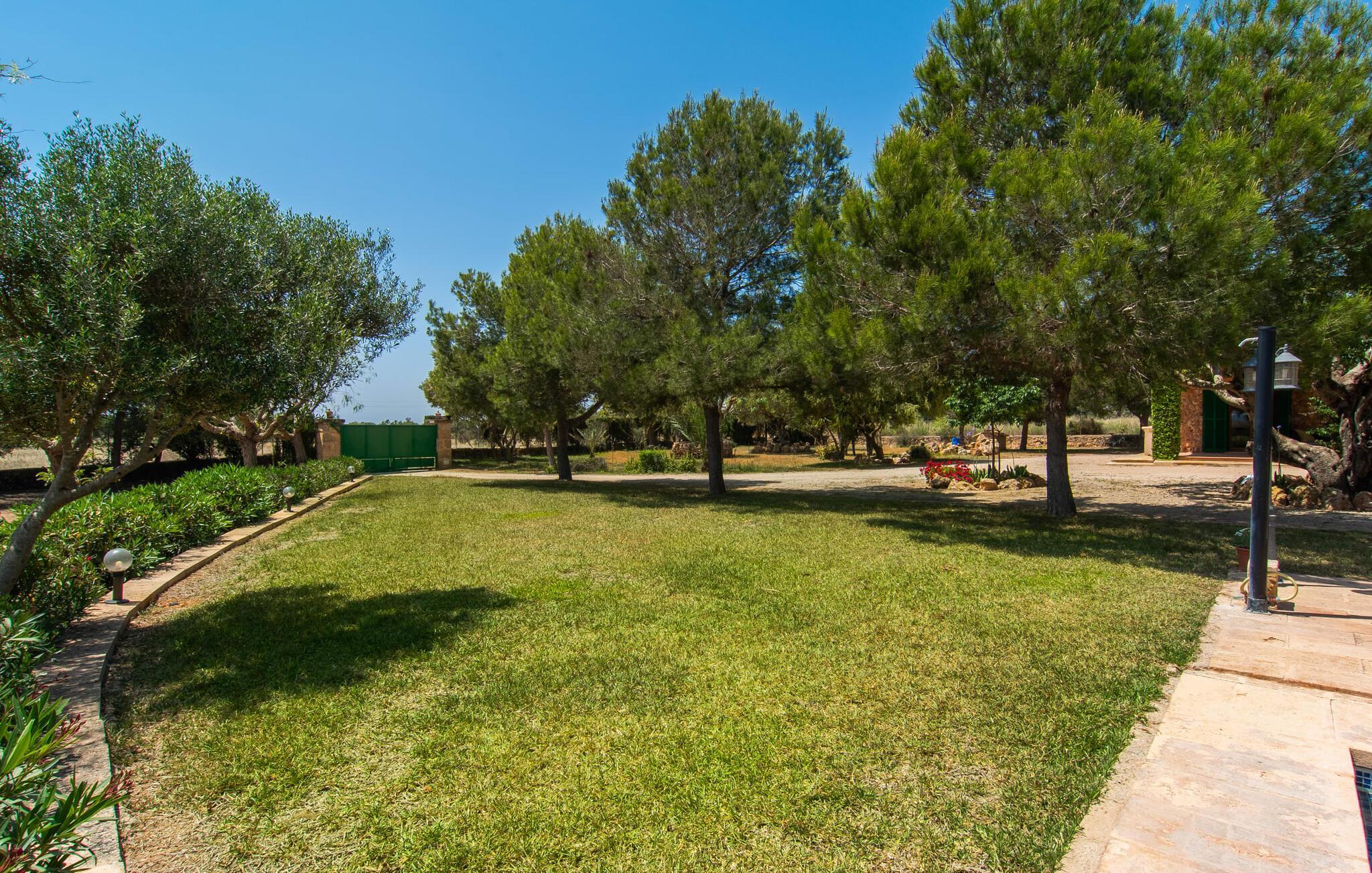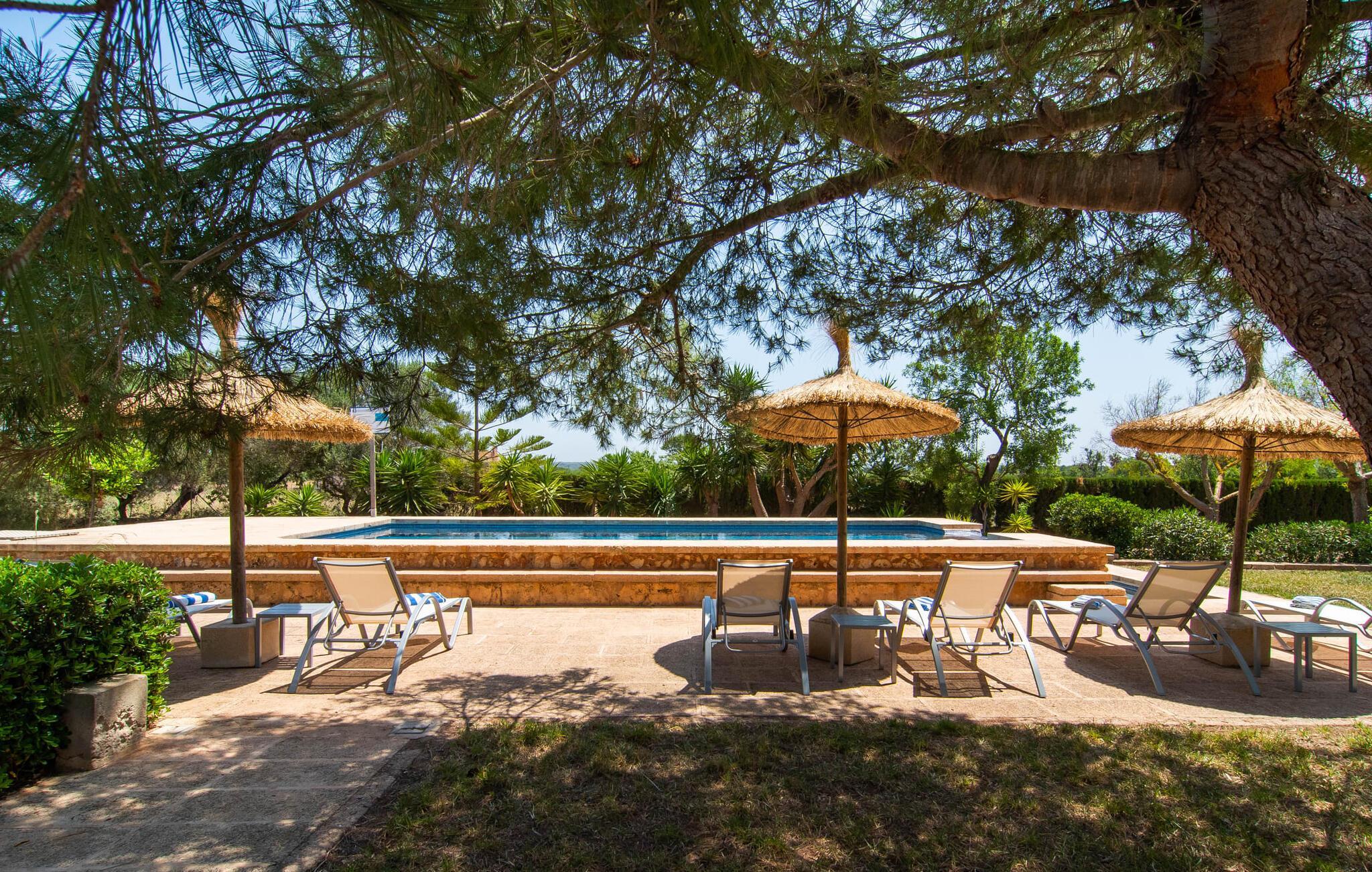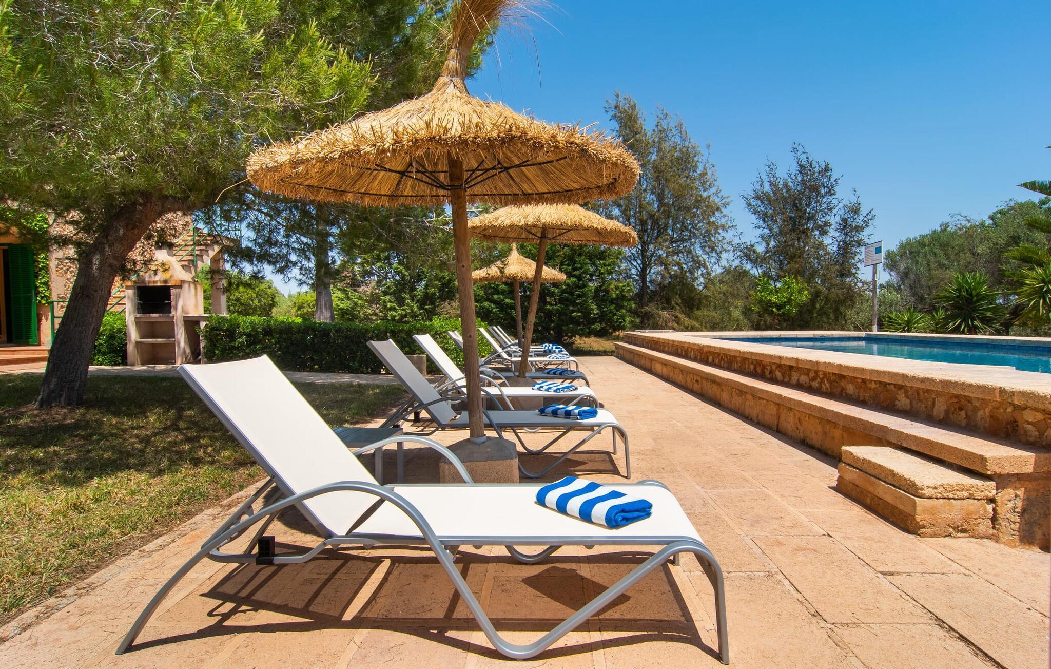 Die familienfreundliche Villa „Els Girasols“ ist ein ruhig gelegenes Landhaus, das durch eine sehr gelungene Mischung aus mallorquinischer Architektur und zeitgenössischem Innendesign besticht. Es ist mit dem inseltypischen Naturstein verkleidet und bietet sowohl innen als auch außen Großzügigkeit und Abwechslung. Auf dem 10.000 m² großen Außenbereich gibt es verschiedene Rasenflächen, liebevoll angelegte mediterrane Bepflanzungen, kleine Wege und niedliche Hecken. Dadurch ergibt sich ein angenehm entspanntes Gesamtbild, in das sich der geschmackvoll mit blauen Mosaikfliesen geflieste Pool mit bequemem Treppeneinstieg an der Vorderseite einfügt. Es ist auf zwei Seiten von einer Sonnenterrasse umgeben, auf der Sie sich in der Sonne oder unter einem der vorhandenen Sonnenschirme sonnen können. Insgesamt stehen acht bequeme Sonnenliegen zur Verfügung. Das Haus verfügt über eine großzügige überdachte Terrasse, die durch ihre teils mit Weinreben bewachsenen Säulen wunderbar heimelig wirkt. Ein entspanntes Lounge-Sofa und ein großer Esstisch laden zum Verweilen und Entspannen mit Blick auf den Garten ein – an schönen Tagen können Sie Ihre Zeit einfach im Freien verbringen und es genießen. Ein Highlight im überdachten Terrassenbereich dürfte wohl das Tischfußballset sein, auf dem Sie nach Lust und Laune spielen können.