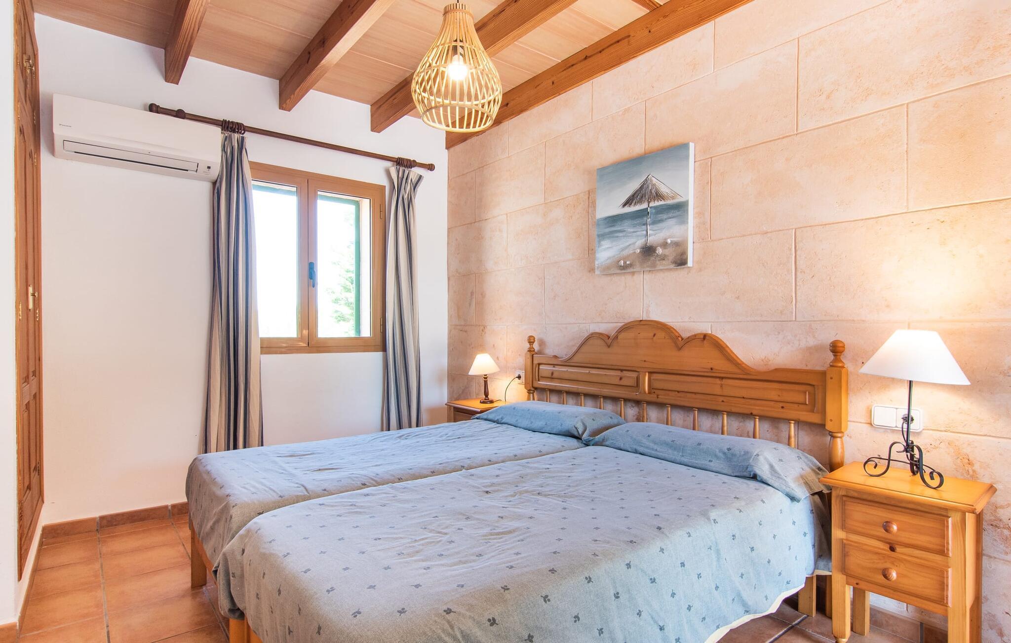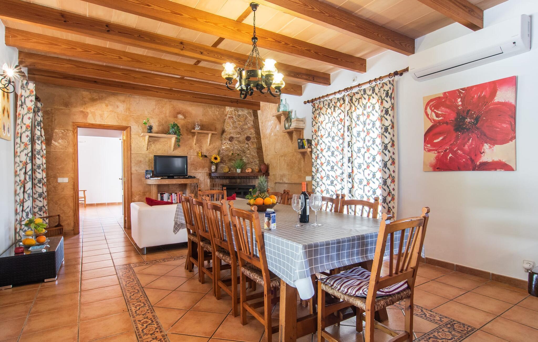 Betritt man das Innere der Villa von der Terrasse aus, wird man von einem großen, sehr rustikalen Wohnzimmer begrüßt, das dem Gast nicht nur eine komplette Ausstattung inklusive Wasserkocher, Filterkaffeemaschine und Espressomaschine bietet, sondern auch eine sehr gemütlicher Wohn-/Essbereich. Hier ist der Kamin bequem eingebaut und auch der Fernseher findet in dieser rustikalen Ecke des Hauses seinen Platz. An dem langen Holztisch finden mindestens acht Personen bequem Platz. Eine kleine Steinbank am Kamin bietet ebenso wie das bequeme Sofa Ablage- oder Sitzmöglichkeiten. Ein attraktives Sideboard bietet nicht nur Stauraum, sondern ist auch ein schöner Blickfang. Die vier geräumigen Schlafzimmer sind komfortabel und gemütlich eingerichtet, mit vielen Holzelementen und dezenten Farben. In ihnen sind jeweils zwei 0,9 x 2 m große Betten zusammengefasst, so dass Sie auch nachts genügend Platz für einen erholsamen Urlaubsschlaf haben. Die helle Wand- und Deckengestaltung sowie die passenden Bodenfliesen sorgen in diesen Räumen für ein reines, angenehmes Klima. Es stehen vier geschmackvolle Tageslichtbäder zur Verfügung, zwei davon praktischerweise en-suite. Sie können Ihren Haartrockner bequem zu Hause lassen.