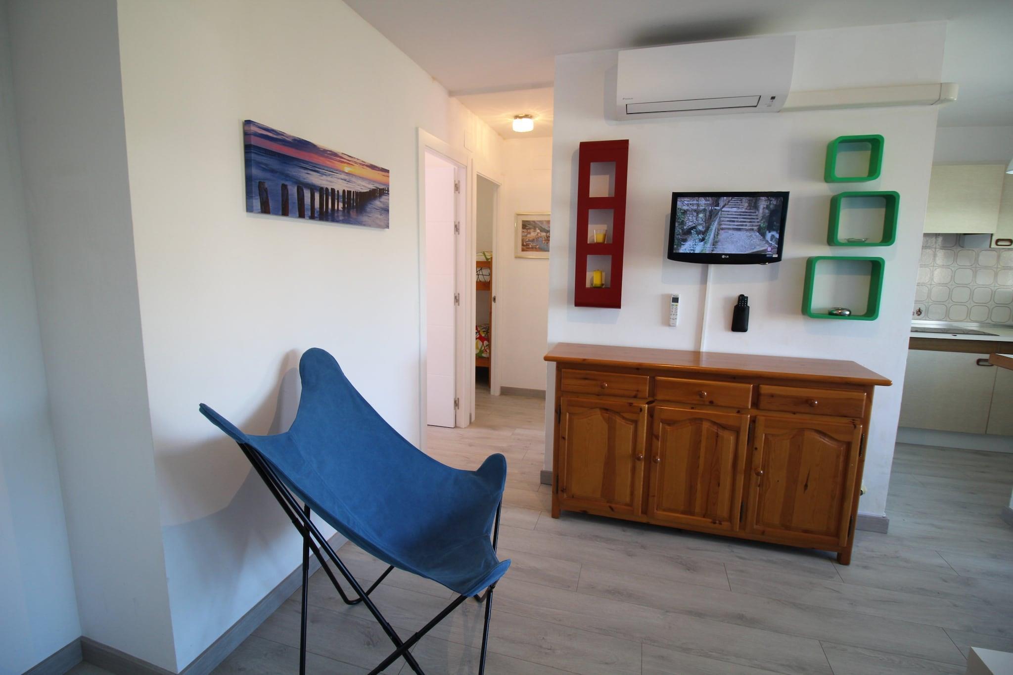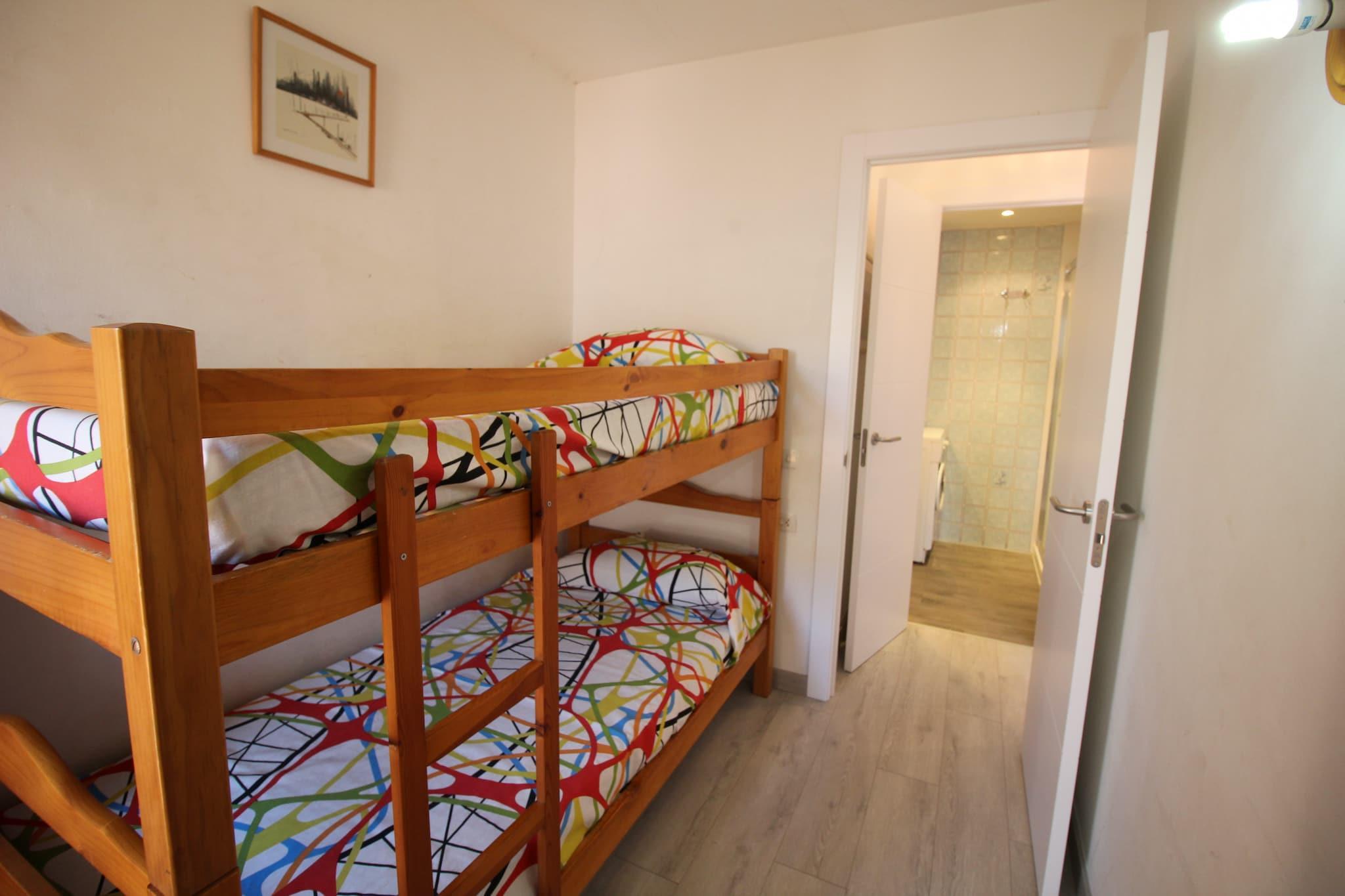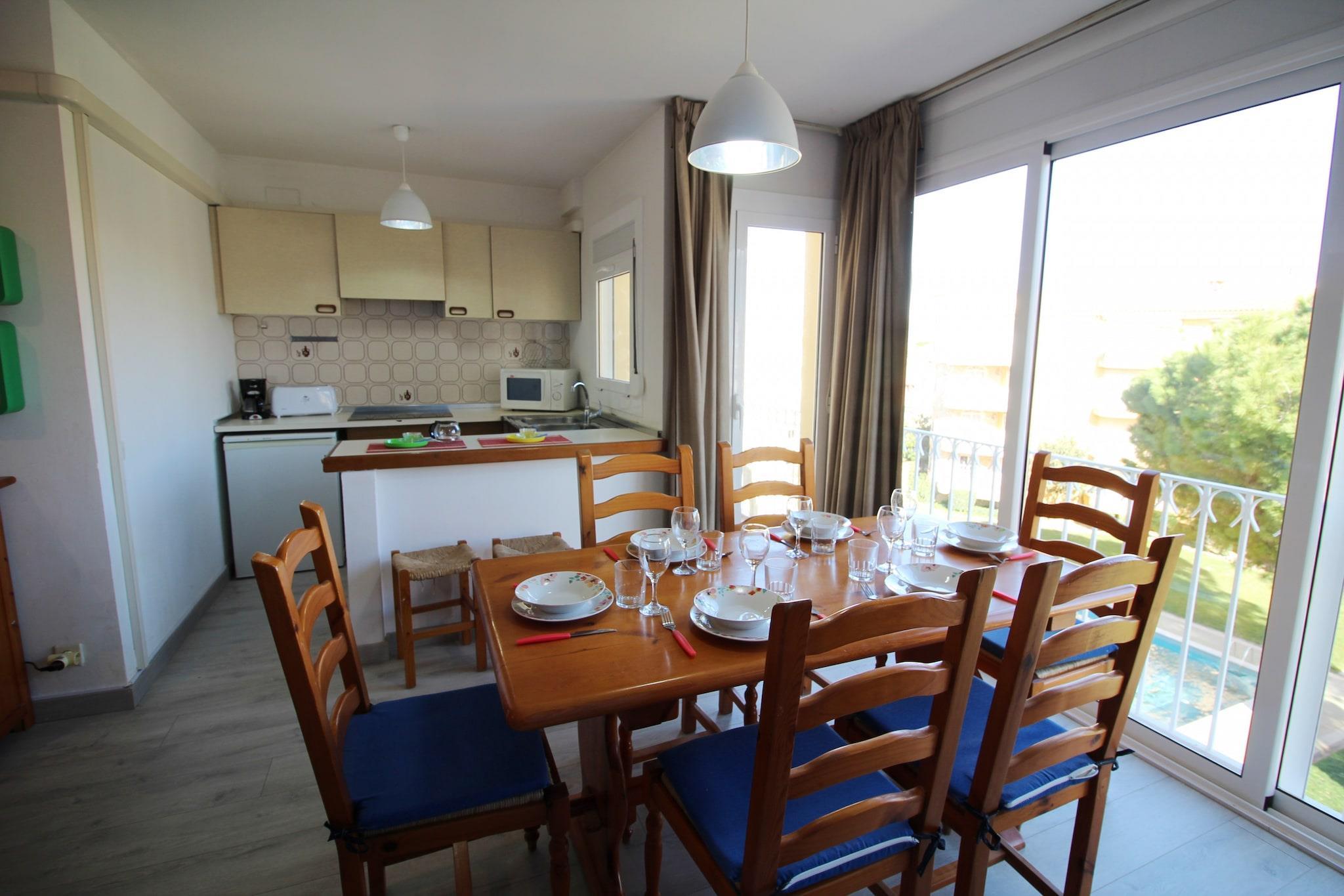 Nur 300 Meter vom Sandstrand entfernt bietet dieses gemütliche Apartment mit zwei Schlafzimmern in Empuriabrava einen komfortablen und angenehmen Aufenthalt für bis zu sechs Gäste. Das 50 m² große Apartment befindet sich im dritten Stock einer familienfreundlichen Anlage und bietet Blick auf einen Gemeinschaftspool. Es ist von Geschäften, Restaurants und lokalen Annehmlichkeiten umgeben und somit der ideale Ausgangspunkt für einen erholsamen Strandurlaub. Das Apartment verfügt über einen hellen Wohnbereich mit Klimaanlage, WLAN (optional) und Fernseher sowie eine voll ausgestattete offene Küche mit Cerankochfeld, Mikrowelle, Kaffeemaschine und Waschmaschine. Die private Terrasse mit Gartenmöbeln lädt zum Genießen von Mahlzeiten oder zum Entspannen nach einem Tag in der Sonne ein. Gästen stehen vier saisonale Swimmingpools der Anlage gegen Aufpreis zur Verfügung. Mit einem Supermarkt in nur 200 Metern Entfernung und der guten Anbindung an nahegelegene Sehenswürdigkeiten wie den Golfplatz Peralada, den AVE/TGV-Bahnhof Figueres und den Flughafen Girona vereint dieses Apartment Komfort, Bequemlichkeit und ein erschwingliches Preis-Leistungs-Verhältnis. Egal, ob Sie mit Familie oder Freunden reisen, es bietet einen angenehmen und praktischen Aufenthalt in Strandnähe.