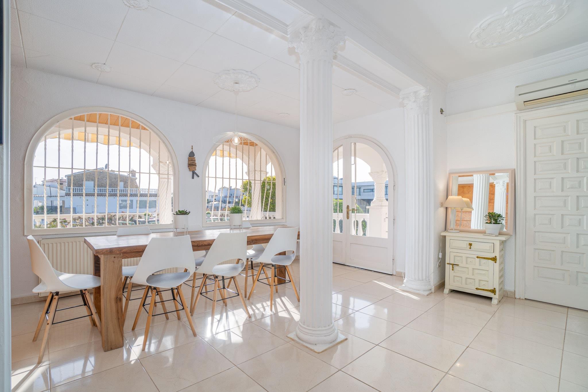 Diese geräumige, 215 m² große Villa in Empuriabrava bietet einen luxuriösen und komfortablen Aufenthalt für bis zu 8 Gäste. Mit vier gut ausgestatteten Schlafzimmern, zwei Badezimmern und einem Gäste-WC ist das Haus ideal für Familien oder Gruppen, die einen erholsamen Urlaub am Wasser verbringen möchten. Das Anwesen verfügt über einen privaten Pool, eine große Terrasse mit Gartenmöbeln und einen Grillplatz – perfekt, um das mediterrane Klima zu genießen. Die Villa bietet eine voll ausgestattete separate Küche mit modernen Geräten wie Kühlschrank, Backofen, Mikrowelle, Geschirrspüler, Waschmaschine und Trockner. Freuen Sie sich auf Annehmlichkeiten wie WLAN, Sat-TV, Klimaanlage im Wohnzimmer und einigen Schlafzimmern sowie einen Außenparkplatz. Ein besonderes Highlight ist der private Anlegeplatz – ideal für Gäste, die mit dem Boot anreisen oder die Kanäle von Empuriabrava erkunden möchten. Die Villa liegt in einer ruhigen Wohngegend, nur 1 km vom nächsten Supermarkt und 2 km vom Sandstrand entfernt. Golfbegeisterte können den 16 km entfernten Golfplatz Peralada besuchen, während kulturelle Sehenswürdigkeiten wie das Dalí-Museum in Figueres nur 20 km entfernt sind. Der Flughafen Girona ist 65 km entfernt und bietet internationalen Reisenden eine bequeme Anbindung.