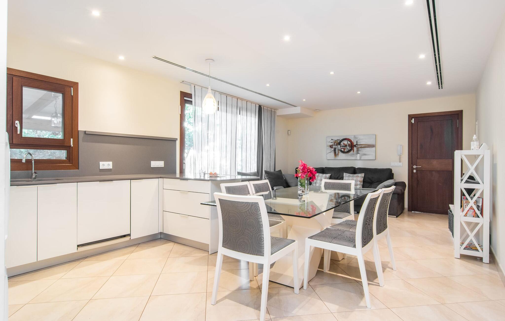 Das Innere der Villa ist so entspannt wie ihre Lage, mit hellen Bodenfliesen und sanfter, stimmungsvoller Beleuchtung. Der offene Wohn-, Ess- und Küchenbereich ist geräumig und vielseitig einsetzbar. Die Küche ist komplett ausgestattet, und die Theke im amerikanischen Stil mit Barhockern sorgt für ein geselliges Erlebnis zur Selbstverpflegung. Im Erdgeschoss befinden sich zwei Doppelzimmer, eines mit eigenem Bad, während sich ein drittes Schlafzimmer im Obergeschoss befindet, ebenfalls mit eigenem Bad. Die Fußbodenheizung der Villa sorgt das ganze Jahr über für Komfort und macht "Es Baladre Beach" auch in den milden Wintermonaten zu einem perfekten Reiseziel.