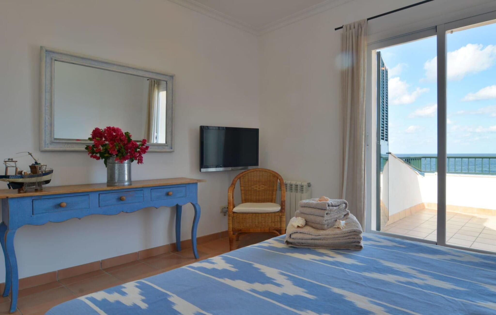 Der offene Innenraum der Villa ist dank zahlreicher raumhoher Fenster mit natürlichem Licht durchflutet. Das Erdgeschoss verfügt über einen geräumigen Wohnbereich, der nahtlos mit dem Esszimmer verbunden ist, komplett mit Kamin und direktem Zugang zur Poolterrasse. Eine moderne, gut ausgestattete Einbauküche und ein gemütliches Doppelschlafzimmer mit eigenem Bad und privatem Zugang ins Freie runden das Erdgeschoss ab. Im Obergeschoss befinden sich zwei geräumige und gemütliche Schlafbereiche mit jeweils eigenem Bad und Zugang zur Sonnenterrasse. Meerblick ziert jedes Bett und schafft eine ruhige Atmosphäre. Die Villa sorgt mit Klimaanlage und Heizung das ganze Jahr über für Komfort. Stabiler Internet- und Mobilfunkempfang bieten zudem die Flexibilität, aus der Ferne zu arbeiten. Villa „Es Calo“ entpuppt sich als komfortabler und friedlicher Rückzugsort, der das ganze Jahr über eine Oase für Sonnenanbeter und ein Paradies für begeisterte Wanderer und Surfer ist. Erleben Sie die perfekte Mischung aus Luxus und Ruhe in diesem atemberaubenden mallorquinischen Kurzurlaub.