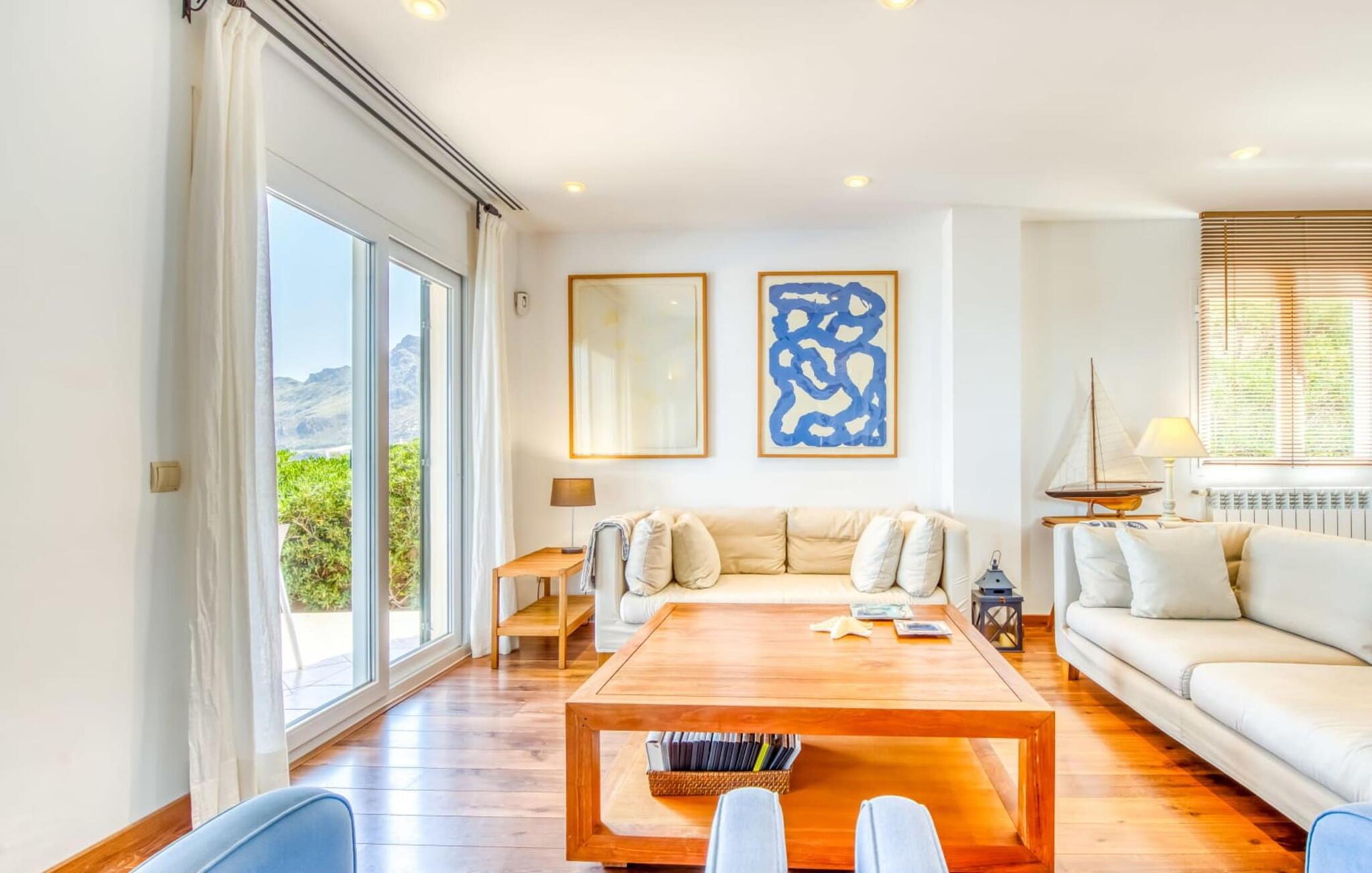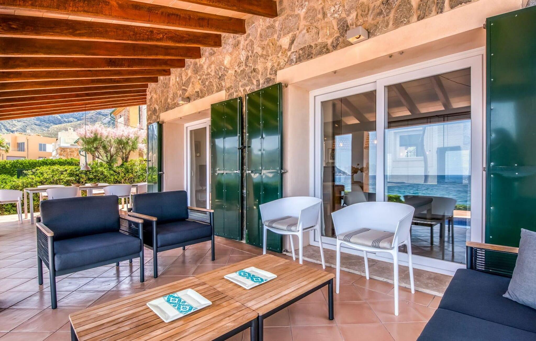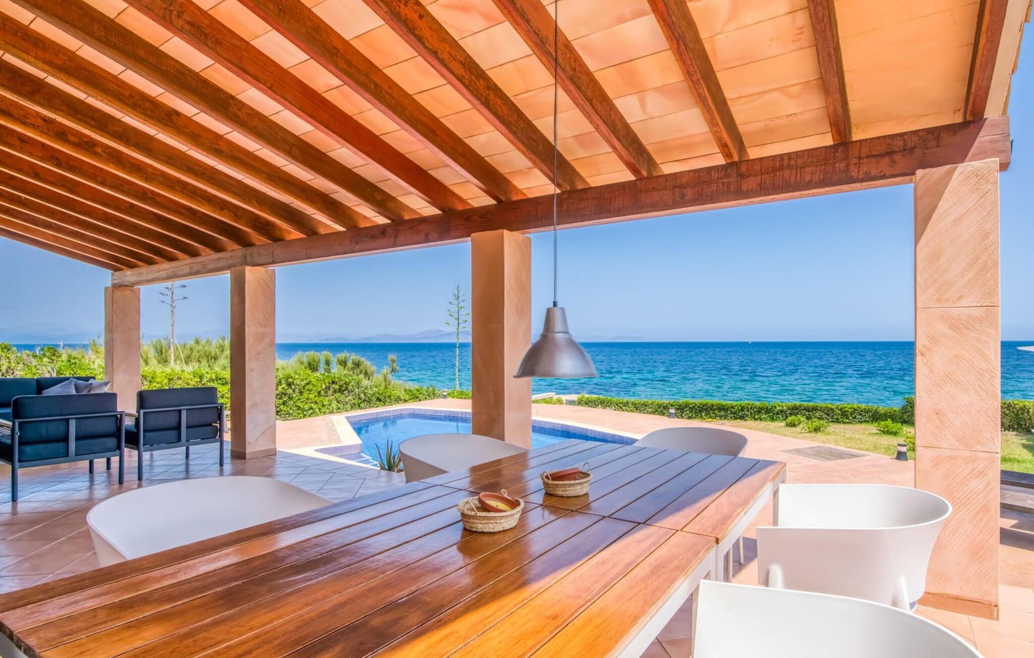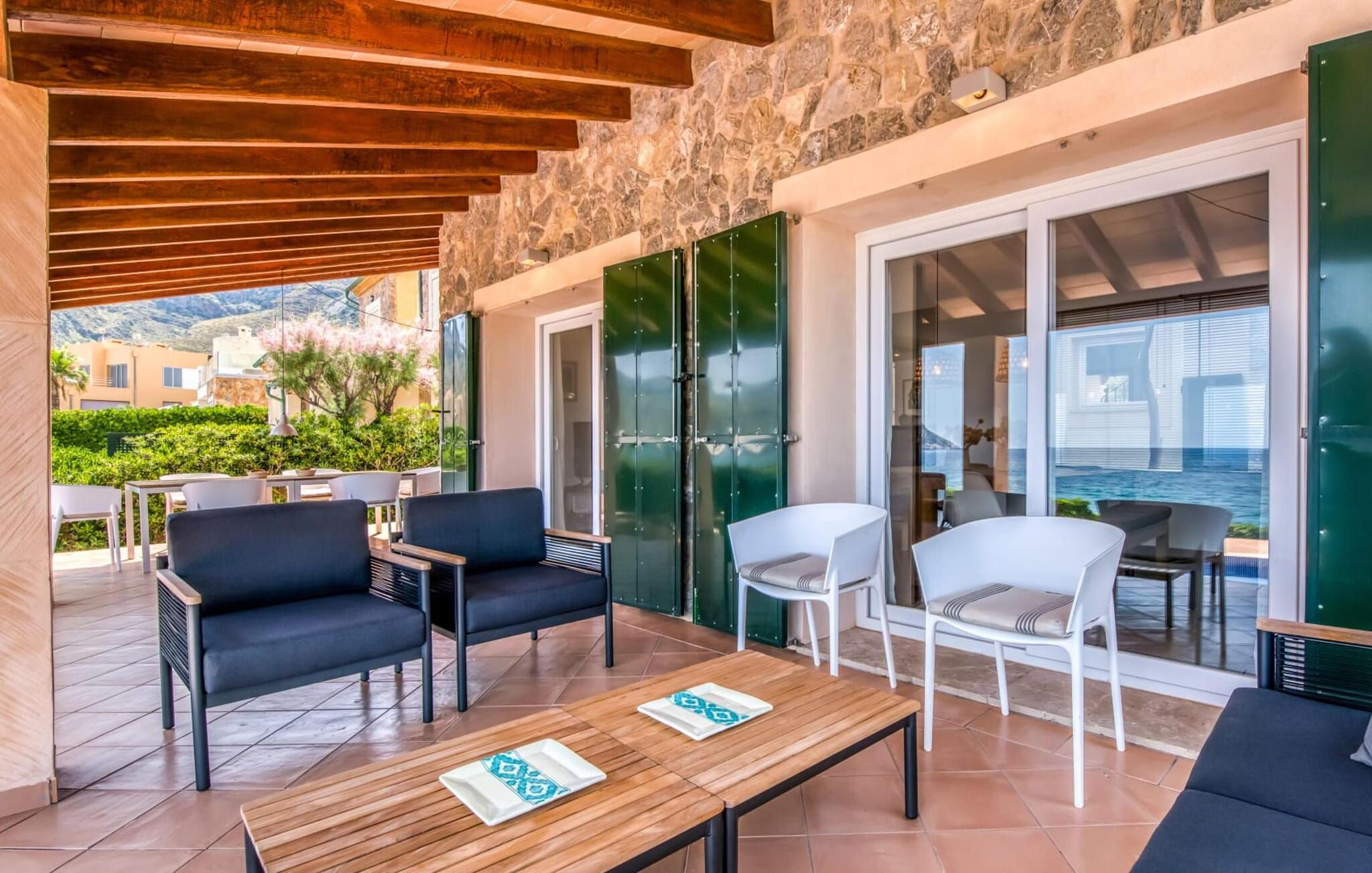 Gönnen Sie sich den faszinierenden Reiz der Ostküste Mallorcas und entscheiden Sie sich für die exquisite Villa „Es Calo“. Genießen Sie den atemberaubenden Meerblick, der Sie erwartet, ergänzt durch die exklusive und ruhige Lage in erster Meereslinie, die auch in der geschäftigen Hochsaison für Ruhe sorgt. Die Villa bietet Platz für bis zu 6 Personen und verfügt über eine kleine Bucht direkt vor der Haustür. Ganz gleich, ob Sie sich am Pool oder auf der gepflegten Wiese in der Sonne sonnen, bei Sonnenaufgang auf einer schattigen Terrasse frühstücken oder bei Sonnenuntergang grillen – der Panoramablick auf die Bucht von Alcúdia bleibt Ihr ständiger Begleiter. Darüber hinaus bietet die Sonnenterrasse im Obergeschoss einen weiteren Ort, an dem Sie den faszinierenden Meerblick genießen können. Auf der Rückseite der Villa bietet eine weitere schattige Terrasse mit Essbereich einen herrlichen Blick auf die Berge, ideal für herrliche Spaziergänge in den kühleren Monaten. Bequeme Parkplätze stehen direkt hinter dem Haus zur Verfügung.