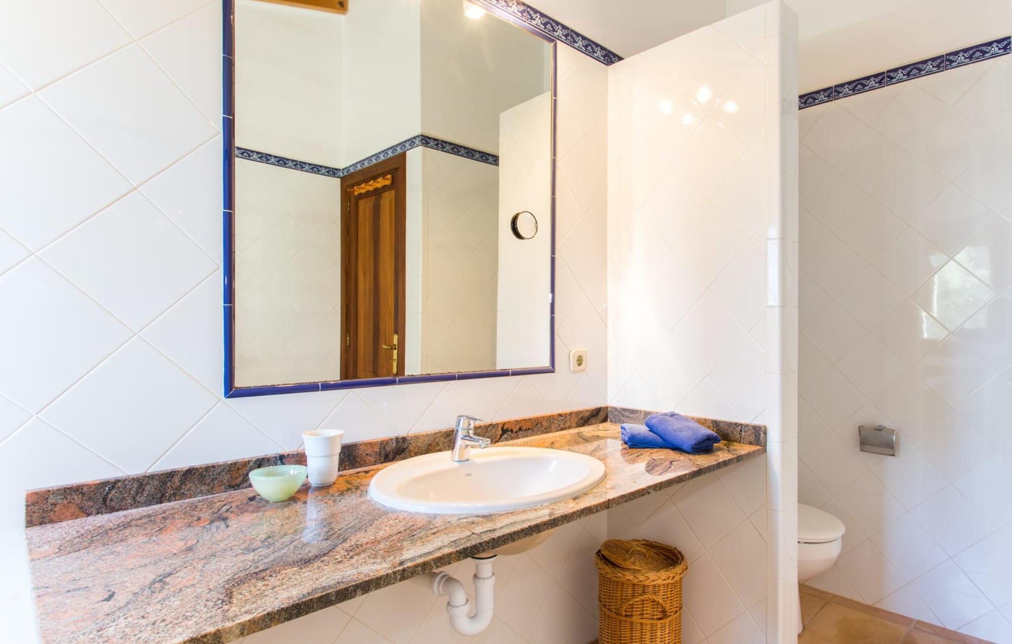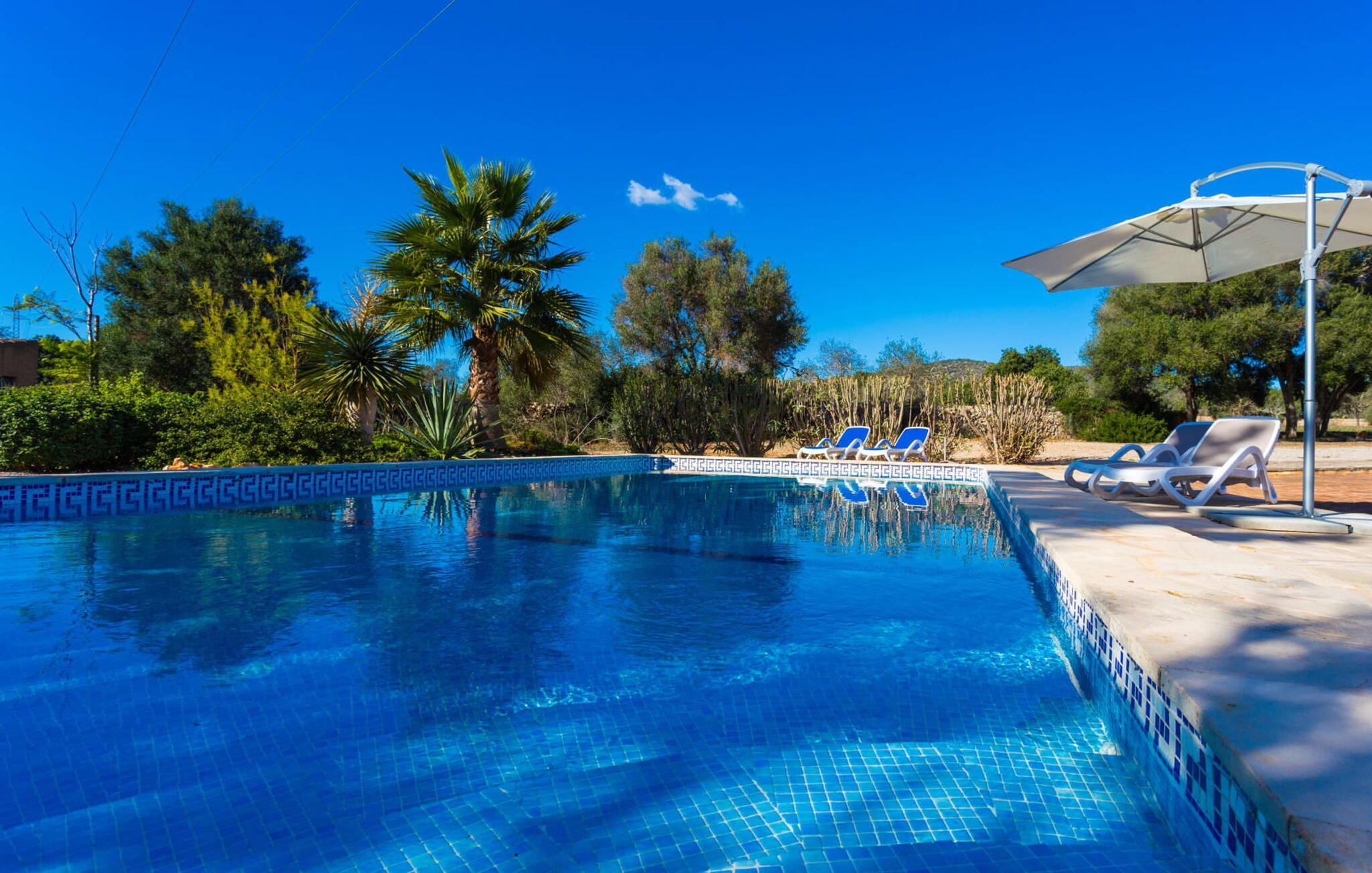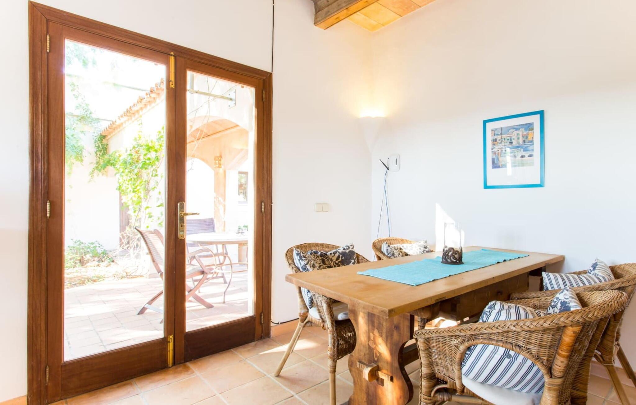Die zu gleichen Teilen schöne und authentische Villa „Es Camp Fora“ befindet sich auf einem 20.500 m² großen Privatgrundstück mit der typischen Vielfalt der lokalen mallorquinischen Vegetation, überwiegend Mandelbäumen. Das große Haupthaus und die kleine Casita liegen unmittelbar nebeneinander: Die Architektur des Haupthauses vereint Authentizität, und die hell geglättete Casita ist fröhlich und frech mit trendigen Fensterläden und behält dabei eine gewisse Anmut. Im Sommer verbringen Sie die meiste Zeit im Außenbereich auf einer der Terrassen. Auf der nordwestlichen Terrasse vor der Casita zum Beispiel, die den natürlichen Schatten eines Pfefferbaums genießt – hier kann man der Hitze trotzen und sich unter dem schönen, massiven Rundbogen an der Treppe zurückziehen und dabei eine gute Lektüre genießen. Der runde Pool ist nie weit entfernt und bietet eine angenehme Erfrischung. Ein paar Schritte vom großen Haus entfernt, inmitten des äußerst schönen und weitläufigen Gartens, liegt der schöne, strahlend blaue Pool, angrenzend an eine Freiluft-Sonnenterrasse mit bequemem seitlichem Treppenzugang. Auf den umliegenden freien Plätzen können Sie bequem auf den vorhandenen Liegen in der Sonne oder im natürlichen Schatten liegen. Abkühlung finden Sie in der reich verzierten Wanddusche neben dem Pool. Von der Poolterrasse führt ein kleiner Weg zur großen Veranda, von wo aus Sie von einem Platz unter freiem Himmel im luftigen Schatten die herrliche Aussicht genießen können. Die breiten, prachtvollen Rundbögen im mit Vegetation bewachsenen Garten versprühen einen etwas magischen Charme. Weitere erstklassige Aussichtspunkte gibt es auf dem Balkon im ersten Stock – idyllische Weitblicke sind hier garantiert!