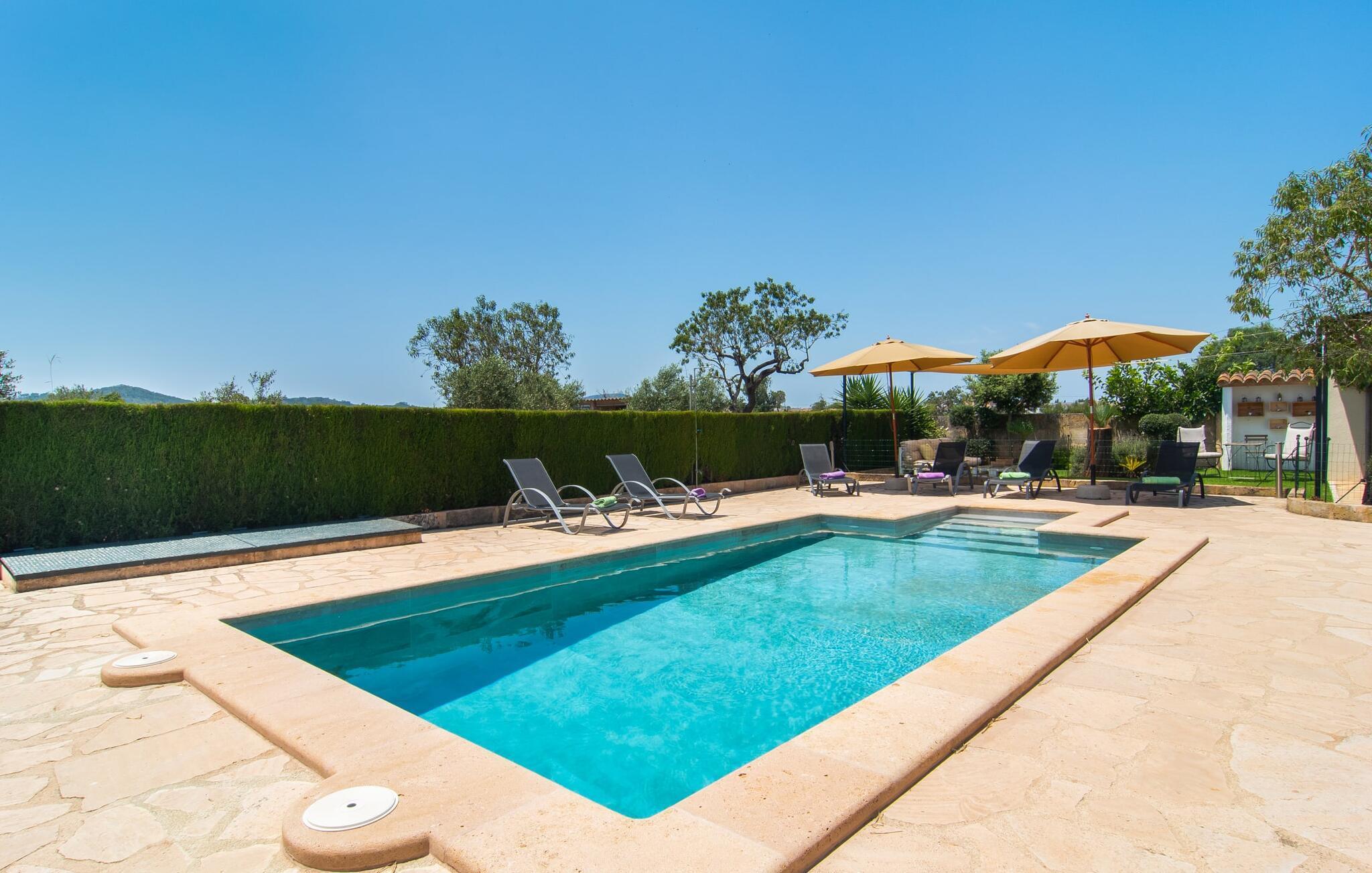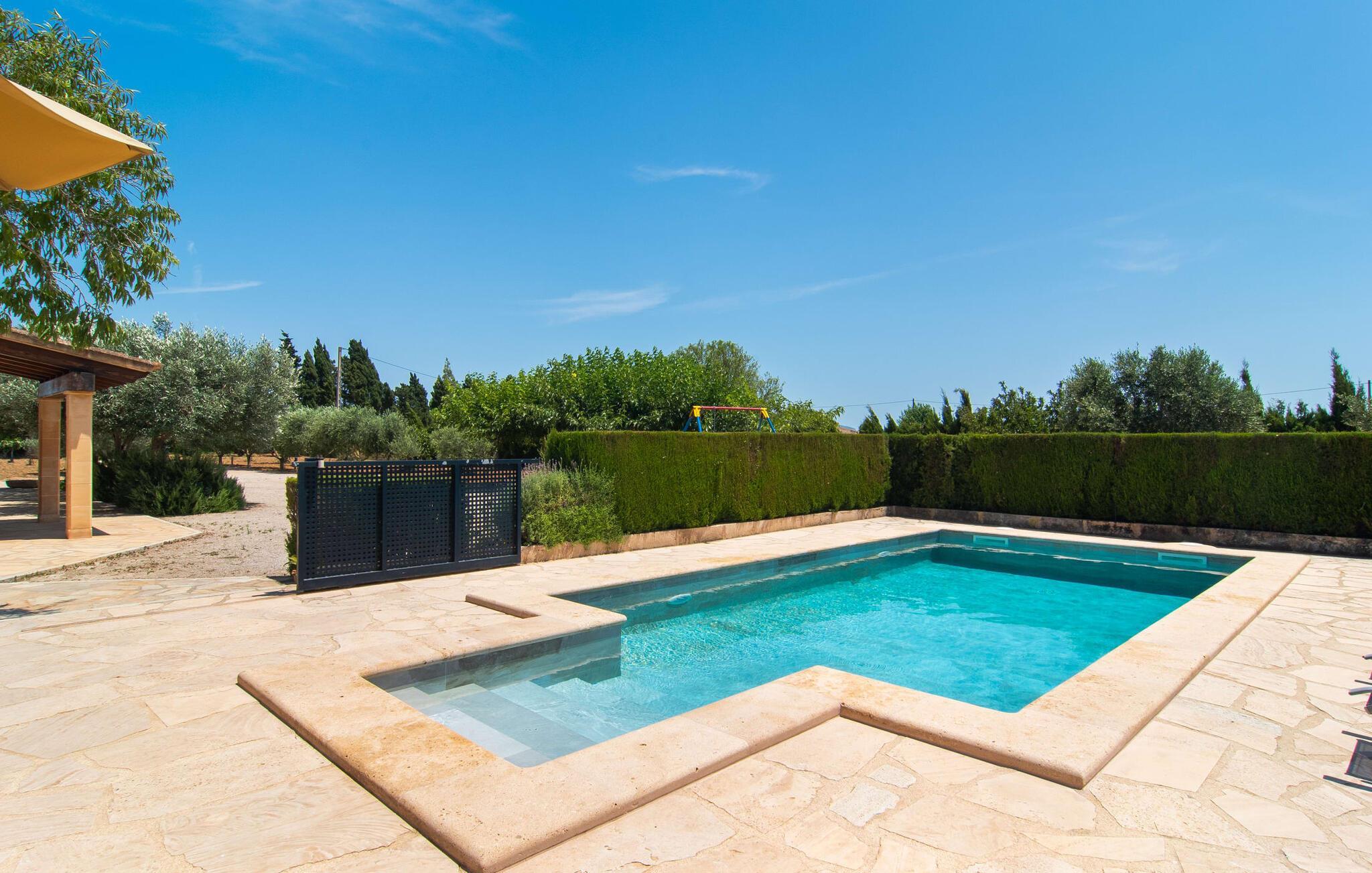 Die familienfreundliche Villa „Es Cipres“ wird Sie mit ihrer hübschen Alleinlage auf einem 9.000 m² großen Grundstück und je nach Jahreszeit üppiger Vegetation begeistern. Eine Vielzahl von Pflanzen, weitläufige Kies- und Terrassenflächen sowie einladende Nischen zum Verweilen verleihen dieser Immobilie einen individuellen Charme. Das Raumgefühl wird hier eindrucksvoll und unmittelbar erlebbar. Durch die Überdachung des Hauses haben Sie die Möglichkeit, sich ganz nach Ihren Vorlieben in der Sonne oder im luftigen Schatten auf eine Vielzahl wunderbarer Plätze zum Entspannen zu freuen. Bequeme Sonnenliegen laden zum Entspannen und Verweilen ein, ebenso wie die geschmackvollen Sitzecken, wo Sie gemeinsam speisen können. Hier können Sie beim Frühstück den freien Blick auf den tiefblauen Morgenhimmel genießen oder einen weiteren erfüllten Urlaubstag bei abendlicher Atmosphäre gemütlich ausklingen lassen. Der Pool im rechten Winkel zur Villa ist mit einem Zaun für Kinder gesichert. Der Pool ist mit hübschen Mosaiksteinen gefliest und variiert in der Tiefe zwischen 1 m und 1,90 m. Für alle Sonnenanbeter stehen sechs bequeme Sonnenliegen zur Verfügung und zum Schutz vor grellen UV-Strahlen gibt es zwei Sonnenschirme. Ein weiterer herrlicher Außensitzbereich befindet sich im Obergeschoss, wo ein großzügiger Balkon eine idyllische Aussicht bietet. Verschiedene Kinderspielgeräte machen den Aufenthalt im Freien für unsere kleinen Gäste noch attraktiver.