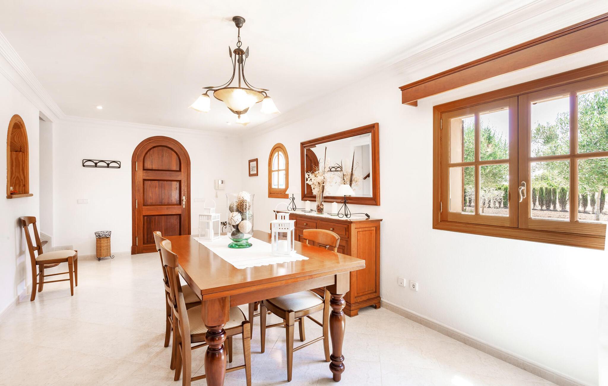 Das Innere der Villa ist geschmackvoll eingerichtet. Helle Wände, Decken und Böden werden hier mit viel Holz und hübscher Beleuchtung kombiniert. Geschmackvolle Accessoires wurden im richtigen Verhältnis eingesetzt, so dass das natürliche Raumgefühl seine klare Linienführung und Eleganz behält. Verschiedene Bögen sorgen für eine wesentliche Harmonie des Anwesens. Den Mittelpunkt des Hauses bildet das offene kombinierte Wohn-/Esszimmer, das über einen breiten Flur zugänglich ist und sowohl eine riesige Essgruppe als auch ein hell gestaltetes Ecksofa mit Sat-TV enthält. An kühleren Abenden können Sie hier beim gemütlichen Schein des Kamins und der Wärme eines Feuers entspannen. Ein weiterer Essbereich befindet sich in der geräumigen und stilvollen Küche, die komplett ausgestattet ist und dem Gast einen Kühlschrank, Backofen, Gasherd, Geschirrspüler, Melitta-Kaffeemaschine, Wasserkocher und ausreichend Stauraum bietet. Auch hier wurde ein Kamin installiert, der für zusätzliche Gemütlichkeit sorgt. Schön gestaltete Schlafzimmer mit individueller Note laden zu einem erholsamen Schlaf ein. Angenehme Farben kombiniert mit eleganten Möbeln schaffen eine gemütliche Atmosphäre. Die geräumigen Badezimmer sind geschmackvoll gestaltet und mit hochwertigen Armaturen ausgestattet. Ein Bügeleisen und ein Haartrockner sind im Haus vorhanden, sodass Sie diese nicht mitbringen müssen.