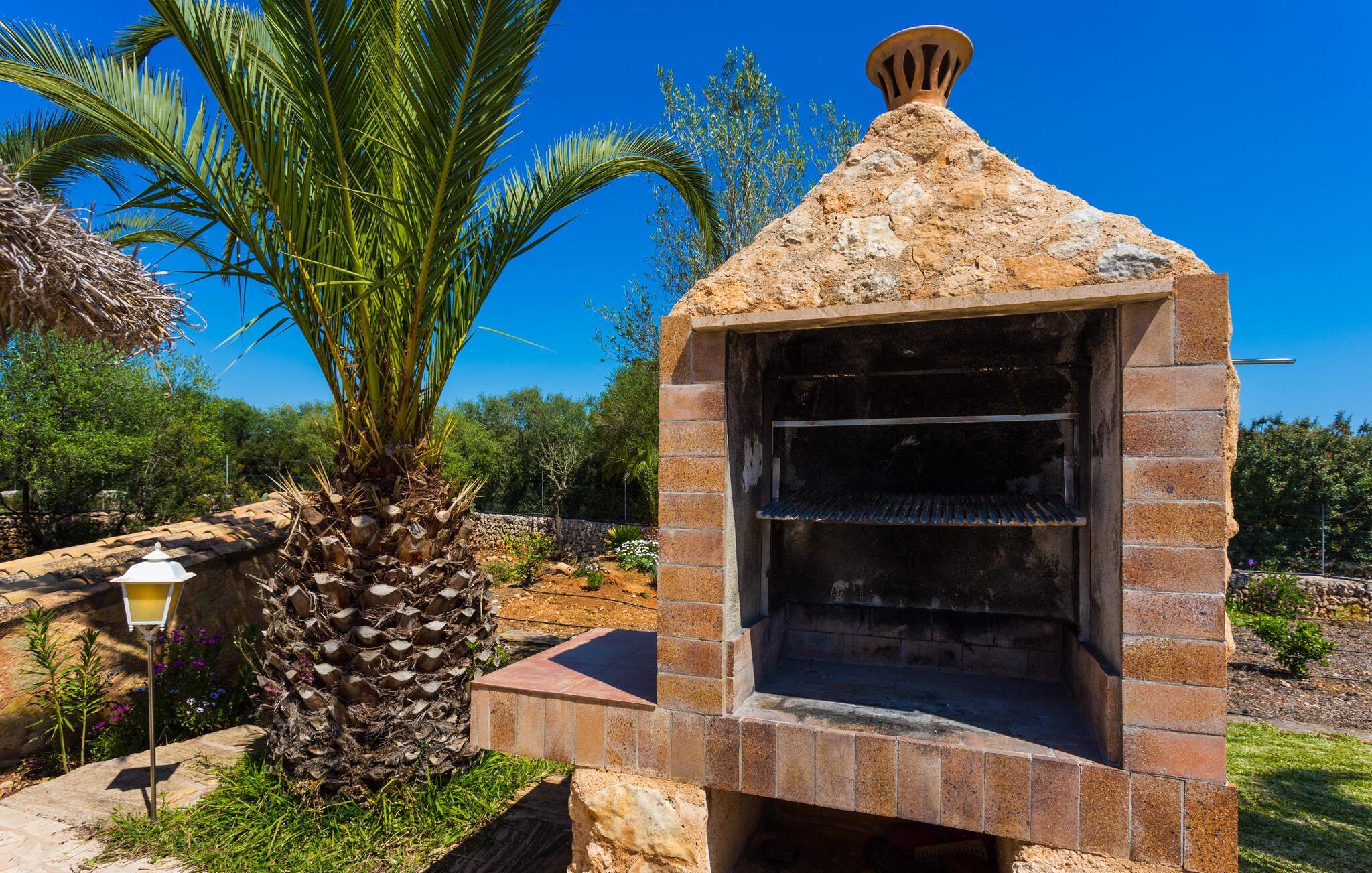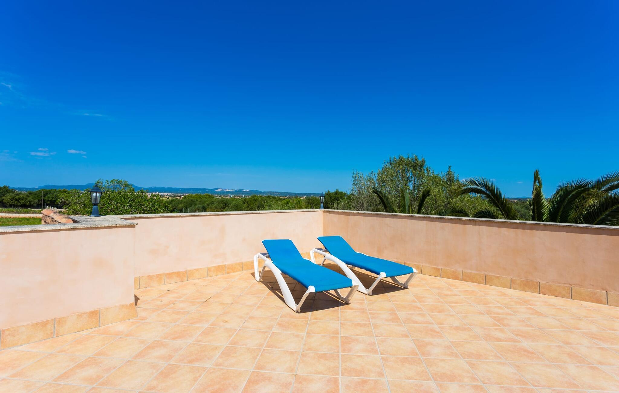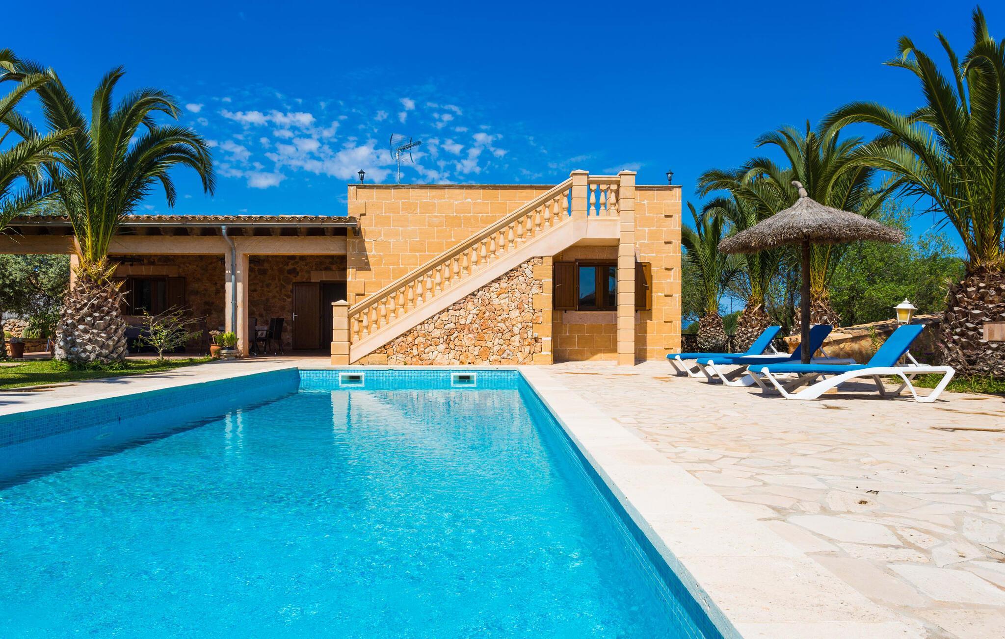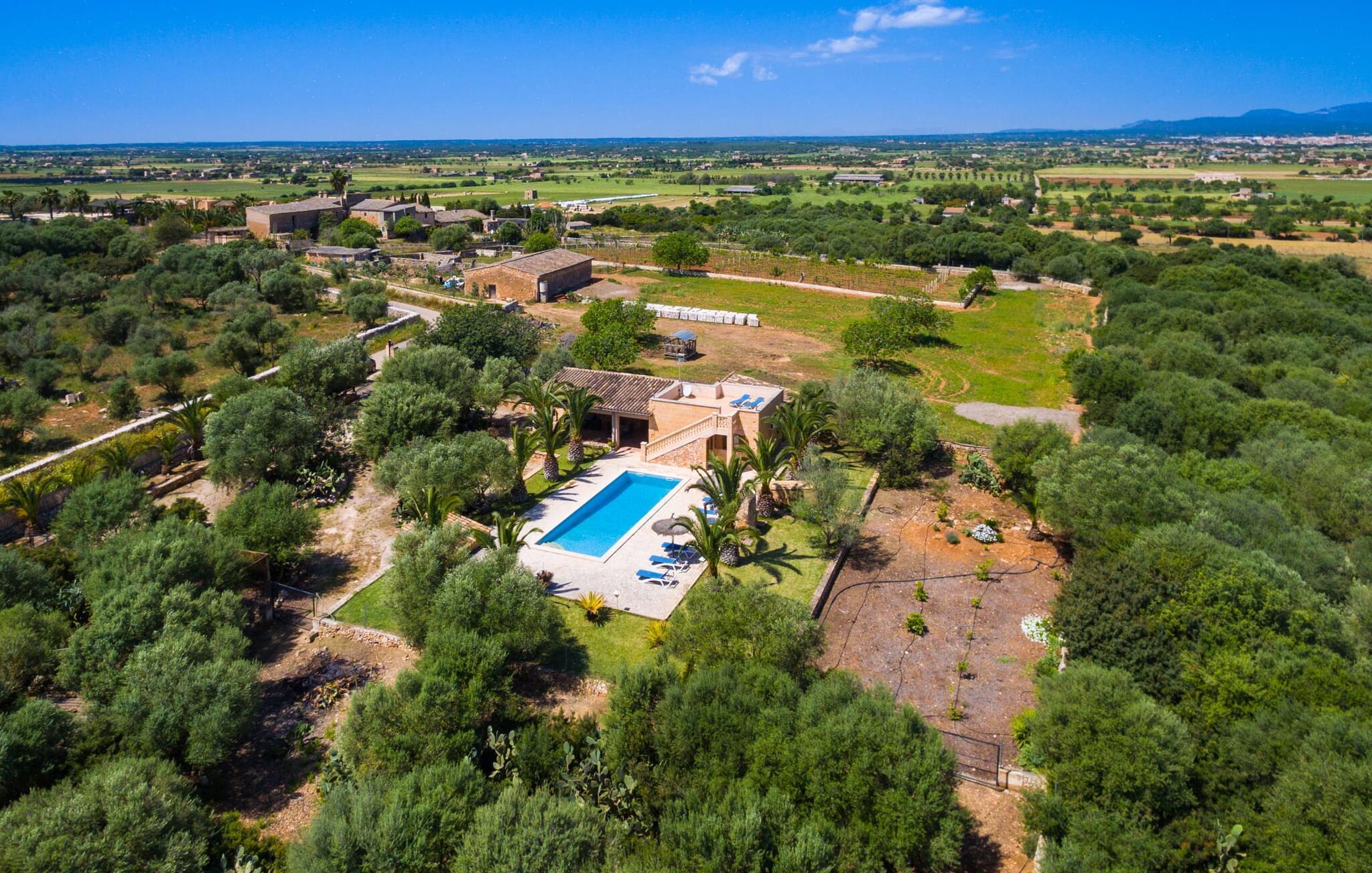 Herrliche Landschaft, weite Ausblicke auf das Tramuntana-Gebirge, Felder und Wälder – wir befinden uns im Süden der Insel und besuchen die Villa „Es Estadors“ vor dieser weitläufigen, wunderschönen Kulisse. Der Garten verleiht allem ein karibisches Flair, das auch am Traumstrand von Es Trenc zu finden ist; Der mit blauen Mosaikfliesen dekorierte Swimmingpool verfügt über eine umlaufende Sonnenterrasse und ist von Palmen gesäumt. Wenn Sie auf den bequemen Sonnenliegen ein gutes Buch lesen oder einfach nur beim sanften Rauschen der Palmenzweige die Seele baumeln lassen möchten, spenden Ihnen die zur Verfügung stehenden Bambusschirme angenehmen Schatten. Entdecken Sie den eingebauten Grill neben dem alten Brunnen. Speisen Sie im Schatten der überdachten Terrasse am runden Glastisch mit trendigen Stühlen aus synthetischem Rattan. Ein weiterer gemütlicher Ort ist der Lounge-Bereich – und das nicht nur, um den Tag in der rustikalen Atmosphäre mit freiliegenden Steinwänden und antiken Kutschenrädern entspannt ausklingen zu lassen. Alternativ gibt es eine Dachterrasse, die von außen über eine Außentreppe erreichbar ist. Von hier aus können Sie die Sterne beobachten und dabei den Grillen lauschen, bis Sie eine angenehme Schläfrigkeit überkommt.