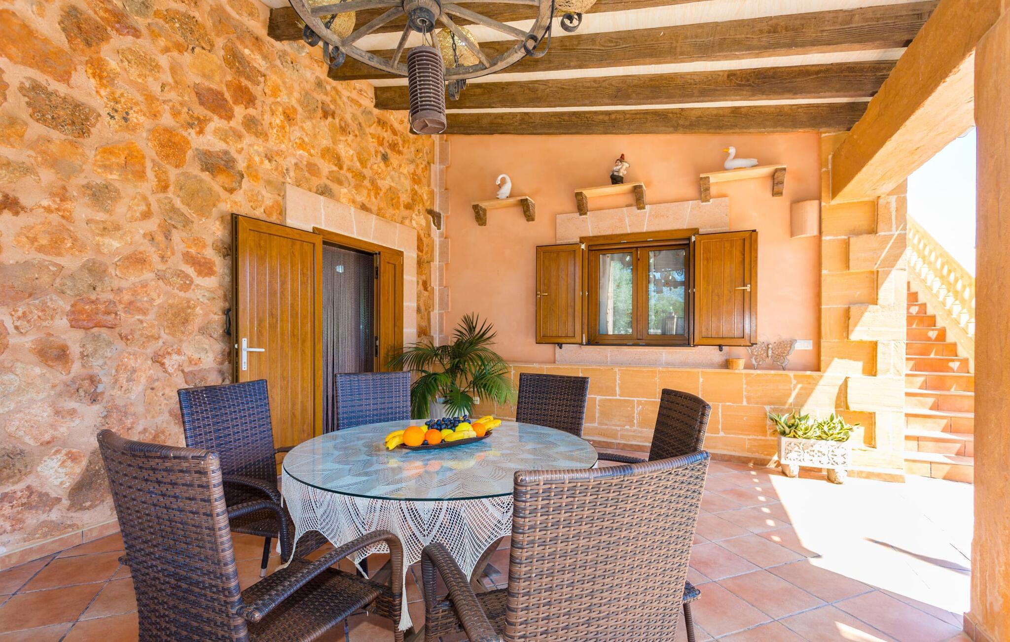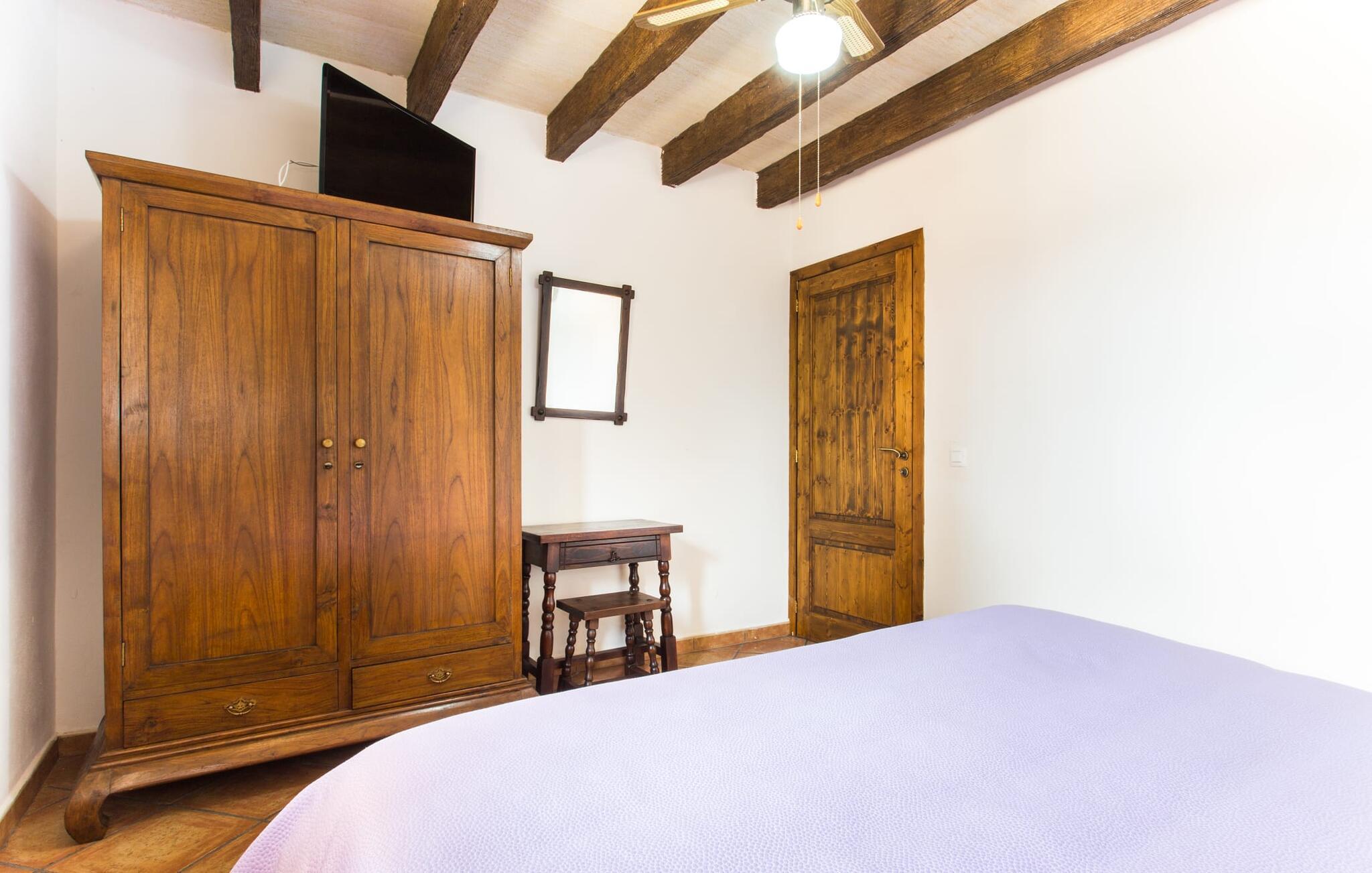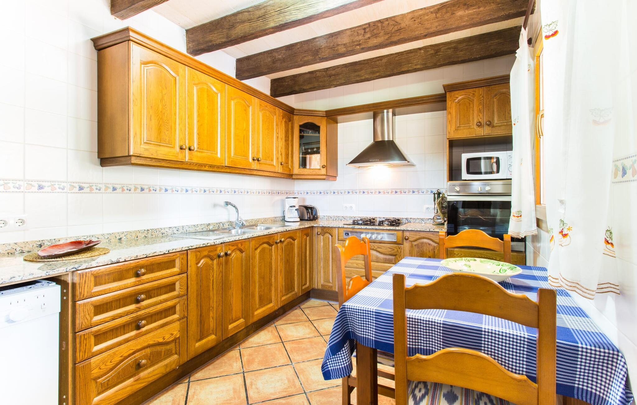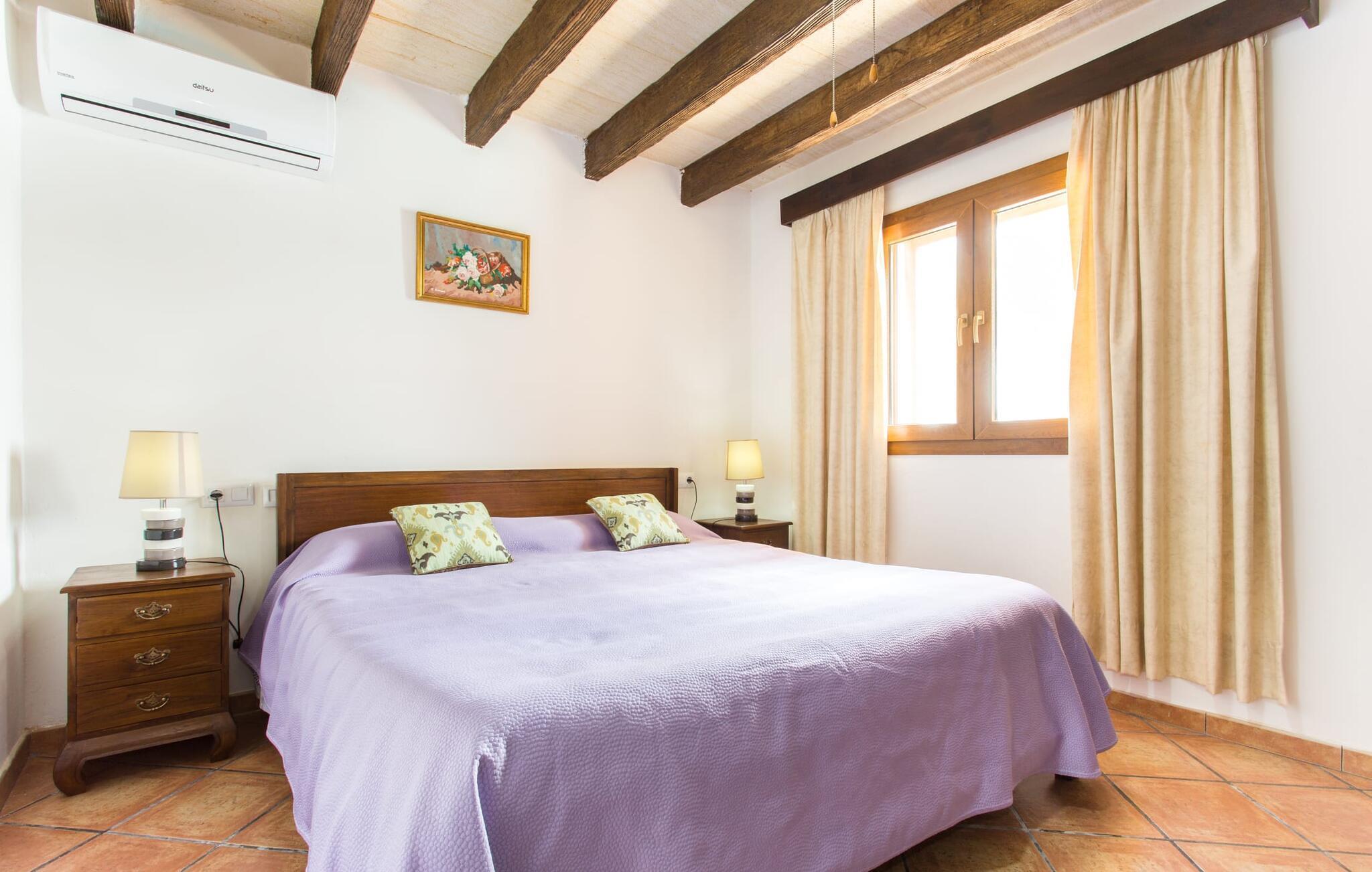 Auch in den klimatisierten Schlafzimmern finden Sie die Ruhe, die Sie in Ihrer Auszeit vom Alltag erwarten. Der Stil der Einrichtung und Ausstattung mit antiken Betten aus gedrechseltem Holz und weiteren gemütlichen Elementen vermittelt das Gefühl eines Urlaubs auf dem Bauernhof. Gleichzeitig bieten die Zimmer auch den modernen Luxus eines Flachbildfernsehers als Kontrast zum rustikalen Charme vergangener Zeiten. Bodengleiche begehbare Duschen – in insgesamt zwei Badezimmern – komplettieren den Komfort, den eine Familie oder eine kleine Gruppe von Freunden hier finden kann. Auch das Wohnzimmer mit integriertem Essbereich versprüht einen typisch mallorquinischen Charme. Die großen Polstermöbel mit Blumenmuster ergänzen die naturalistischen Wandgemälde, die idyllische ländliche Szenen darstellen. Ein angenehm sanfter Hauch von „Kitsch“ ist in diesem schönen Anwesen vorhanden, was dem Wohlbefinden des Gastes besonders zugute kommt. Die rustikale Landhausküche ist komplett mit modernen Annehmlichkeiten ausgestattet – ein wichtiges Merkmal für Urlauber, die sich für die Selbstversorgung entscheiden. Gestatten Sie uns einen kleinen Tipp: Aufgrund der Zentralheizung ist diese wunderbar legere Villa das ganze Jahr über buchbar; Und gerade in der Nebensaison, wenn das Klima auf Mallorca noch sehr angenehm ist, kann es zu sehr günstigen Preisen reserviert werden.