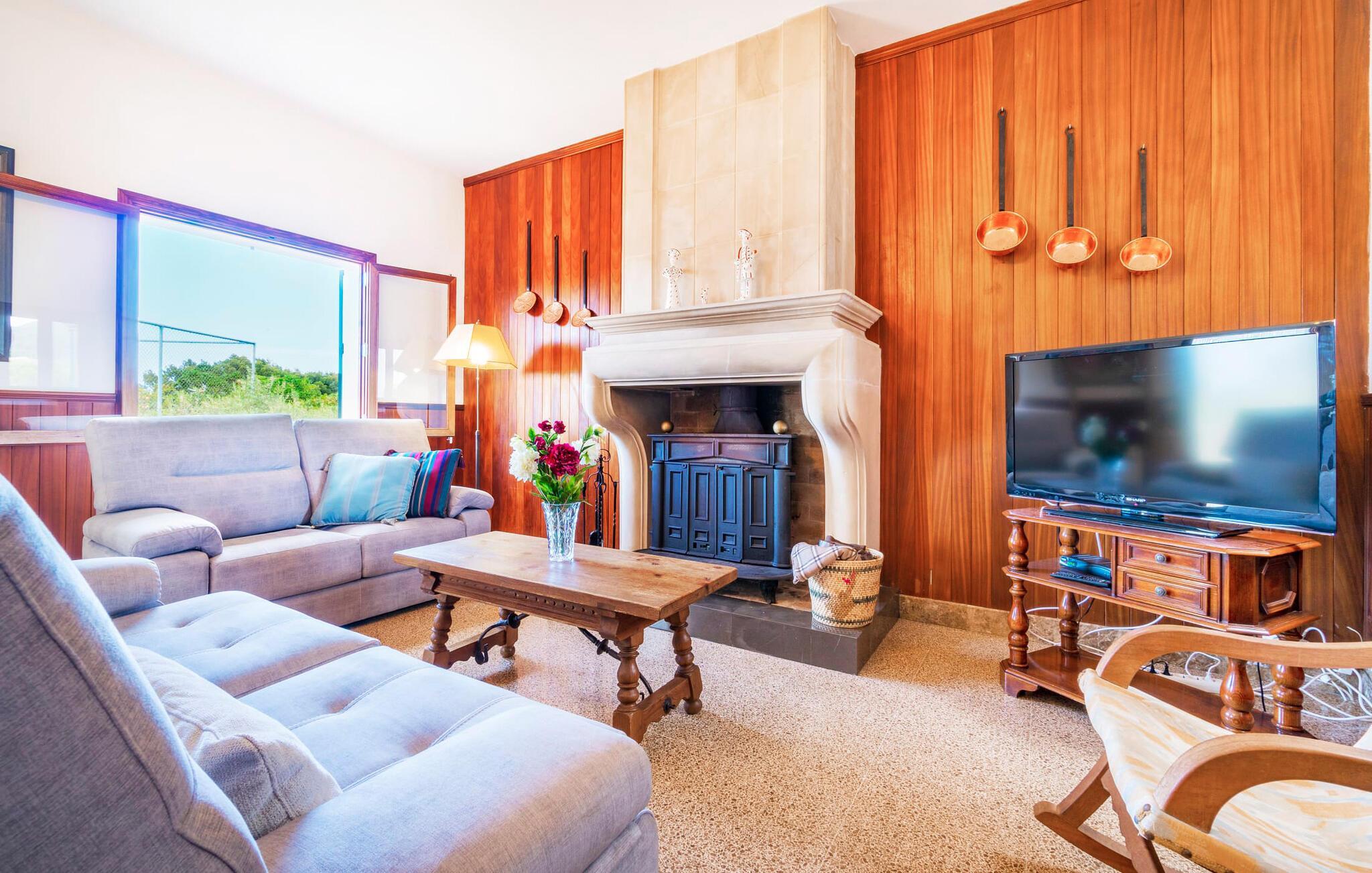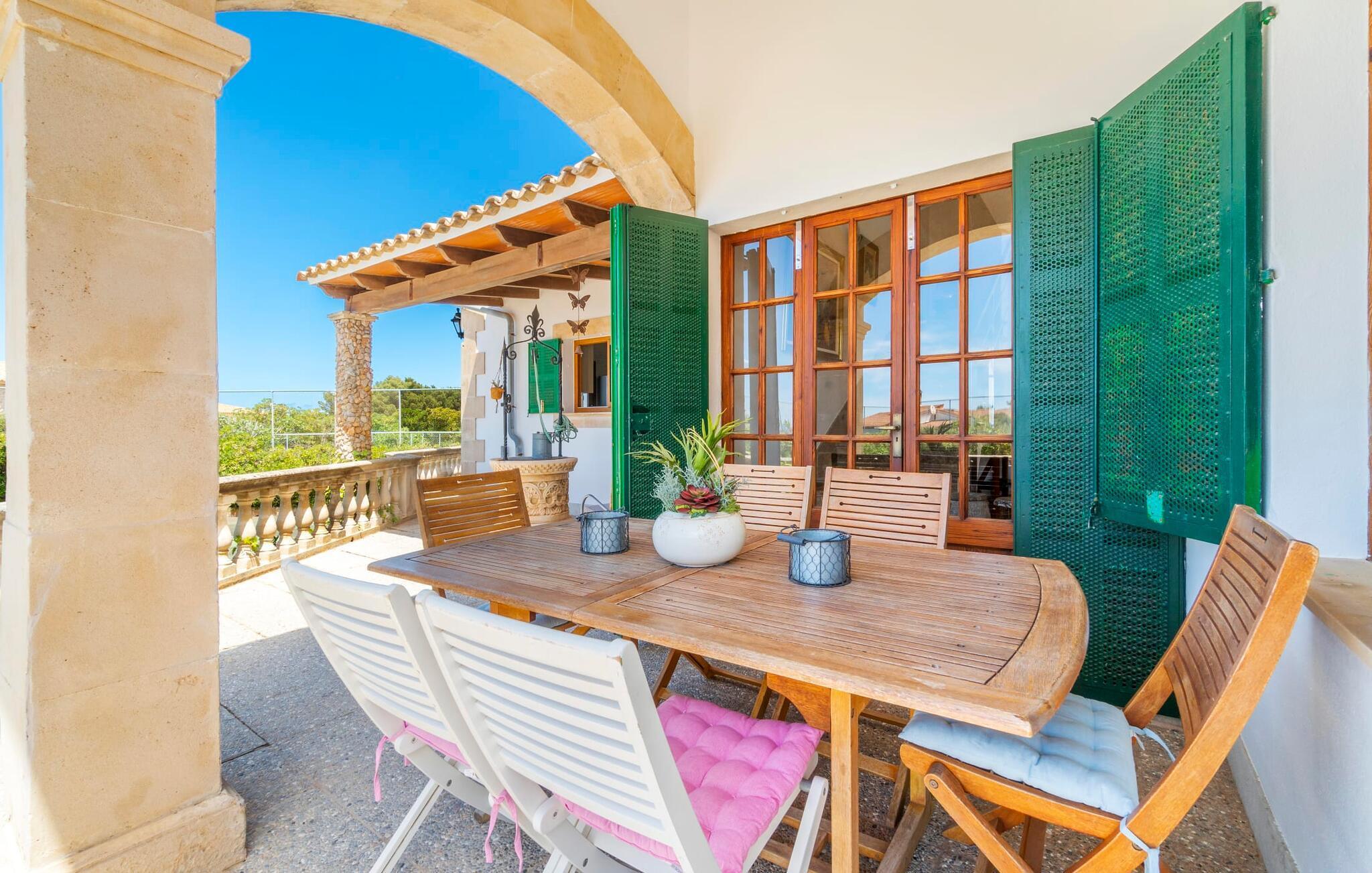 Die Villa „Es Ferrutx“ hat einiges zu bieten: Das klassische Ferienhaus aus Sand und Naturstein mit den hübschen grünen Holzfensterläden punktet vor allem mit seiner tollen Lage auf Mallorca. Es steht auf einem großzügigen Grundstück in einem typischen Wohngebiet der Urbanisation Montferrutx am Rande von Colònia de Sant Pere. Obwohl Sie von Nachbarn umgeben sind, können Sie dank der Abschirmung aus dicht gewachsenen Hecken und weiß gestrichenen Wänden dennoch Ihre Privatsphäre in vollen Zügen genießen. Verschiedene Terrassenbereiche, teils umschlossen von dekorativen Steingeländern, teils sonnig, teils schattig und mit bequemen Sitzmöbeln ausgestattet, laden rund um das Ferienhaus bis zu acht Personen zum gemütlichen Beisammensitzen ein. Für Abkühlung sorgt der große, flache Pool. Aber nicht nur im Wasser kann man Sport treiben. Spannende Matches können Sie auch an der Tischtennisplatte und auf dem privaten Tennisplatz austragen. Einen Mietwagen können Sie in der Garage abstellen, am Haus sind weitere Parkplätze vorhanden.