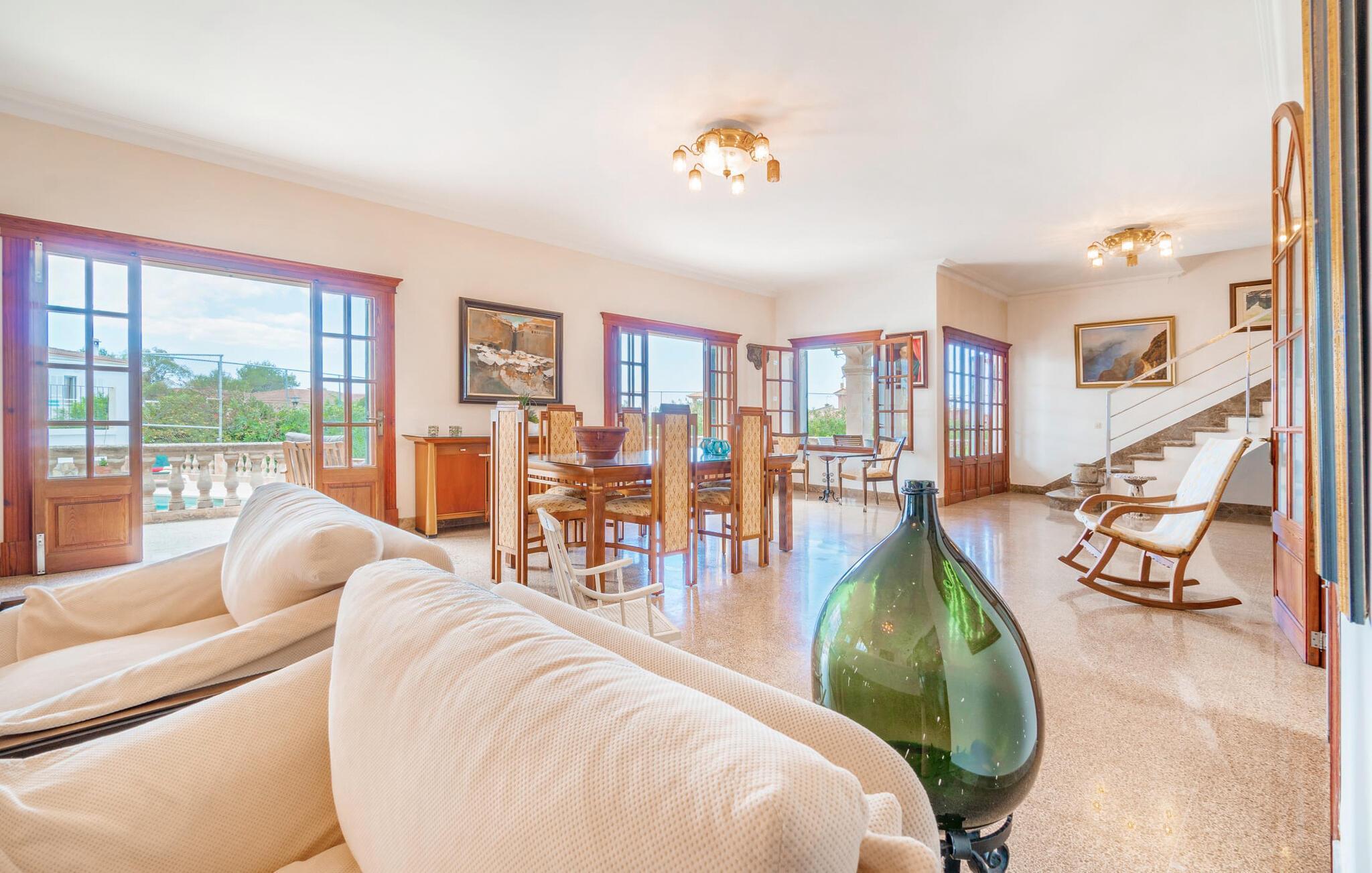 Das Interieur von „Es Ferrutx“ ist klassisch elegant. Das Ferienhaus ist – typisch für das traditionelle Mallorca – mit vielen schönen alten Möbelstücken ausgestattet, von denen einige aufwendig geschnitzt sind. Glänzende Fliesenböden, helle Wände und verschiedene Holzelemente wie Täfelungen und Türrahmen sind perfekt aufeinander abgestimmt. Als angenehmen Kontrast dazu finden sich an den Wänden teilweise moderne, farbenfrohe Gemälde. Das Haus ist sehr geräumig, so dass jeder seinen Lieblingsplatz findet und man sich – besonders wenn viele Mitreisende da sind – auch mal zurückziehen kann. Im Erdgeschoss befinden sich neben dem herrschaftlichen Eingangsbereich und der gut ausgestatteten Küche zwei große Wohnzimmer mit jeweils eigenem Essbereich. Vier liebevoll eingerichtete Schlafzimmer, drei davon mit modernen Bädern en Suite und eines mit separatem Bad, runden das Wohnangebot auf dieser Ebene ab. Eine Marmortreppe führt in die obere Etage, wo sich ein weiteres Schlafzimmer mit Bad befindet.