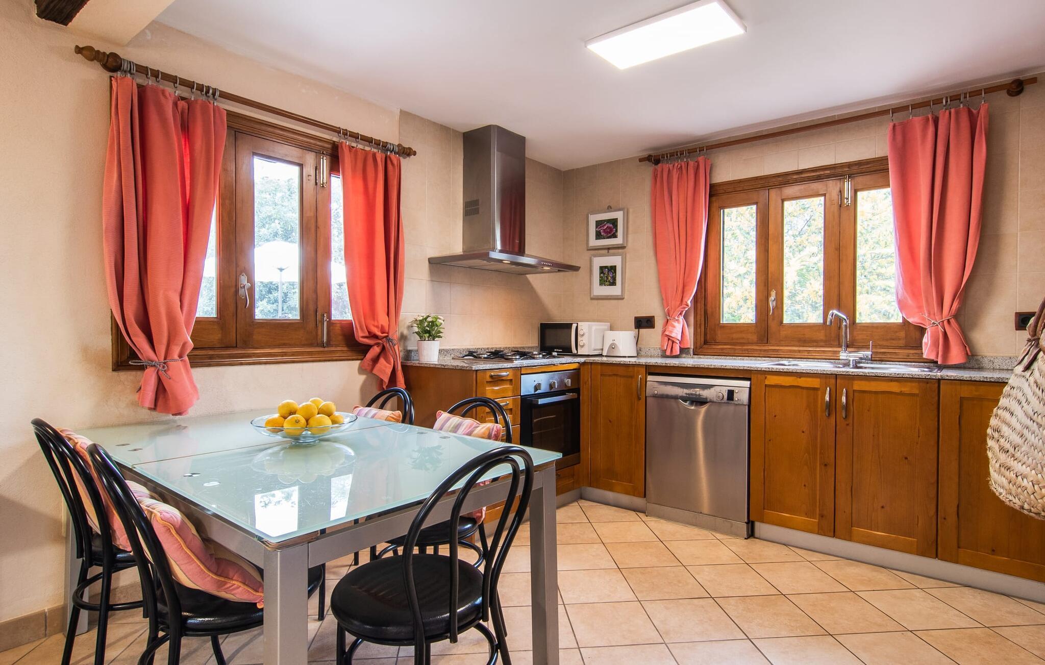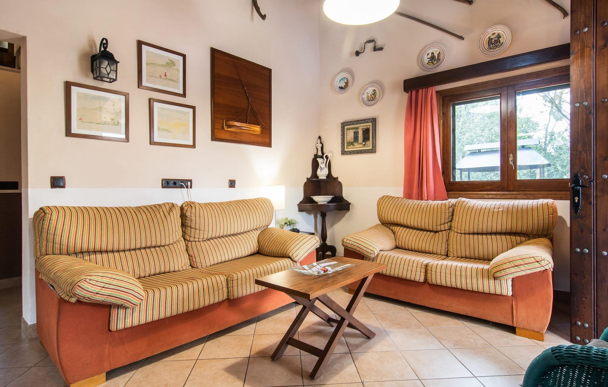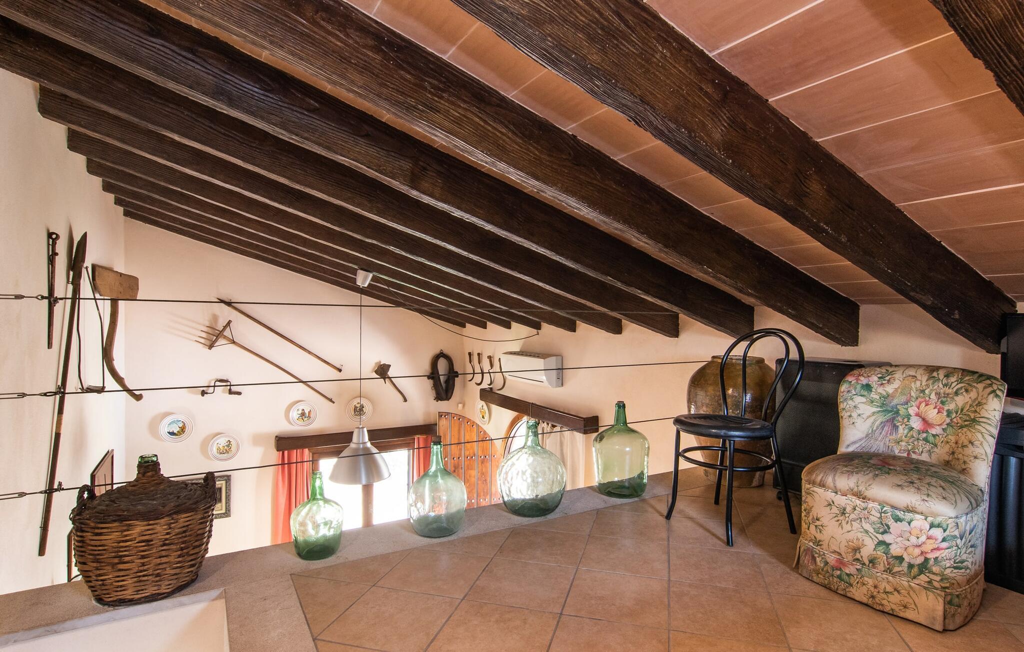 Das rustikale Hausinterieur hat einen angenehm unkomplizierten Charakter und zeichnet sich durch ein hohes Maß an Gemütlichkeit aus. Terrakottafliesen, Holz und vielfältige Dekorationen, teilweise antik, verleihen dem Interieur eine zusätzliche individuelle Note. Das offene Wohn- und Esszimmer ist ein großartiger Ort zum Entspannen oder Essen im Innenbereich. Satellitenfernsehen und WLAN-Internet stellen eine zeitgemäße Medienanbindung dar. Die offen integrierte Küche bietet alles, was Sie zur Selbstversorgung im Urlaub benötigen. Zwei gemütliche Doppelzimmer bieten Platz für erholsamen Schlaf oder eine Siesta tagsüber. Ein Badezimmer mit Duschbadewanne und Tageslicht rundet das Zimmerangebot in diesem ruhigen Bauernhaus auf Mallorca ab.