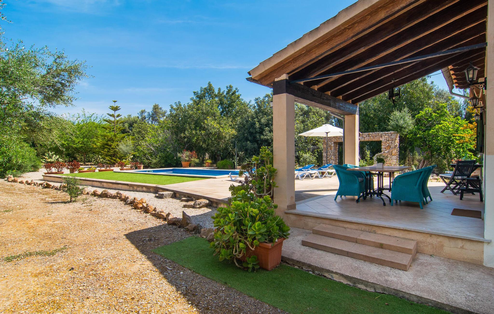 Das kleine Bauernhaus „Es Garroveret“ bietet einen mallorquinischen Urlaub in absoluter Ruhe. Die überdachte Terrasse ist nicht nur herrlich ruhig und gemütlich, sondern bietet auch einen fantastischen Blick in Richtung des Tramuntana-Gebirges.