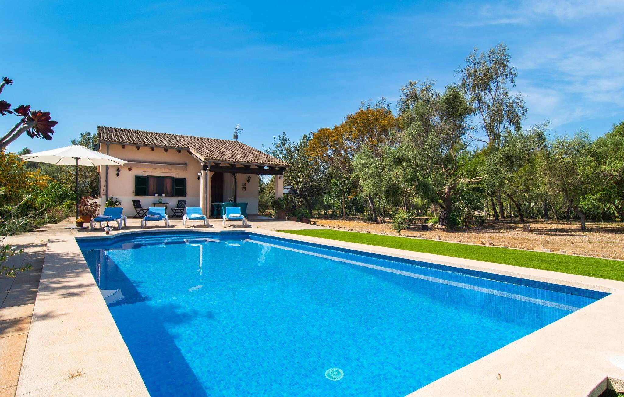 Nur wenige Meter entfernt befindet sich das 8 Meter lange Becken, das bequem über eine römische Treppe erreichbar ist. Umgeben ist es von einer Sonnenterrasse, auf der bequeme Liegestühle zum Entspannen unter Mallorcas Himmel einladen. Üppige mediterrane Vegetation umrahmt das Areal dekorativ und unterstreicht die private Atmosphäre dieses Domizils. Der mobile Grill lädt abends dazu ein, die gesellige Runde bei einem zünftigen Barbecue zu zelebrieren.