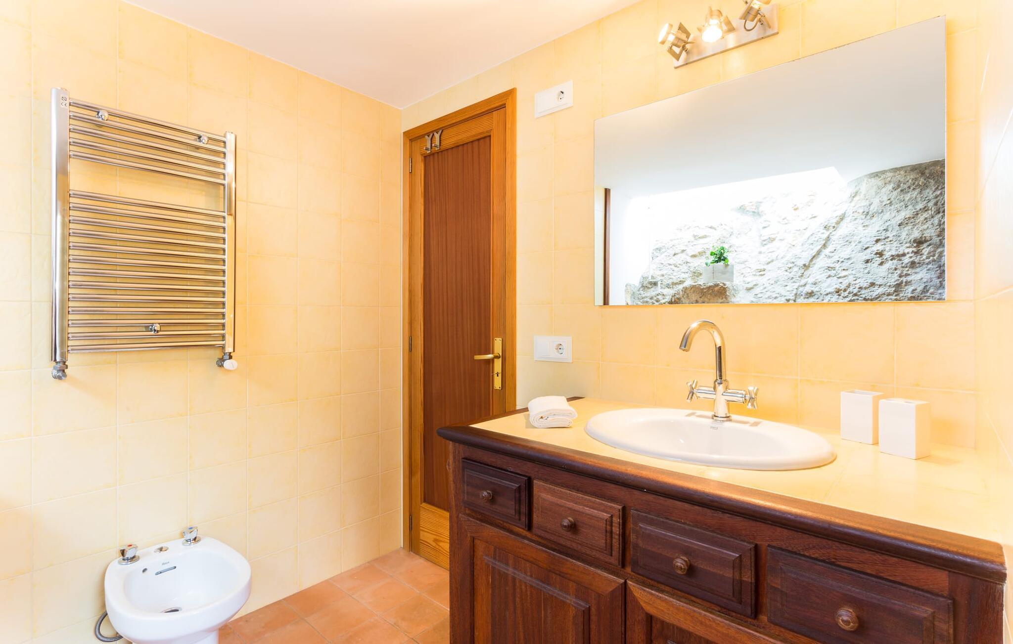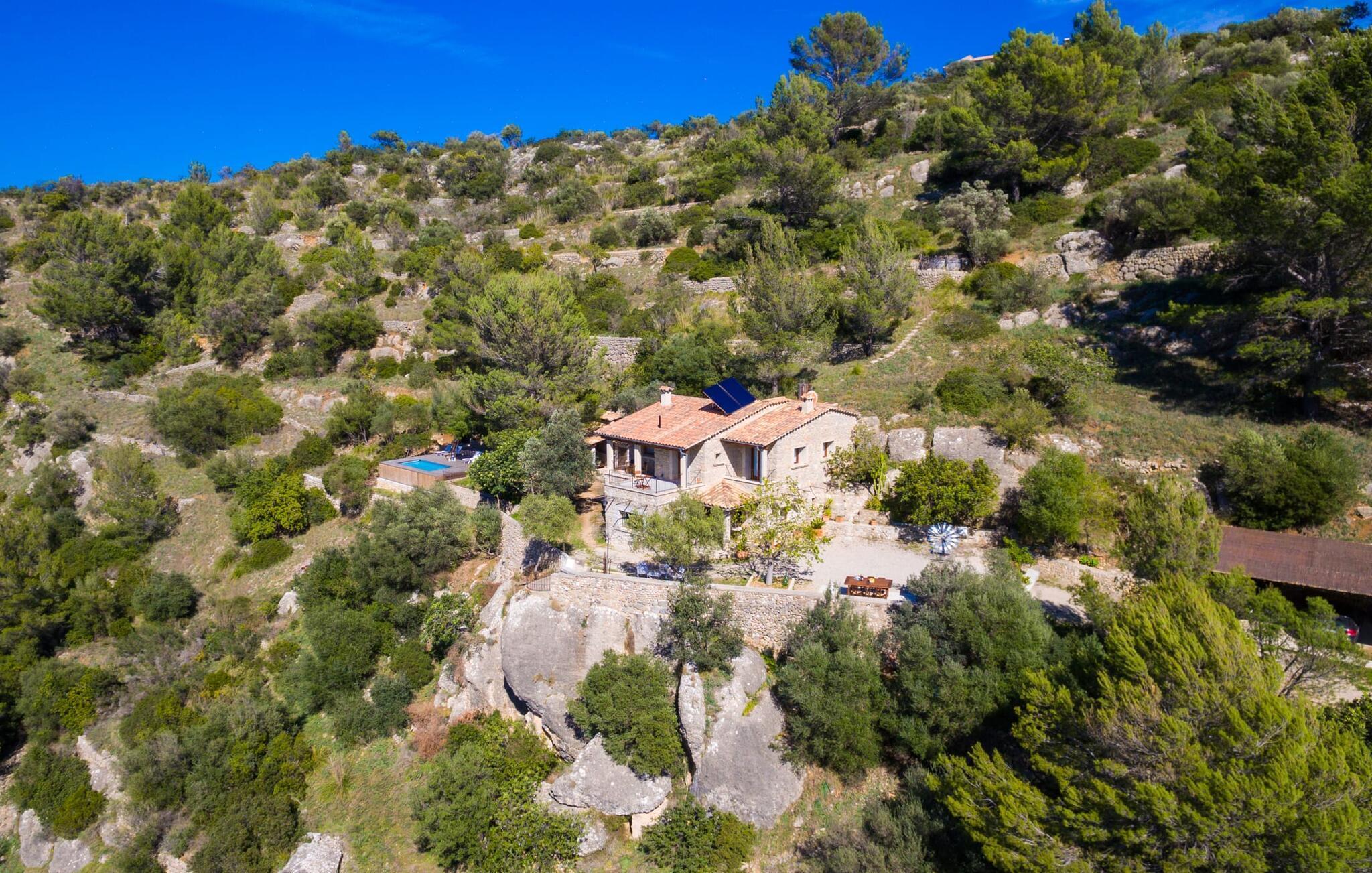 Die ländliche Villa „Es Guerol“ mit kleiner Einkehrmöglichkeit ist ein besonderes Anwesen für Familien, Naturliebhaber und ruhesuchende Wanderer. An einem ursprünglicheren Ort als in diesem Naturschutzgebiet kann man auf Mallorca kaum leben. Die alte Villa wurde von ihren Besitzern, die dort lange Zeit selbst lebten, liebevoll restauriert, ohne ihr das Ambiente zu nehmen, aber mit neuen Attributen wie einem kleinen Pool inmitten einer Holzterrasse. Das Haus liegt auf einem Berg, Sie müssen also mit einem steilen Zustieg rechnen und ist in den Berg hineingebaut, so dass Sie von der Terrasse und vom Balkon aus einen fantastischen Panoramablick auf das Tramuntana-Gebirge haben. Wenn Sie hier keine Kraft tanken können ... Lehnen Sie sich bequem an eine warme Ziegelwand zurück, lassen Sie Ihren Blick und Ihre Gedanken von Ihren Sonnenliegen am Pool aus in die Ferne schweifen, heizen Sie die großzügige Grillecke ein und decken Sie den Tisch daneben altes Windrad – Naturgenuss pur.