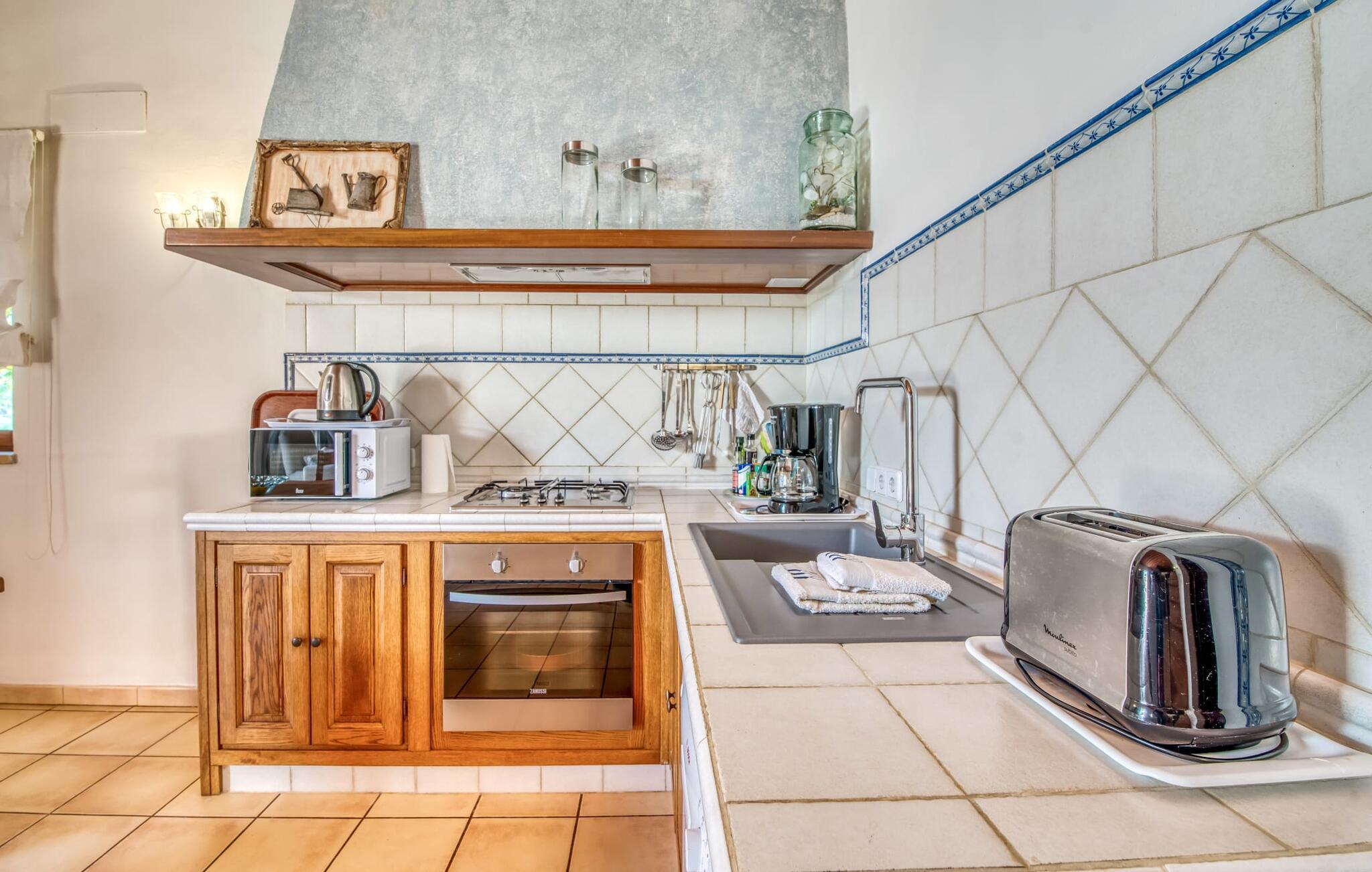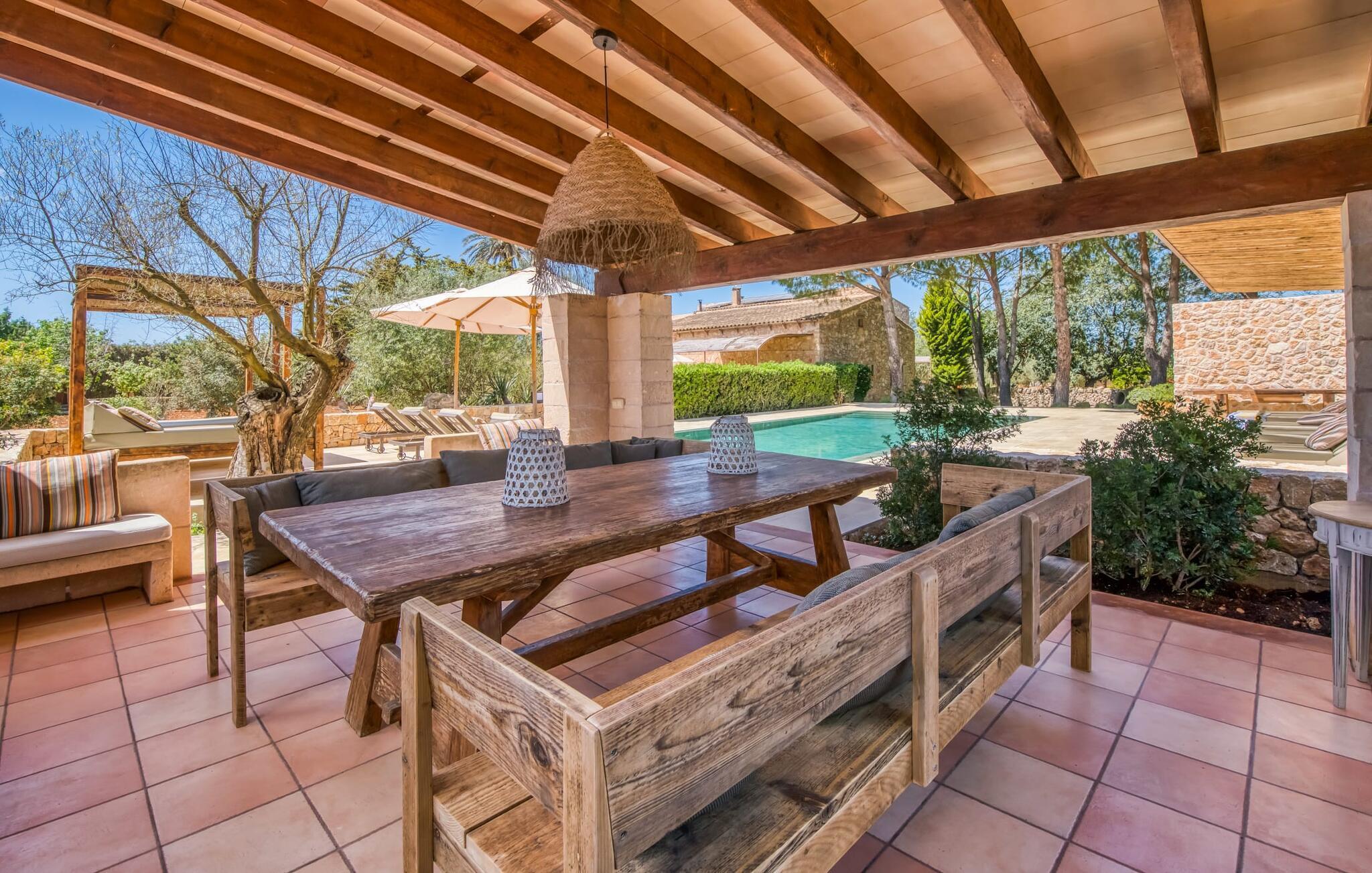 Im Inneren verfügt der offene Wohn- und Essbereich über helle Wände, sichtbare Balken und gemütliche Holzmöbel. Ein dekorativer Torbogen führt zu den drei komfortabel eingerichteten Schlafzimmern, zwei Doppelzimmern und einem Einzelzimmer. Mit drei Bädern, zwei davon en suite, bietet die Finca absolute Privatsphäre. Die Buchung von "Es Lledoner Tres" (EMI327) nebenan ist perfekt für zwei Familien, die zusammen reisen.