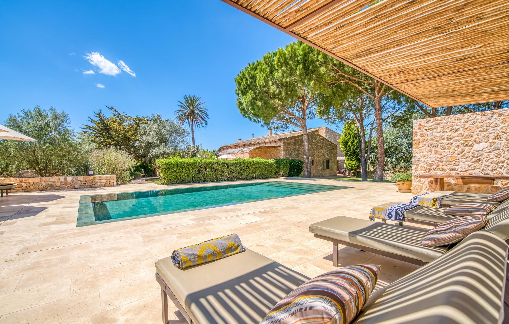 Diese aus Stein gebaute Finca "Es Lledoner dos" ist von einem großzügigen Grundstück mit Palmen, Pinien- und Olivenbäumen und anderen mediterranen Pflanzen umgeben.