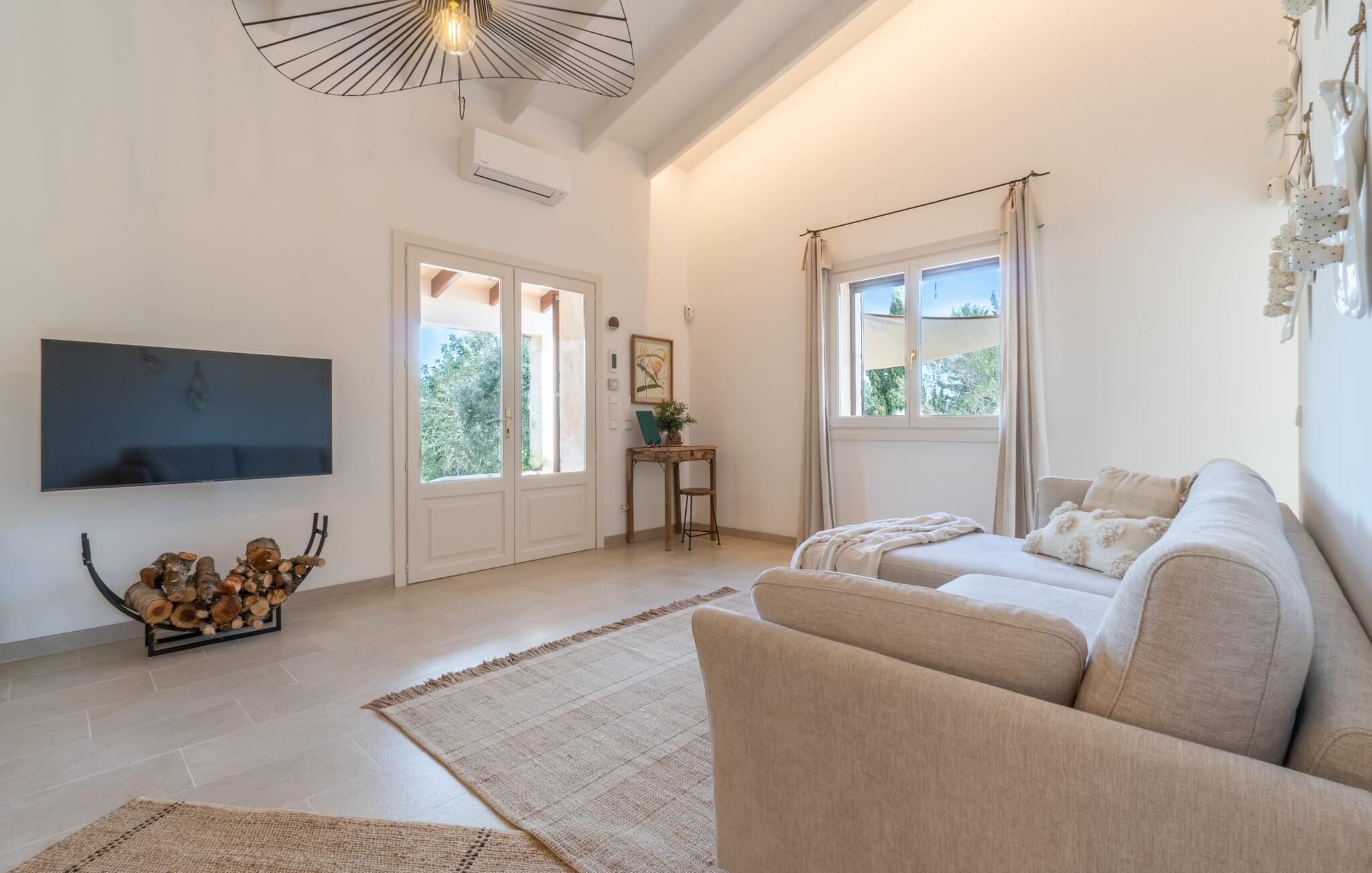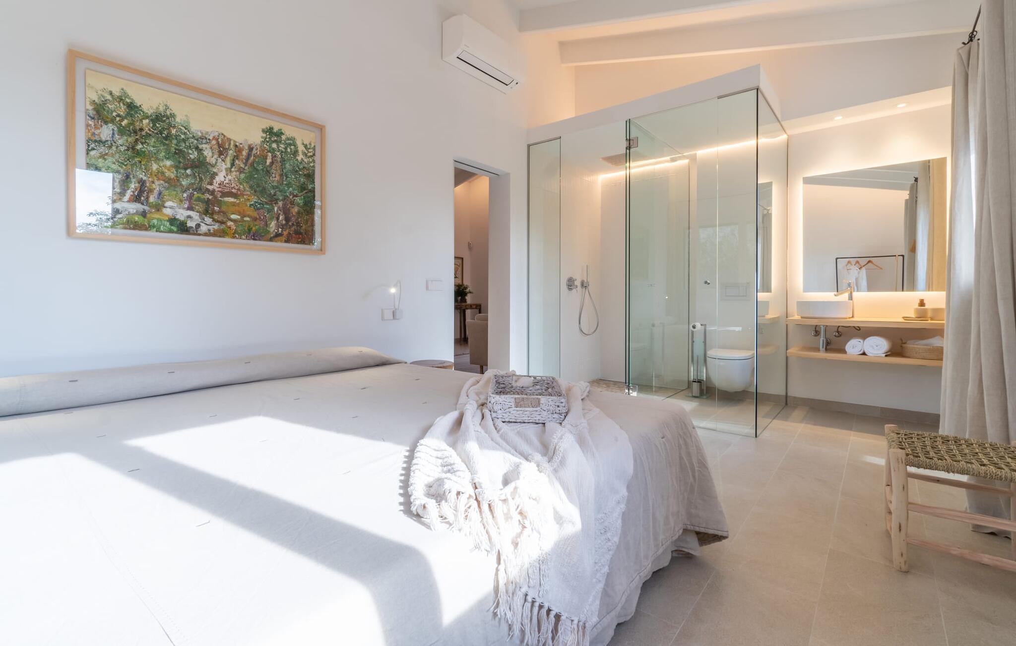 Der Innenraum des im traditionellen Stil erbauten Ferienhauses sorgt durchgehend für ein helles, freundliches Ambiente. Die dezente Eleganz der Einrichtung, geschmackvolle Naturmaterialien und viel Tageslicht sorgen für ein positives mediterranes Feeling. Die Küche ist zum Wohn- und Essbereich hin offen. Seine moderne Ausstattung verbirgt sich dezent hinter einem eleganten Design. Auch die beiden Doppelschlafzimmer und die beiden Badezimmer (eines davon en suite) sind in hellen Naturtönen gehalten und die charmante Kombination aus natürlichen Stoffen und Materialien lässt in jeder Ecke einen Hauch von Mittelmeer erahnen.