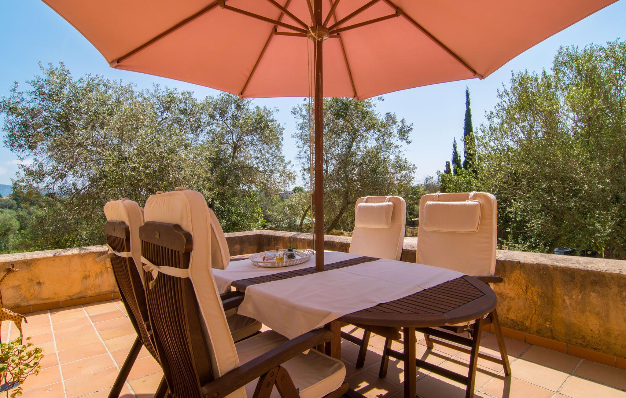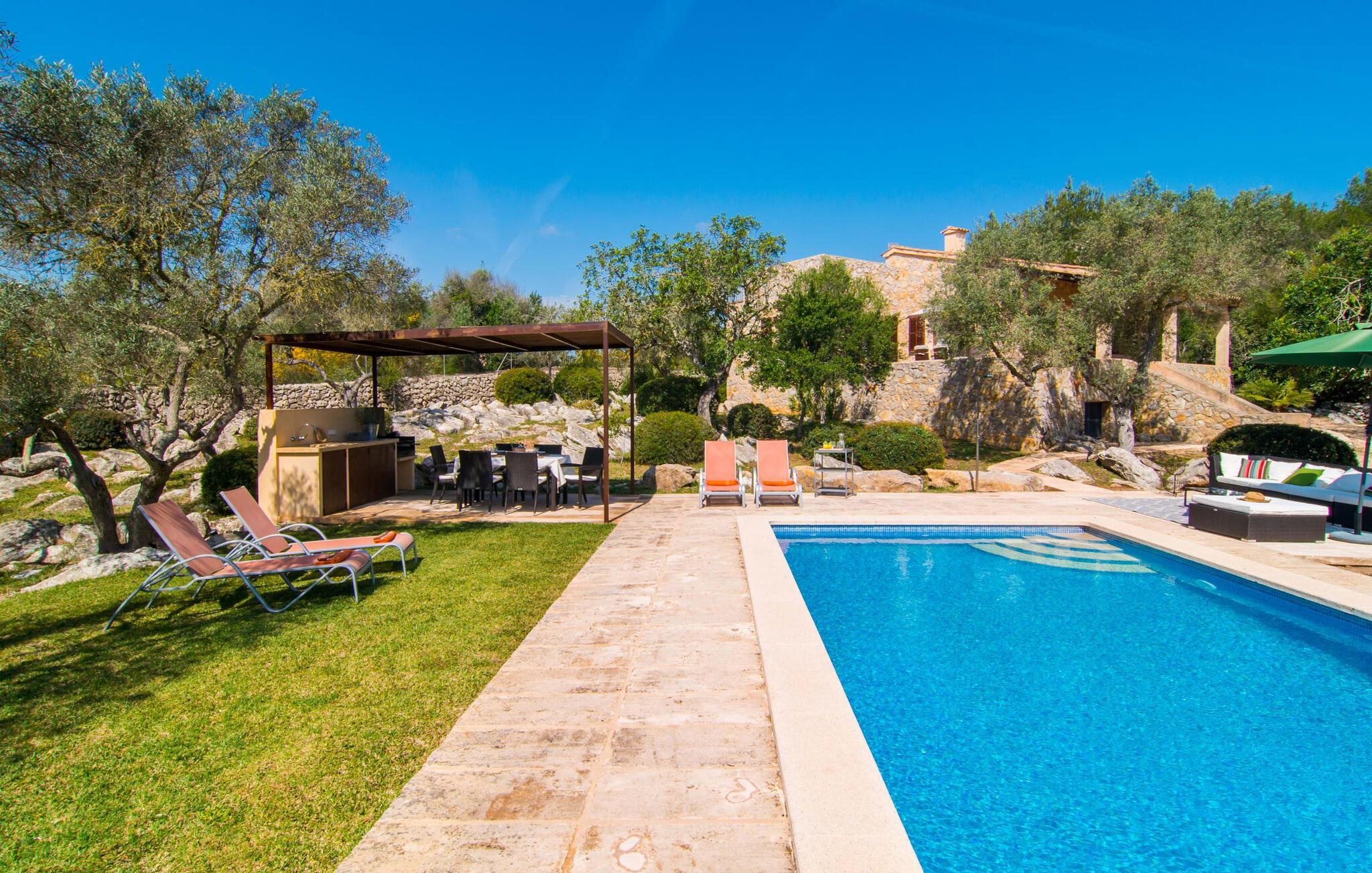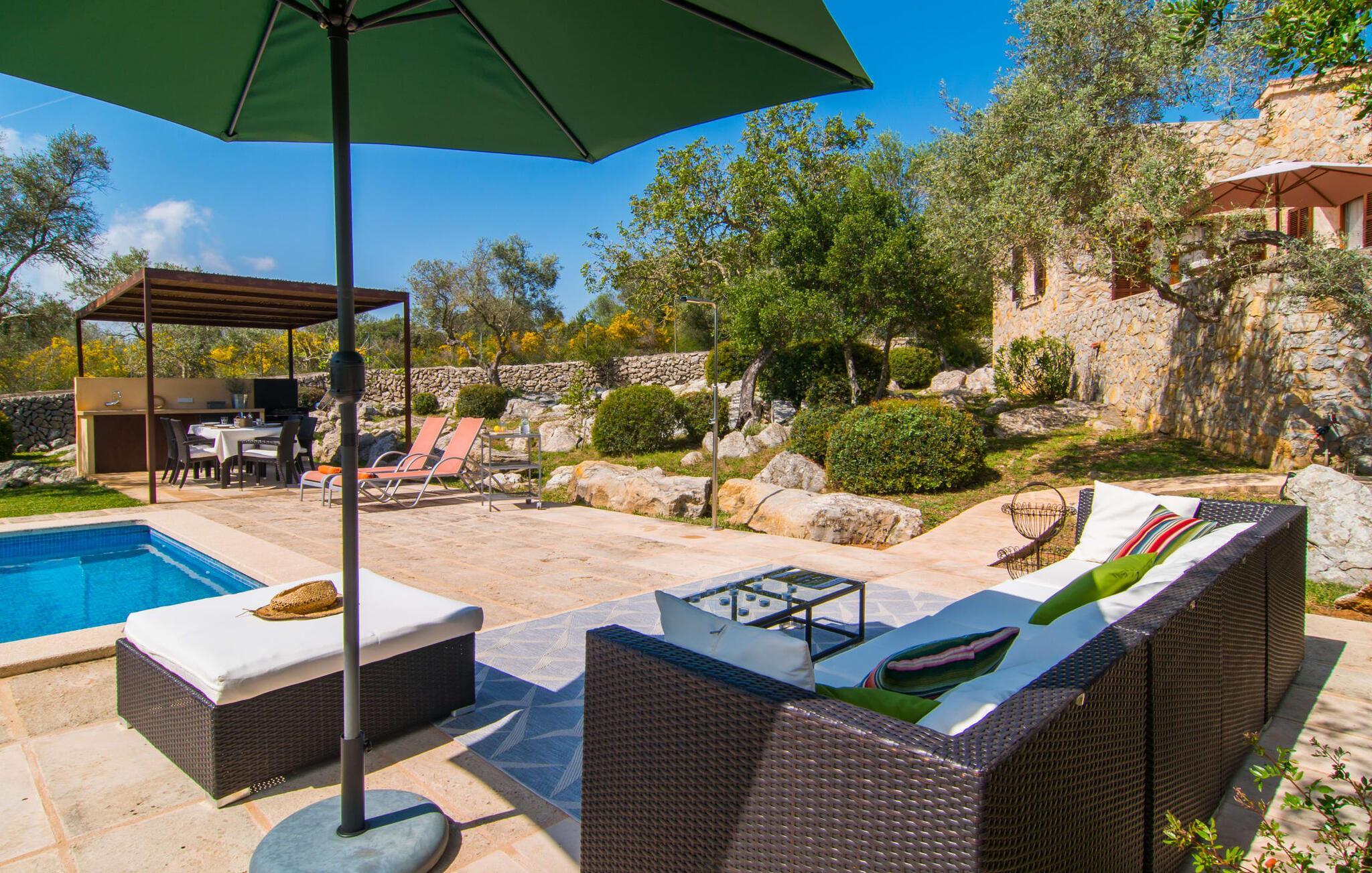 Gepflegte Palmen, Pinien und Olivenbäume verströmen den Duft des Mittelmeers und bieten den perfekten Ort für ein erholsames Nickerchen im Schatten. Ein Pool mit Sonnenterrasse und eine überdachte Außenküche mit Grill- und Essbereich laden dazu ein, den ganzen Tag im Freien zu verbringen. Weitere, teilweise überdachte Sitz- und Essbereiche finden Sie direkt am Haus. Von hier aus führt eine Treppe auf eine kleine Dachterrasse mit herrlichem Panoramablick auf das nahe gelegene Naturschutzgebiet Parc Natural de la Península de Llevant und das Schloss von Artà.