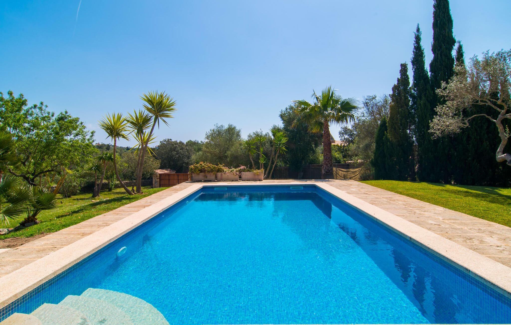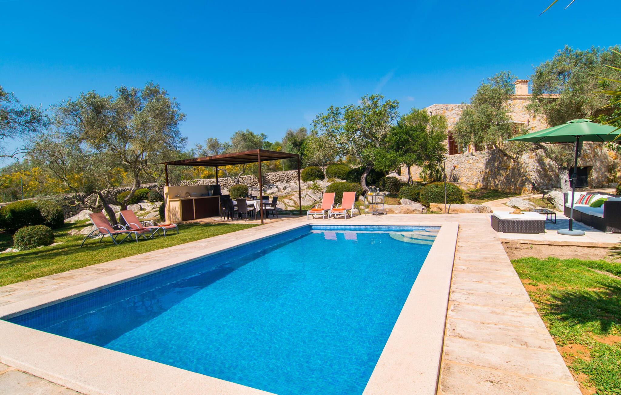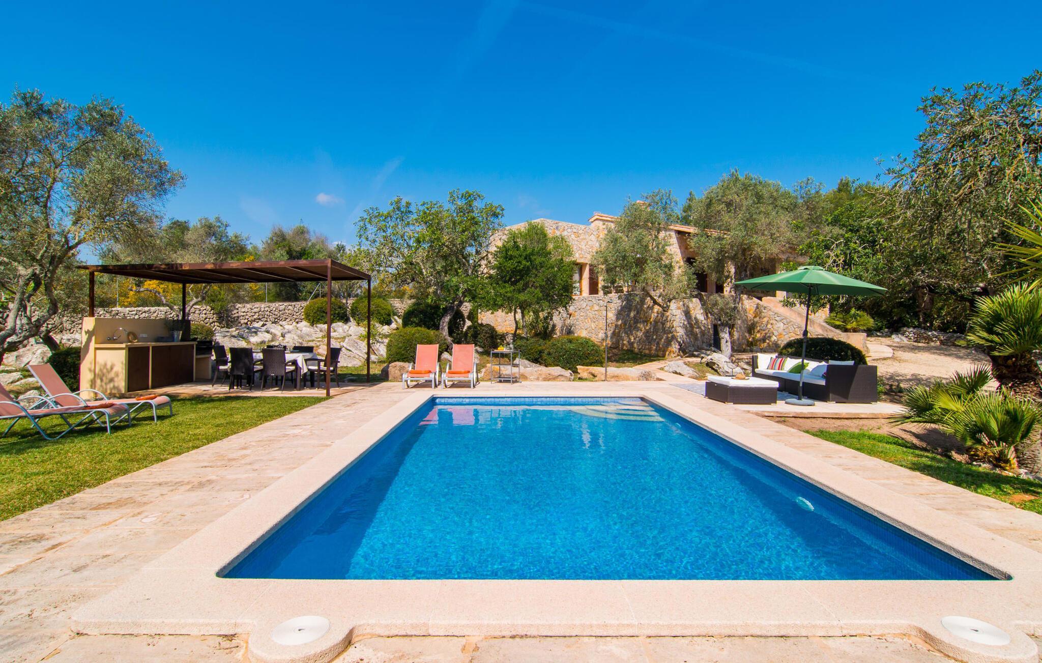 Gepflegte Palmen, Pinien und Olivenbäume verströmen den Duft des Mittelmeers und bieten den perfekten Ort für ein erholsames Nickerchen im Schatten. Ein Pool mit Sonnenterrasse und eine überdachte Außenküche mit Grill- und Essbereich laden dazu ein, den ganzen Tag im Freien zu verbringen. Weitere, teilweise überdachte Sitz- und Essbereiche finden Sie direkt am Haus. Von hier aus führt eine Treppe auf eine kleine Dachterrasse mit herrlichem Panoramablick auf das nahe gelegene Naturschutzgebiet Parc Natural de la Península de Llevant und das Schloss von Artà.