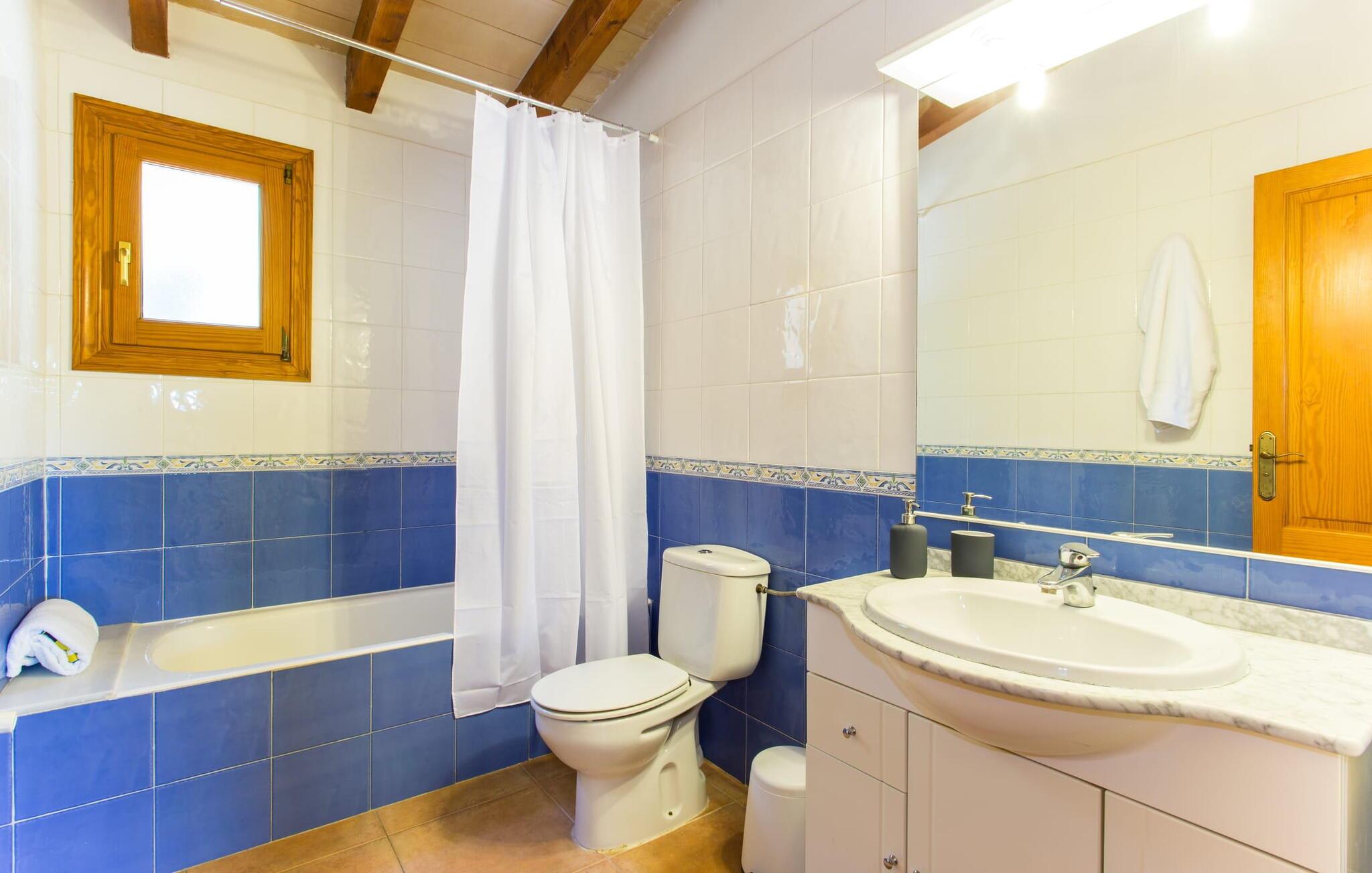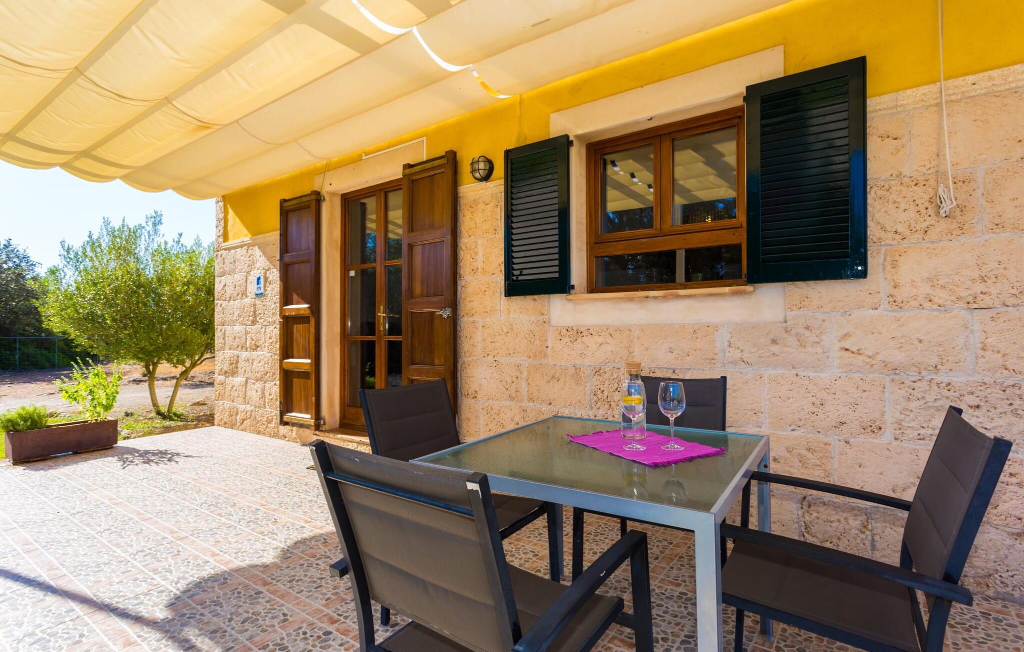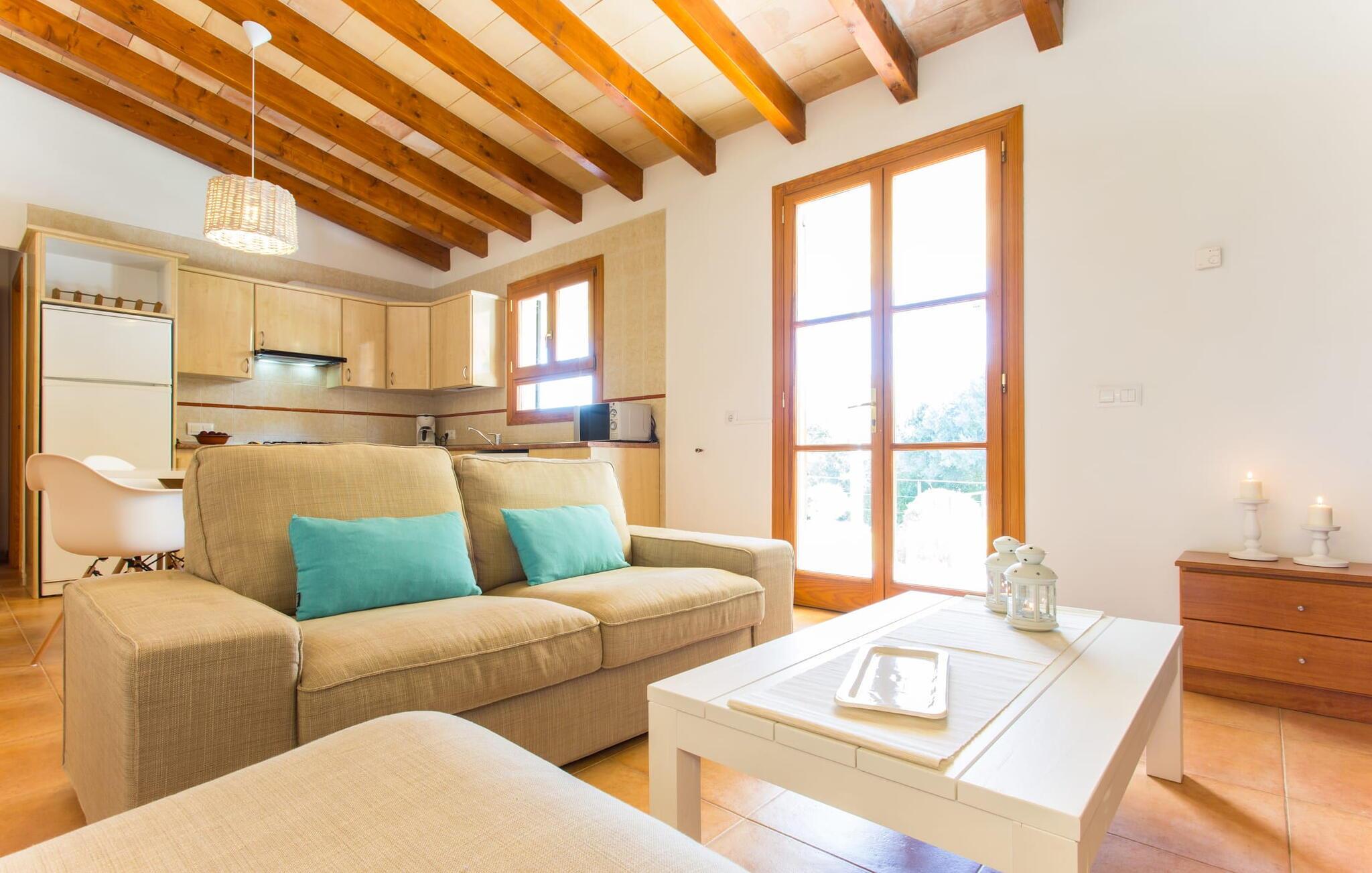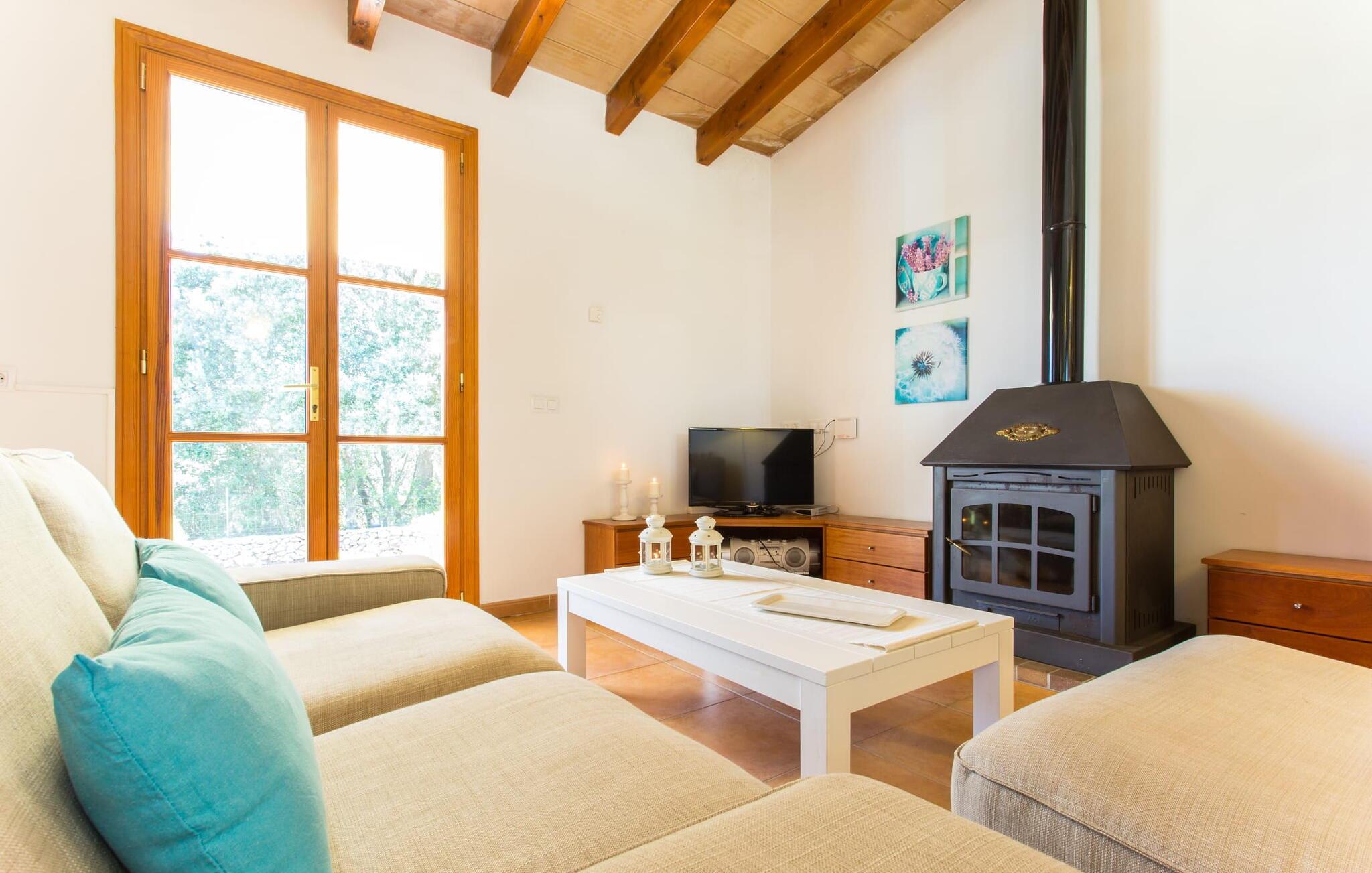 Das Innere der Villa ist modern und praktisch und verfügt über helle Wände, freiliegende Balkendecken und Holzfenster, die ihr heimeliges Gefühl verstärken. Der offene Wohnbereich umfasst eine voll ausgestattete Küche mit modernen Geräten, einem Esstisch und ein gemütliches Wohnzimmer mit Sat-TV und Kamin. Die beiden freundlichen Schlafzimmer mit jeweils zwei Einzelbetten sorgen für einen erholsamen Schlaf. Das Badezimmer präsentiert ein typisch spanisches Design mit moderner Ausstattung. Mit Zentralheizung ist "Es Puchet“ perfekt für ganzjährige Aufenthalte geeignet.