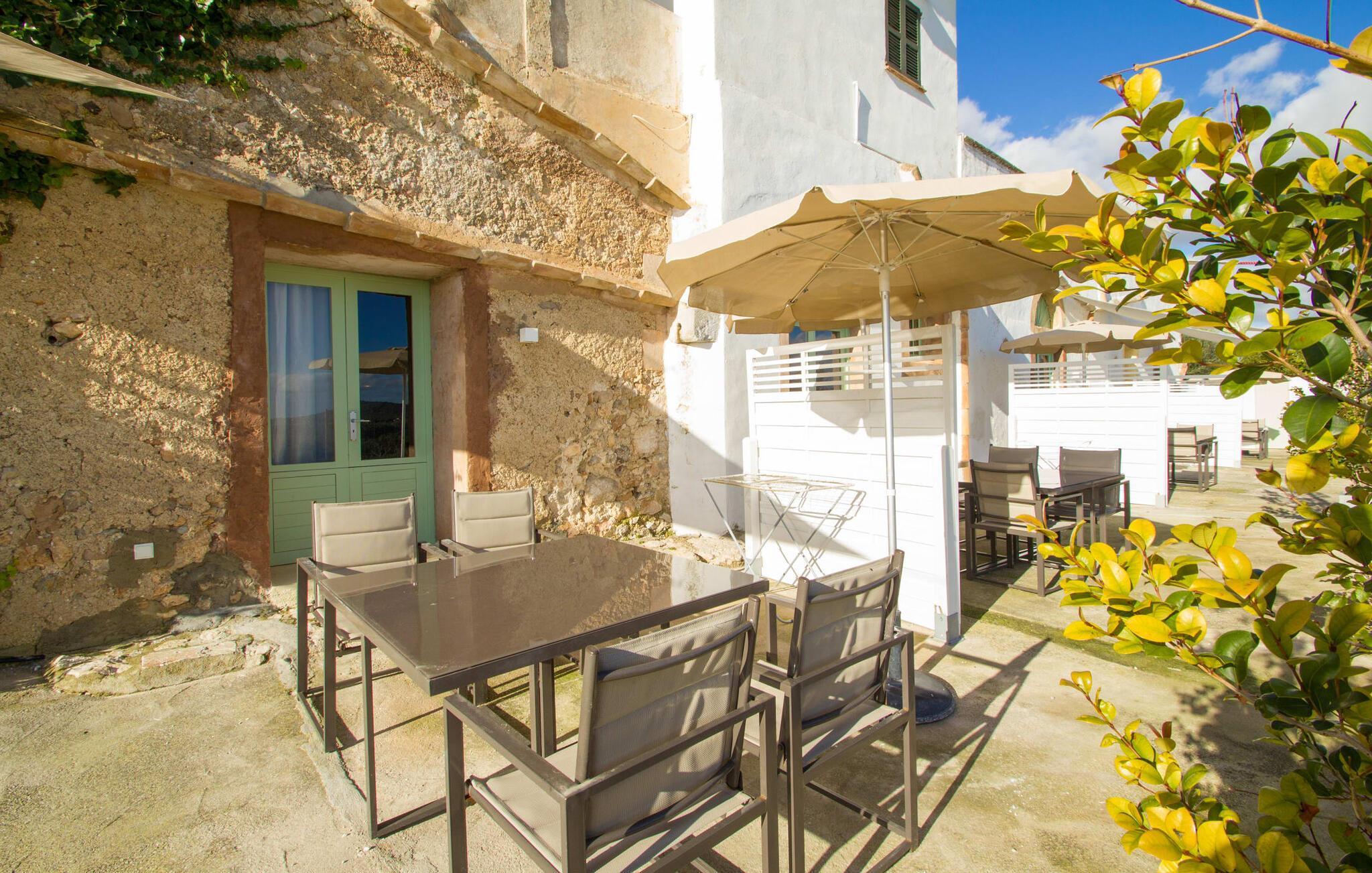 Was für ein Ort, was für ein Panorama! Und der gesamte Ort ist mit einem guten Maß an Originalität gewürzt, denn dieses Ferienhaus „Es Pujol Pedrito“ ist kein gewöhnlicher Ort. Ein Urlaub mit der Familie wird in diesem ebenso gemütlichen wie elegant gestalteten Zuhause zu einem besonderen Vergnügen! Dieses Ferienhaus, umgeben von fantastischen Naturlandschaften im Süden der Insel, ist der ideale Ort für Ruhesuchende. Aufgrund seiner günstigen Lage in Küstennähe bietet es zudem eine Vielzahl an Ausflugs- und Aktivitätsmöglichkeiten und so lässt das Haus – umgeben von einem weitläufigen Gelände – keine Wünsche offen. Dieses typisch mallorquinische Agroturismo-Anwesen ist eine Mischung aus Privatvilla und Hotel mit insgesamt acht attraktiven Wohneinheiten. Dies ist ideal für alle, die Wert auf die Idylle einer ländlichen Villa legen, aber nicht auf typische Hotelannehmlichkeiten verzichten möchten. Verschiedene Sitzmöglichkeiten und Ecken im Außenbereich laden zum Entspannen nach Herzenslust ein. Auch die Kinder kommen hier voll auf ihre Kosten, denn der Spielplatz mit verschiedenen Spiel- und Sportgeräten sowie Fußballtorpfosten, Basketballkörben und einem Tischkicker versprechen Spaß und Abwechslung. Vielleicht schließen die Kinder und Erwachsenen nebenbei neue Freundschaften? Natürlich wird auch hier der Spaß am Schwimmen groß geschrieben. Im (Gemeinschafts-)13-m-Pool, den Sie bequem über breite Stufen erreichen, können Sie an warmen Tagen ordentlich Bahnen schwimmen und sich erfrischen. Die Nutzung ist von Mai bis Oktober möglich. Auf den Liegestühlen auf der Panoramaterrasse können Sie nach Herzenslust entspannen und einfach mal die Seele baumeln lassen und eine Weile nichts tun – schließlich sind Sie im Urlaub. Ihr eigener möblierter Bereich neben dem Haus bietet herrliche Orte, an denen Sie Ihre Mahlzeiten in vertrauter Gesellschaft genießen können. Was für eine wunderschöne Umgebung für ein genussvolles Frühstück hier am Morgen unter tiefblauem Himmel!