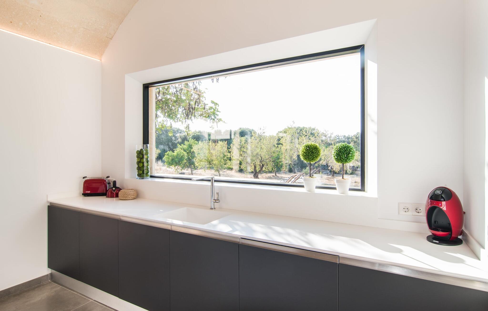 Der Innenbereich bietet großzügige, lichtdurchflutete Räume auf zwei Ebenen. Im ersten Stock befindet sich ein Schlafzimmer mit integriertem Bad und Vorraum, das einer Suite ähnelt. Im Erdgeschoss befinden sich zwei weitere Schlafzimmer und ein Gemeinschaftsbad mit Dusche sowie einfachem Zugang zum Pool und zur Außendusche. „Es Qanat“ ist ein Beispiel für modernes Design, insbesondere im Küchenbereich, der sich nahtlos in den Wohnraum einfügt und einen atemberaubenden Blick auf die umliegenden Hügel von Artà und Capdepera bietet. Dieses Anwesen ist eine perfekte Mischung aus Komfort, Stil und natürlicher Schönheit.