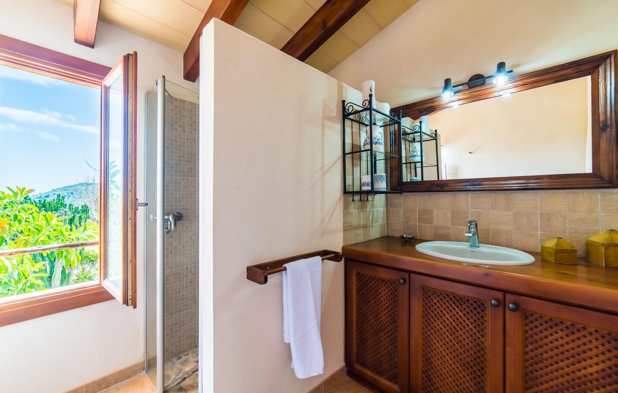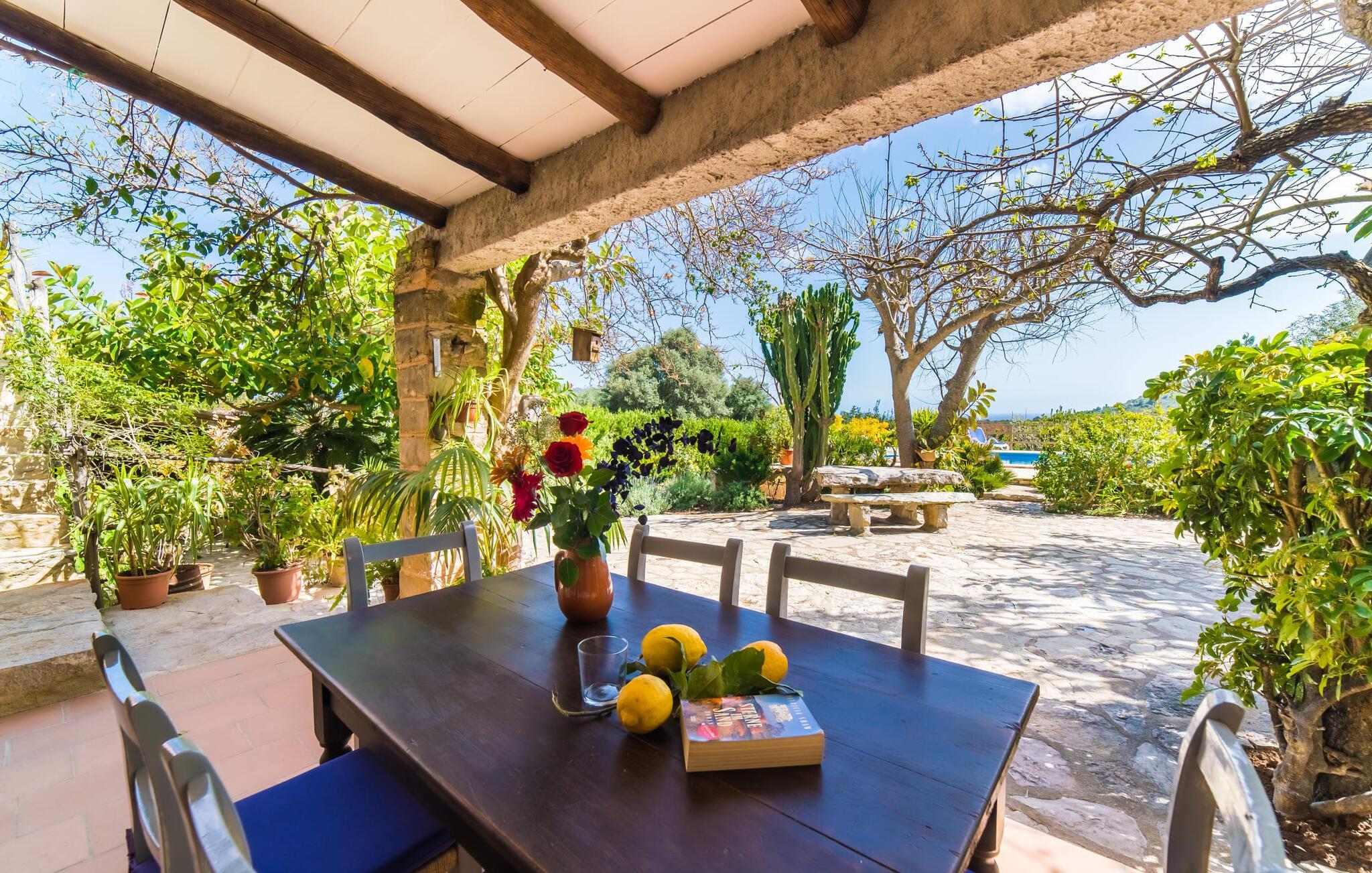 In der Meerblick-Villa „Es Rafal de Baix“ können bis zu acht Reisende einen herrlich ruhigen Urlaub in wunderschöner ländlicher Lage erleben. Die Eigentümer haben dieses Ferienhaus besonders liebevoll für die Ferienvermietung konzipiert und dadurch ein absolut einladendes Wohnambiente geschaffen. Der Außenbereich strahlt eine ansprechende Idylle aus und lockt mit dem schönen Pool mit Meerblick, der üppigen Bepflanzung mit Palmen und anderen mediterranen Pflanzen, dem verzweigten Terrassenbereich, dem ummauerten Grill und verschiedenen attraktiven Sitzmöglichkeiten. Das Herzstück des Außenbereichs, der leicht erhöhte Pool mit seiner umlaufenden Lounge-Terrasse, gibt den Blick auf die wunderschöne umliegende Landschaft frei und stellt einen besonders exponierten Ort dar, an den man immer wieder gerne zurückkommt. Auf insgesamt acht Poolliegen können Sie nach Herzenslust unter dem tiefblauen Mittelmeerhimmel entspannen und die Ruhe genießen. Um sich vor starker UV-Strahlung zu schützen, stehen Ihnen ausreichend Sonnenschirme zur Verfügung. Sie können sich auch ein luftiges, natürliches Schattenplätzchen suchen, das je nach Tageszeit leicht zu finden ist – zum Beispiel auf der urigen Steinsitzgruppe direkt neben der Poolterrasse. Am Haus erwartet Sie eine ebenso gemütliche wie malerische überdachte Terrasse. Holzmöbel werden absolut stimmungsvoll mit Naturstein und originellem Dekor kombiniert, sodass zu jeder Tageszeit ein sehr ruhiger Bereich für gemeinsames Essen entsteht. Über eine verträumte kleine Treppe gelangt man auf eine Dachterrasse außerhalb des Hauses, die teilweise mit einem hellen Bambusdach versehen ist und einen weiteren potenziellen Lieblingsplatz darstellt. Hier bei Sonnenaufgang oder Sonnenuntergang bei einem leckeren Getränk sitzen: ein ganz besonderer Luxus, den Sie unbedingt nutzen sollten!