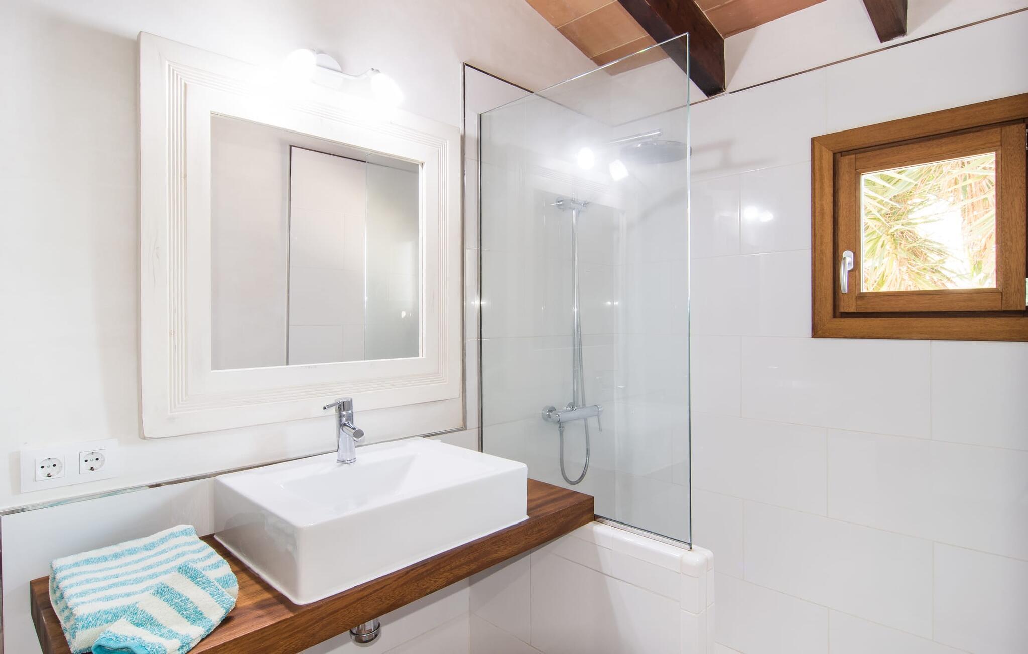 Jede Einheit hat ihren ganz eigenen Charme. Das Apartment „Es Blau“, dessen weiße Inneneinrichtung durch die vielen himmelblauen Akzente hervorgehoben wird, liegt links im Erdgeschoss des Hauptgebäudes. Alle Fenster sind mit Faltläden verdunkelbar. Von der 30 m² großen überdachten Terrasse (mit Esstisch und Sonnenliegen) gelangen Sie direkt in den ruhigen Teil des Gartens; Es ist ideal für einen Urlaub mit Kindern. Hinter der Glastür oder dem Vorhang mit blauem Muster verbirgt sich die gemütliche Fernsehecke, die mit der offenen Küchenzeile und dem Esstisch verbunden ist. Spaghetti mit Tomatensauce und frischen Kräutern sind auf dem Doppelbrenner-Gasherd schnell zubereitet. Von hier aus gelangt man von beiden Seiten über ein paar Stufen in eines der beiden Doppelzimmer. Beide verfügen über ein modernes En-Suite-Duschbad, eines davon mit direktem Zugang nach draußen. Sowohl neben dem 1,50 x 2 m großen Doppelbett als auch neben den beiden Einzelbetten ist Platz für ein Babybett. Und wenn Ihnen 70 m² Wohnfläche nicht ausreichen, sollten Sie das gesamte Anwesen zu Ihrem blühenden Wohn-, Ess- und Spielzimmer im Freien machen.