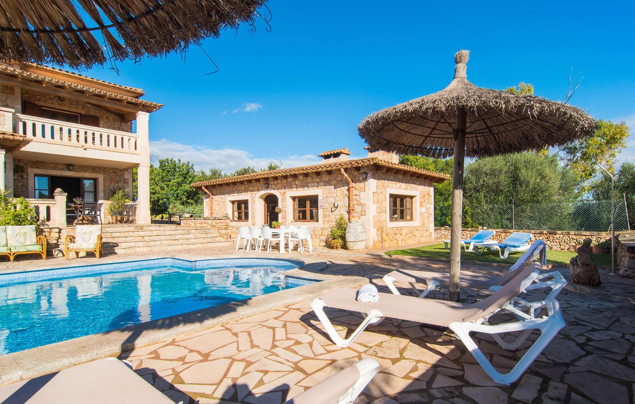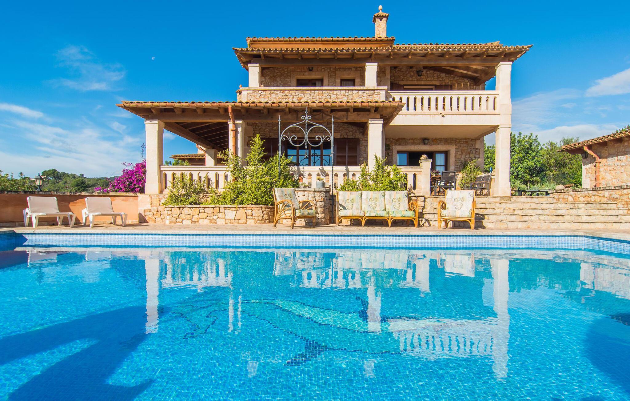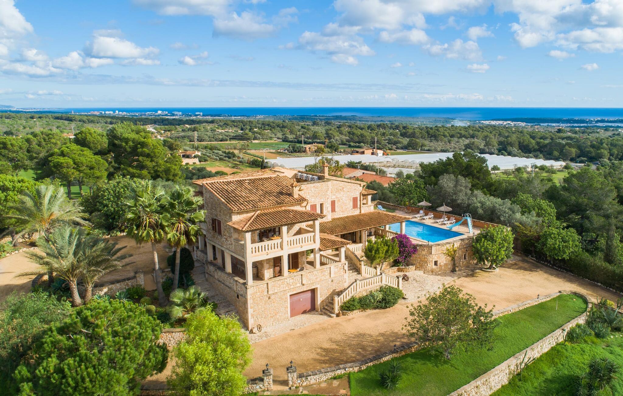 Das traditionelle Bauernhaus „Es Turo Golf“ im Süden Mallorcas punktet mit einer erhabenen und absolut ruhigen Lage und bietet somit beste Urlaubserholung für Sie und Ihre Familie oder Freunde. Das urige Bruchsteinhaus ist umgeben von einem mediterranen Garten mit hohen Palmen, Oliven- und Obstbäumen sowie üppig blühenden Bougainvilleen. Durch die Hanglage genießen Sie tolle Ausblicke über die beeindruckende Landschaft und den benachbarten Golfplatz bis hin zum Meer. Dieses optische Vergnügen können Sie von zahlreichen Terrassen – überdacht oder freiliegend – sowie herrlichen Balkonen genießen. Stille und Privatsphäre begleiten Sie auch rund um den gemauerten Pool mit Delfin-Emblem. Kinder können direkt ins Wasser rutschen – Badespaß für Groß und Klein. Ein entspannter Tag im Garten kann auch in der hauseigenen Bodega ausklingen. Die separate, geschlossene Außenküche mit gemauertem Grill, offenem Kamin und gemütlicher Essecke bietet alles, was Sie für einen gemütlichen Abend brauchen – unabhängig von der Reisezeit.