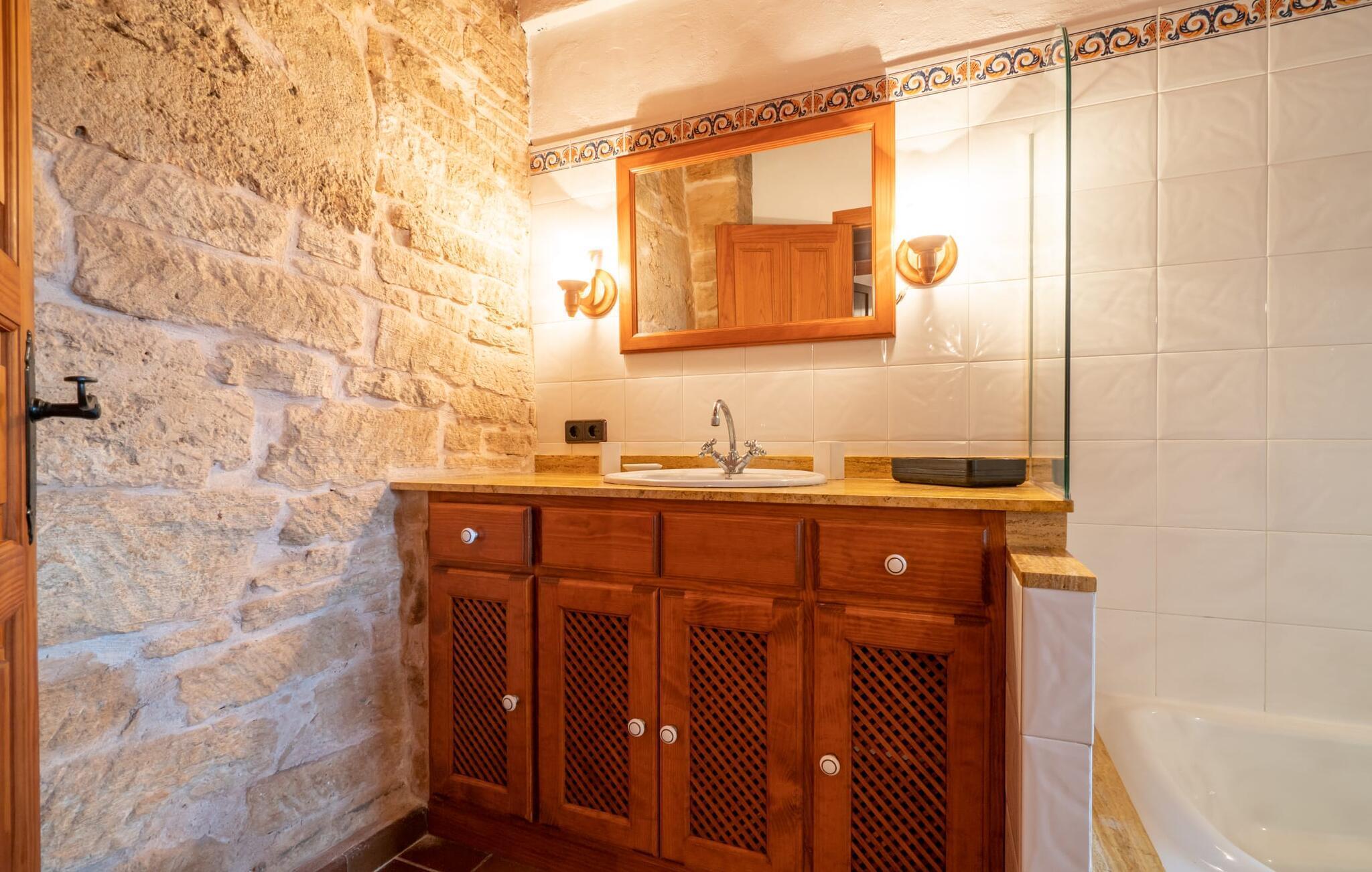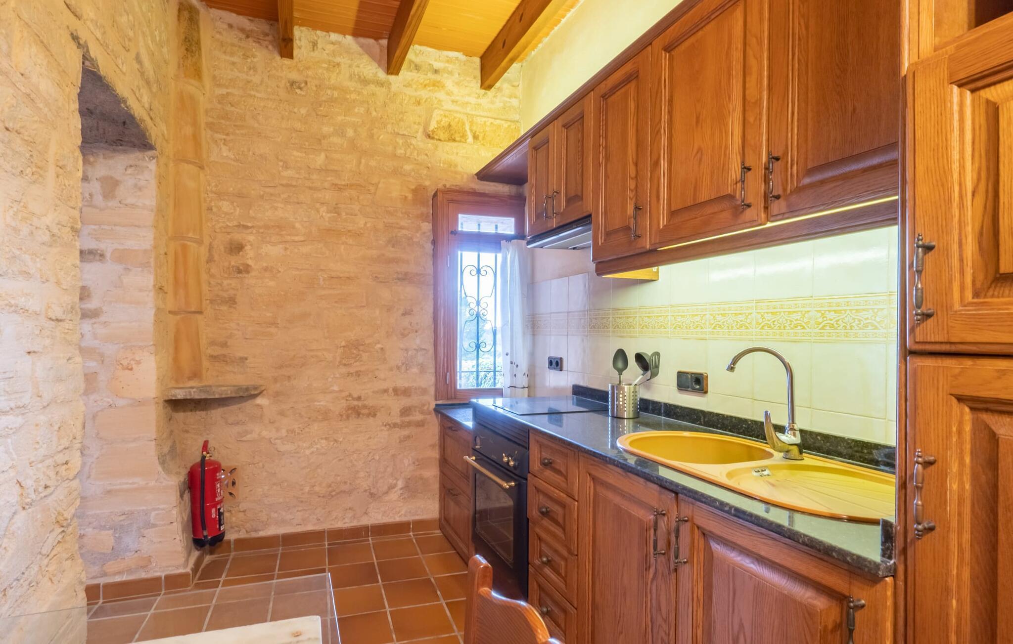 Die Wohnung selbst verbindet rustikalen Charme mit Komfort. Weiße Wände, Naturstein, Terrakottafliesen, Sichtbalken und Holz sorgen für eine authentische Inselatmosphäre. Der schöne Wohn-Essbereich mit halboffener Küche bietet einen gemütlichen Raum zum Entspannen und Selbstversorgen im Innenbereich. Das Schlafzimmer verfügt über ein Doppelbett (zwei Einzelmatratzen) und das Badezimmer verfügt über Tageslicht. Die Wohnung verfügt auch über eine Klimaanlage für ganzjährigen Komfort. "Es Turo Menorca" bietet ein authentisches Mallorca-Erlebnis, ohne auf Komfort zu verzichten.