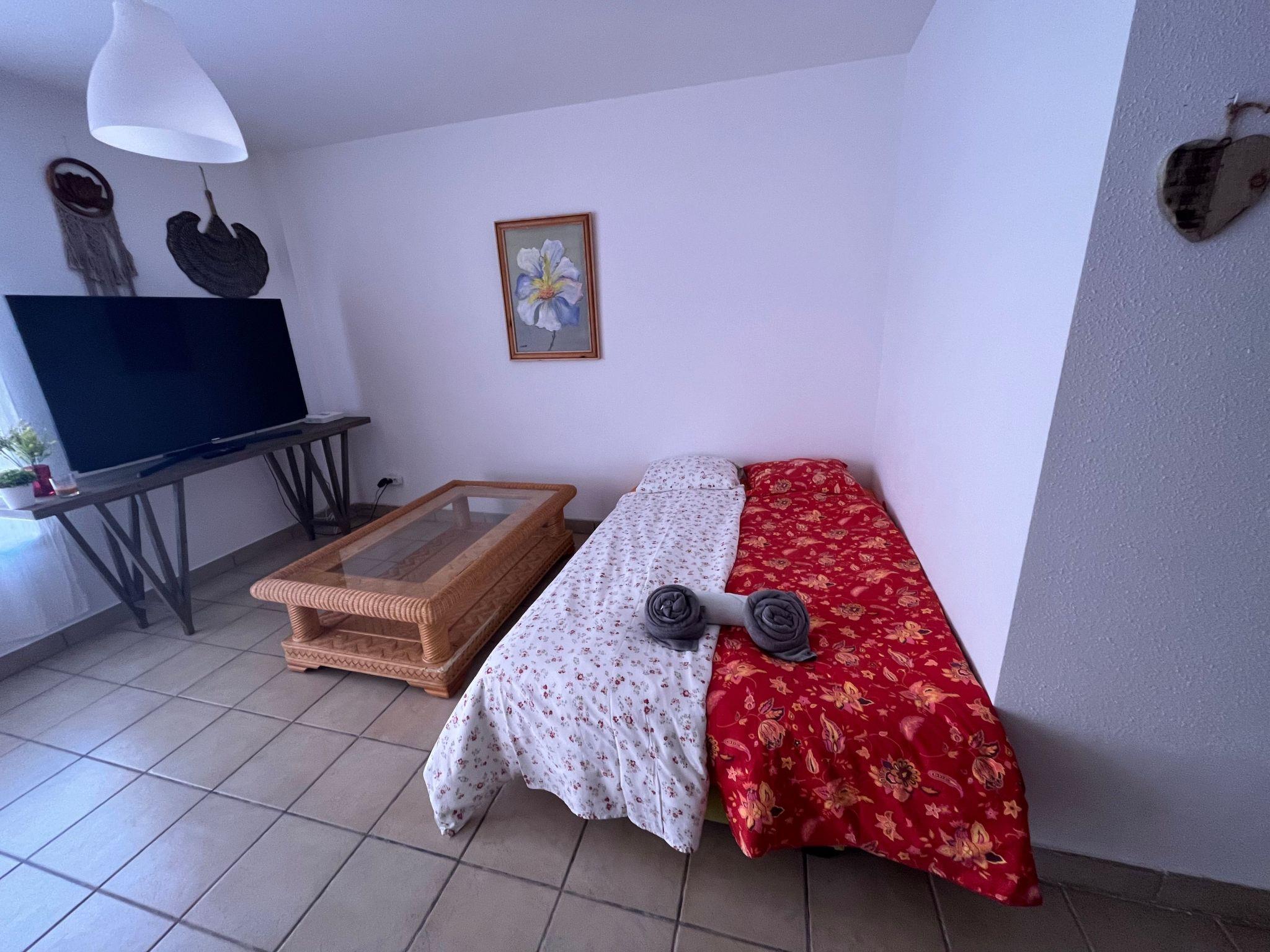 Das Apartment verfügt über ein Schlafzimmer mit Doppelbett und großen Einbauschränken, einem großen Wohnbereich mit offener Küche, Internet-Fernseher, einer Schlafcouch, geeignet für zwei Personen und großen Schiebetüren zur Terrasse.