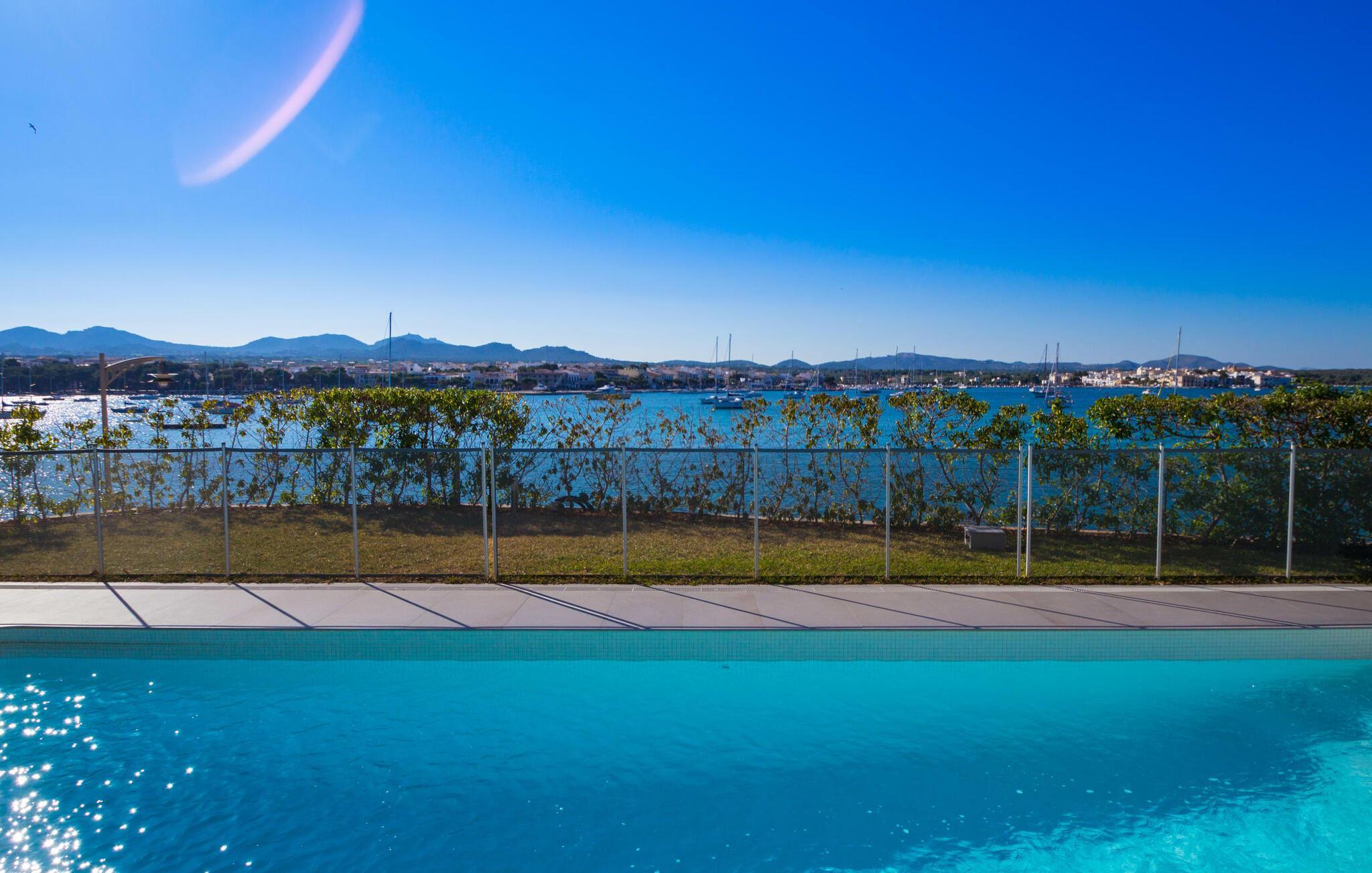 Der äußerst schöne Pool ist in das Haus integriert und verfügt über einen Zaun, um mögliche mitreisende Kleinkinder zu schützen. Darüber hinaus dient es als Absicherung, um Privatsphäre und Gemütlichkeit zu gewährleisten. Eine Sonnenterrasse sowie die angrenzende Liegewiese laden zum ausgiebigen Entspannen und Sonnenbaden auf einer der bequemen Liegestühle ein. Für den Fall, dass die Sonne zu stark scheint, stehen zwei Sonnenschirme zur Verfügung. Die Terrasse direkt am Pool bietet zu jeder Tageszeit luftigen Schatten und einen modernen Esstisch, von dem aus man nur staunend auf das herrliche Panorama blicken kann, das direkt vor einem liegt. So oder so ist es ein Vergnügen, den Tag im Morgenlicht zu beginnen oder nachts die funkelnden Lichter des Hafens zu bestaunen. Direkt an der Ecke und strategisch günstig am Sonnenlauf positioniert, befindet sich der herrliche Lounge-Bereich, in dem man nach Lust und Laune entspannen und den Zauber dieses Ortes genießen kann. Die überwiegend weiße Farbe verleiht der Umgebung ein exquisites Design und bildet gleichzeitig einen tollen Kontrast zum tiefblauen Himmel und dem Meer.