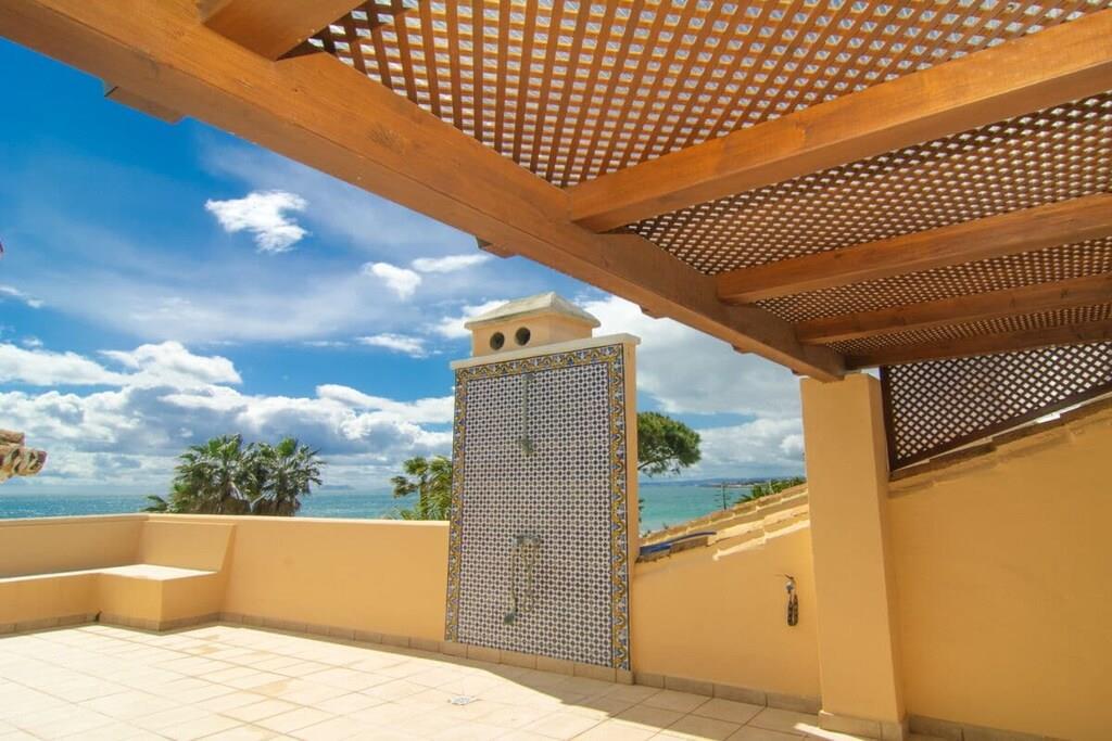 Atemberaubende erste Linie Ansichten, geräumige hochwertige Penthouse (240m2) mit 3 Terrassen, 3 Schlafzimmer und ein separates Service-Schlafzimmer, in ausgezeichneter erster Linie Strandlage. Perfekte Zutaten für einen unvergesslichen Urlaub an der Costa del Sol in Venalmar gesichert Urbanisation. ~ Innen Dieses wunderschöne, nach Süden ausgerichtete Penthouse in erster Strandlinie (240m2) verfügt über 3 Schlafzimmer mit eigenem Bad und ein Service-Schlafzimmer, ein geräumiges Wohnzimmer mit Essbereich, 3 große Terrassen mit herrlichem Panoramablick auf das Meer und eine voll ausgestattete Küche. Im Obergeschoss befindet sich eine sehr große Terrasse (60m2) mit Dusche und ein separater Raum mit einer privaten Sauna. Das Wohnzimmer hat eine Sitzecke vor einem Holzkamin und einem Flachbildfernseher, ausgestattet mit einem großen bequemen Sofa und zwei Sesseln. Von hier aus gelangen Sie auf eine schöne Terrasse (20m2), die mit einem Glasvorhang ausgestattet ist, so dass Sie auch in der kalten Jahreszeit den Raum und die Aussicht genießen können. Der Essbereich verfügt über einen Esstisch für 6 Personen und ist durch ein Durchgangsfenster mit der Küche verbunden. Auf der gleichen Ebene befinden sich die drei Schlafzimmer, alle mit voll ausgestatteten Badezimmern, zwei Schlafzimmer mit je zwei Einzelbetten (90x190cm) und das Hauptschlafzimmer mit einem großen Doppelbett (180x190cm). Alle Schlafzimmer haben große Kleiderschränke, zwei Schlafzimmer bieten einen schönen Blick auf das Meer und teilen sich eine 14m2 Terrasse vor dem Meer und das dritte Schlafzimmer mit Blick auf den Poolbereich. Das Service-Schlafzimmer besteht aus einem kleinen Raum mit einem Einzelbett und einem Waschbecken und befindet sich auf der Terrasse im Obergeschoss. Die Küche verfügt über alle Geräte für einen komfortablen Aufenthalt: Backofen, Mikrowelle, Kaffeemaschine, Geschirrspüler, Kühlschrank, Vitro-Keramik, Toaster und alle anderen Küchenutensilien sind vorhanden. Neben der Küche befindet sich eine Waschküche mit Waschmaschine und Trockner. ~ Terrassen Das Penthouse verfügt über 3 schöne Terrassen. Die größte im Obergeschoss (60m2) hat eine Außendusche mit warmem/kaltem Wasser und die beste Aussicht, so dass Sie den ganzen Tag auf einer Sonnenliege entspannen und dem beruhigenden Klang der Wellen lauschen können. Die zweite Terrasse (20m2) ist vom Wohnzimmer aus zugänglich und ist mit Rattansesseln und einem Couchtisch ausgestattet. Diese Terrasse hat einen Glasvorhang, den Sie komplett öffnen oder schließen können, so dass Sie den Raum unabhängig vom Wetter genießen können. Die dritte Terrasse (14m2) ist sowohl vom Haupt- als auch vom Gästeschlafzimmer aus zugänglich und ist mit Sonnenliegen und einem Couchtisch ausgestattet. Versorgungseinrichtungen: TV, Internet, Klimaanlage warm/kalt, Toaster, Backofen, Kaffeemaschine, Bügeleisen, Geschirrspüler, Vitrokeramik, Mikrowelle, Kühlschrank, Gefrierschrank, Waschmaschine, Trockner, Haartrockner. Räume: 3 Schlafzimmer und 1 Dienstzimmer, 3 Badezimmer, 1 Gästetoilette, großes Wohnzimmer mit Essecke, 1 Küche, 1 Hauswirtschaftsraum. Möblierung: Doppelbetten (1), Einzelbetten (5), Sofa, Sessel, Terrassentisch (4), Esstisch (6). Alle Schlafzimmer haben Kleiderschränke. Sonstiges: Bettwäsche und Handtücher, 1 Privatparkplatz und Internetzugang inklusive. Draußen: Terrassen (3), Gemeinsamer Pool, Gemeinsamer Garten, Privater Parkplatz, Parkplatz auf der Straße, Gemeinsame Sauna.