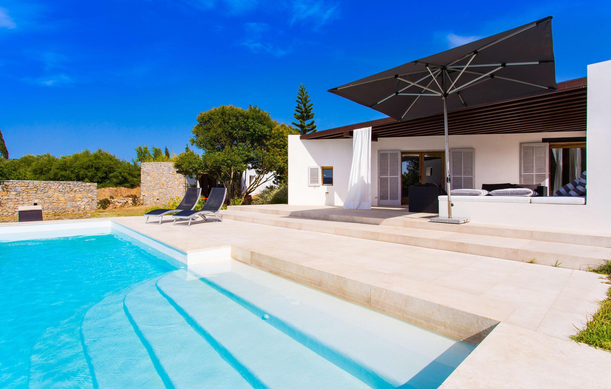 Diese Villa wirkt wie eine frische Brise auf Geist und Seele. Vielleicht ist es der große Eukalyptusbaum im Garten, in dessen Schatten man bei der Ankunft so richtig durchatmen und in Ruhe die besondere Architektur des Hauses und des großen Grundstücks betrachten kann? Hier wurde mit Formen und Farben gespielt: Die verschiedenen Gebäudeteile verbinden sich miteinander, streben nach vorne und trennen sich voneinander. Pastelltöne, strahlendes Weiß und Naturstein verstärken diesen Eindruck. Das große Haupthaus dominiert; Das separate Gästehaus mit 90 m² Wohnfläche erkennt man erst auf den zweiten Blick. „Eucalipto“ ist definitiv alles außer einem: langweilig. Sie wissen nicht, ob Sie sich draußen hinsetzen oder hinlegen sollen: auf der Bank mit Kissen, mit der weißen Wand im Rücken, die einen interessanten Ausblick bietet; auf den Rattansitzen mit Blick auf den Pool und die grünen Hügel; am rustikalen Tisch unter diesem Baum, am besten bei einem entspannenden Kräutertee; am langen Esstisch unter dem Dach, während Steaks, Fisch oder vegetarische Köstlichkeiten auf dem Grill liegen; auf der kleinen, mit sattem Grün bedeckten Natursteinterrasse, auf der Sie einfach träumen oder ein Buch lesen können; Oder legen Sie sich doch lieber auf eine der vielen Liegen am Pool? Ob Schatten oder Sonne, die Entscheidung fällt Ihnen wirklich schwer (Sie können sogar entscheiden, ob Sie Ihr Auto vor dem Haus unter Bäumen parken möchten...). Für eine kleine Erfrischung reicht ein Sprung in die Außendusche oder ins blaue Wasser des Pools – man kann aber auch langsam Schritt für Schritt vorgehen...