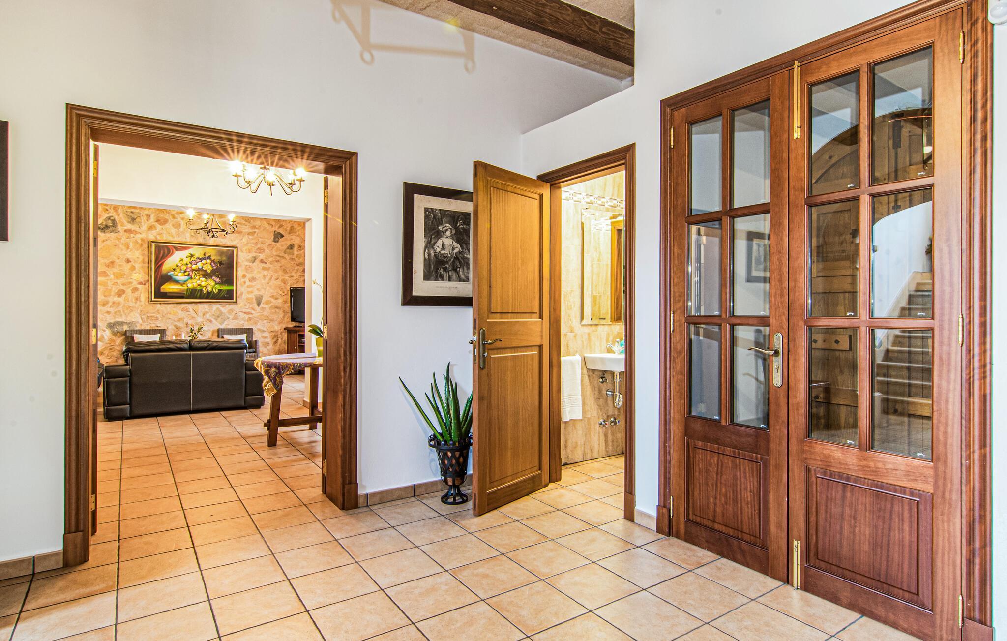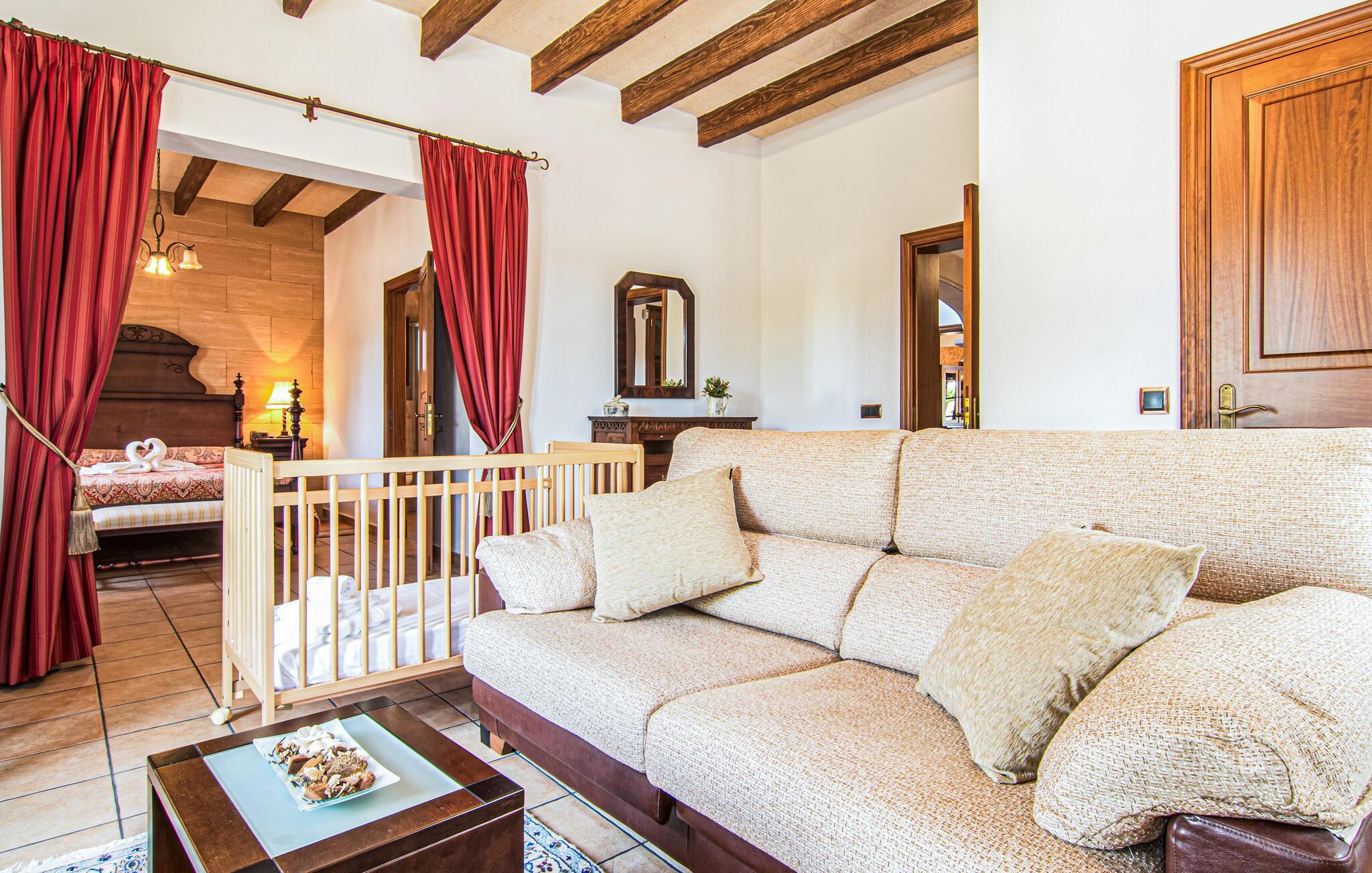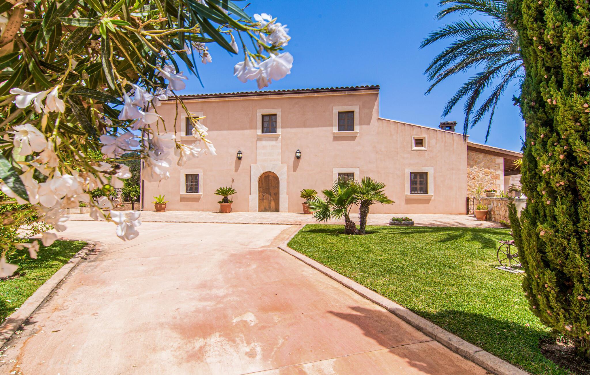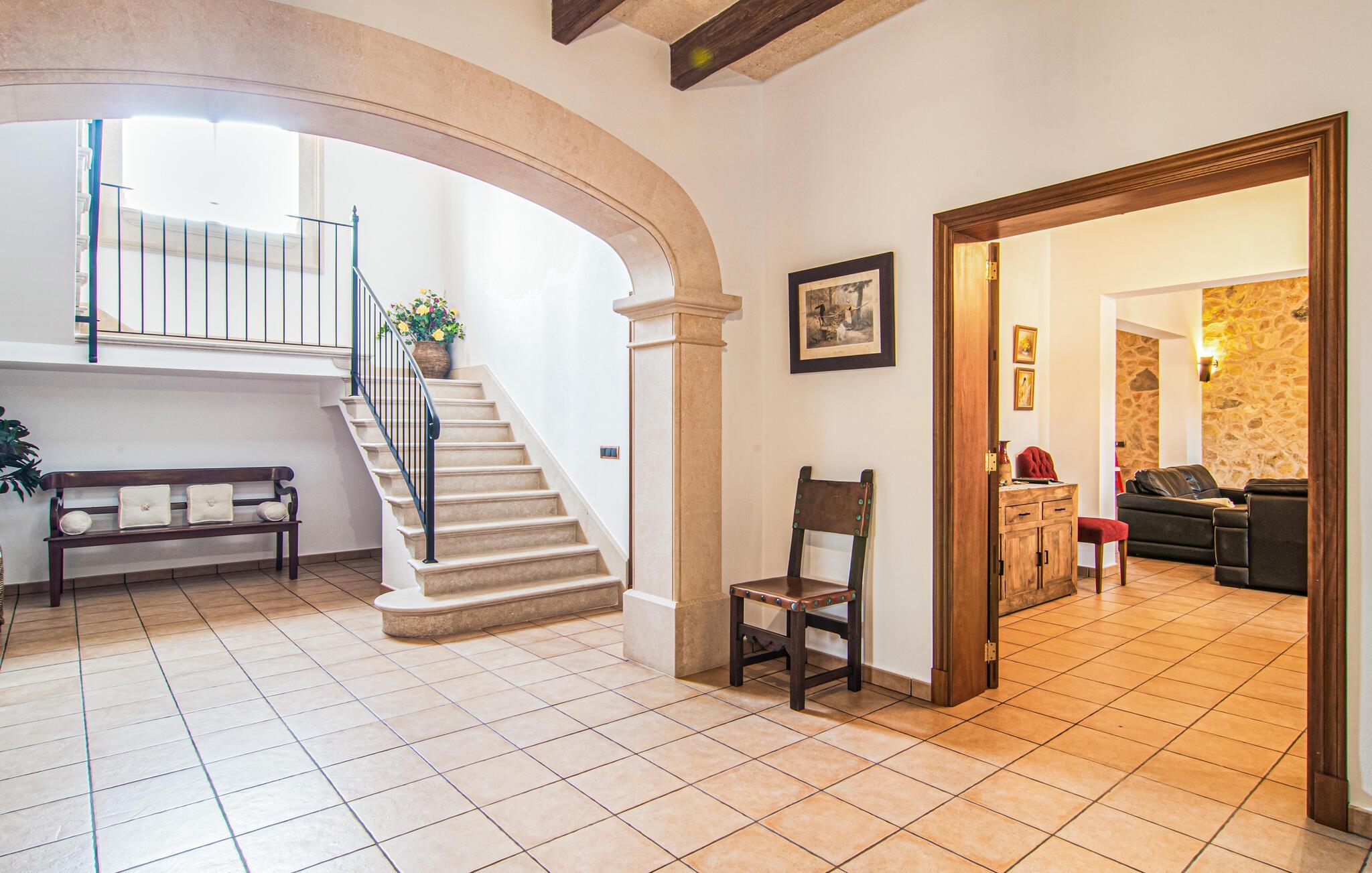 Eingebettet in ein ruhiges, weitläufiges Grundstück, heißt Sie dieses wunderschöne mallorquinische Anwesen herzlich willkommen. Treten Sie ein und erkunden Sie die liebevoll eingerichteten Räumlichkeiten, in denen gepflegte Holzbalken, Natursteinwände und prachtvolle, traditionelle Möbel für eine authentische Atmosphäre sorgen. Zaubern Sie köstliche Gerichte in der geräumigen Küche, plaudern Sie auf einem der vielen gemütlichen Sofas oder ziehen Sie sich für ruhige Lesestunden an Ihren Lieblingsort zurück.