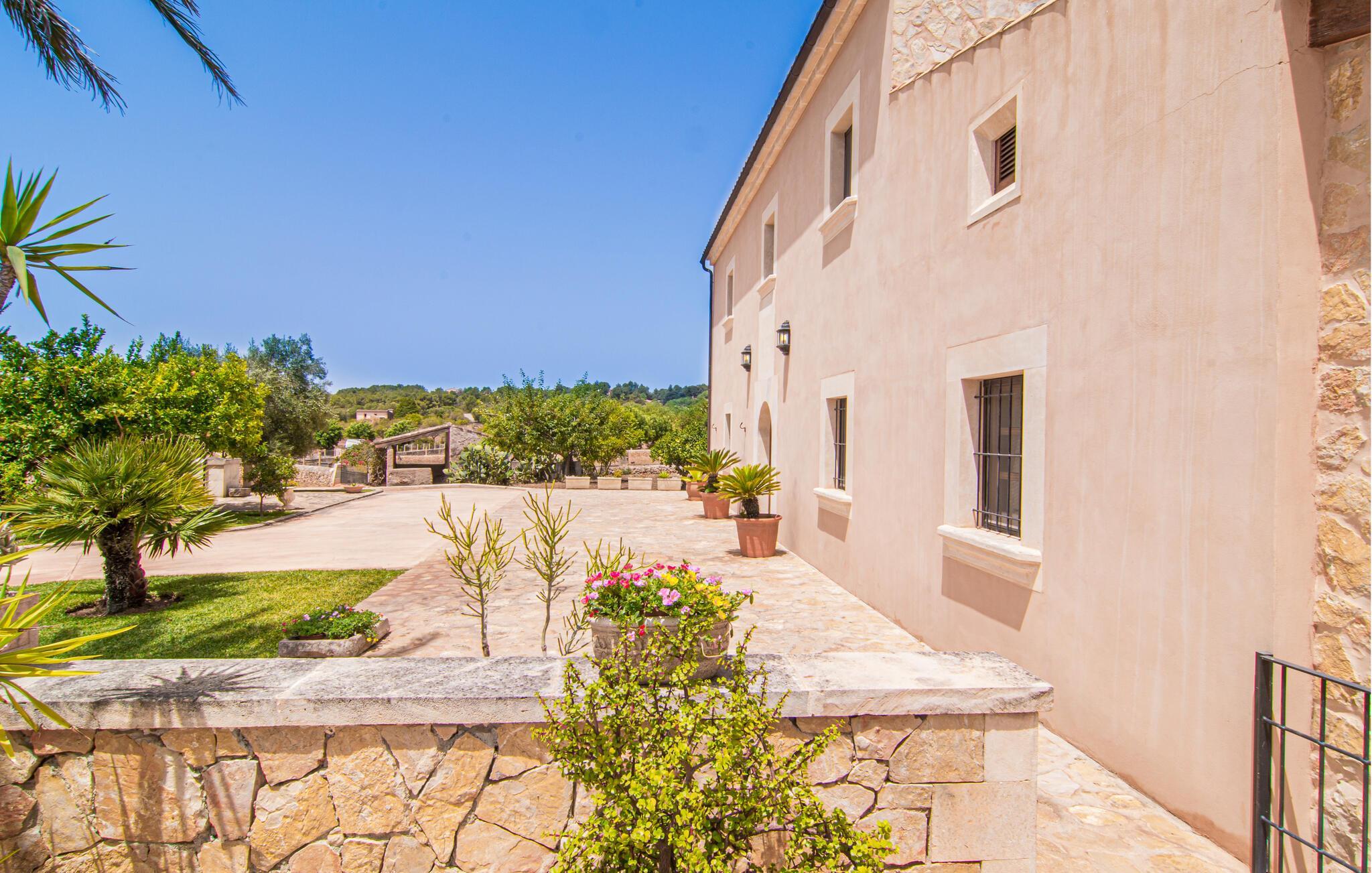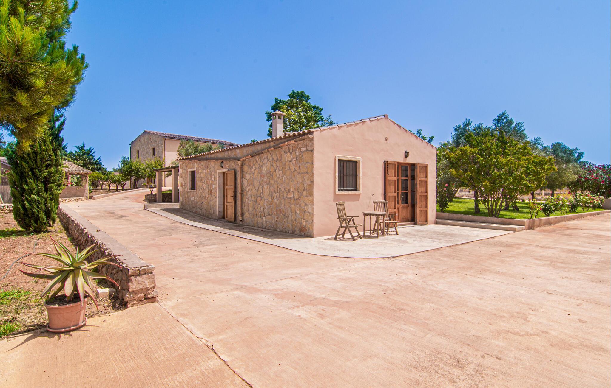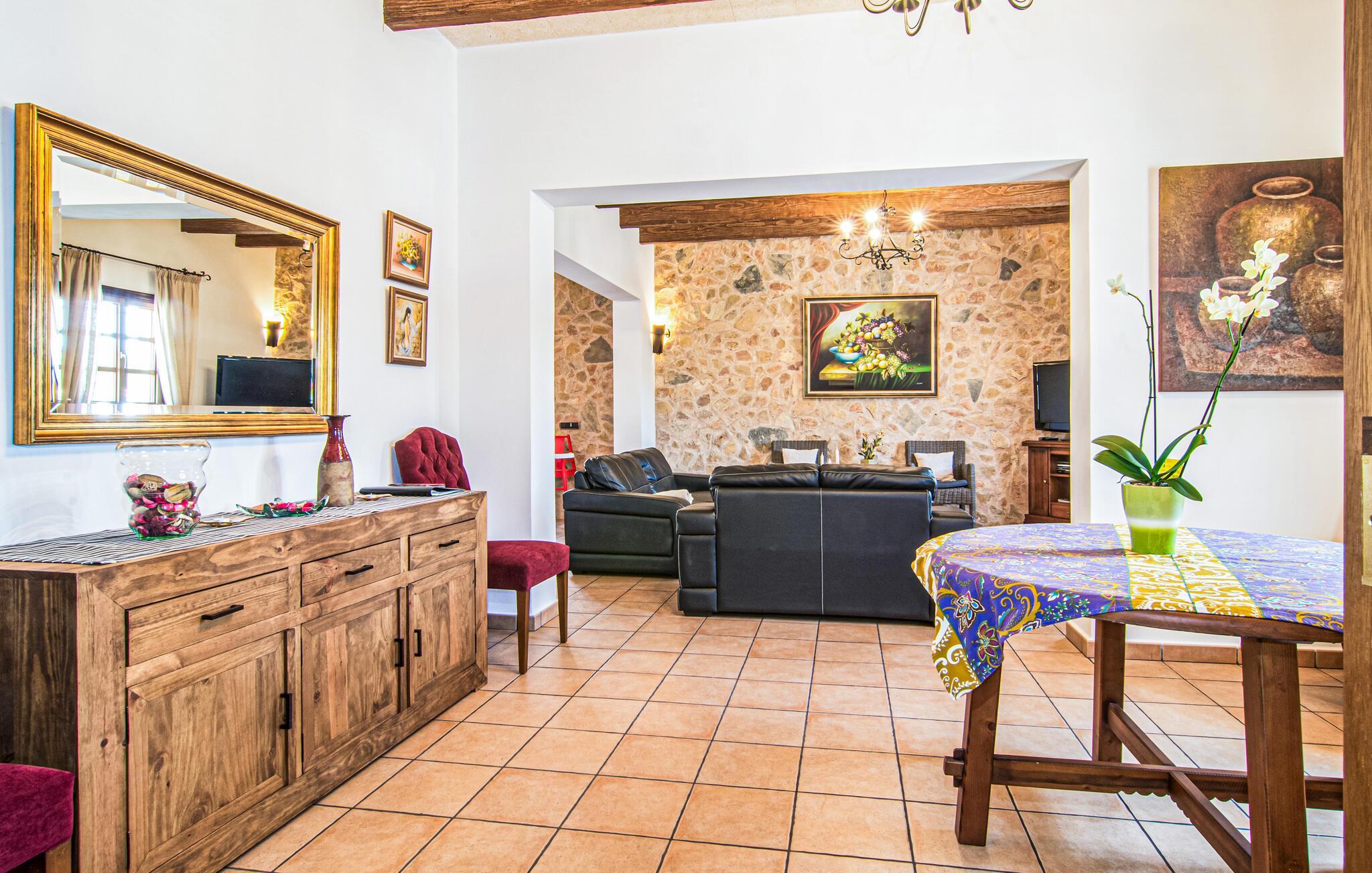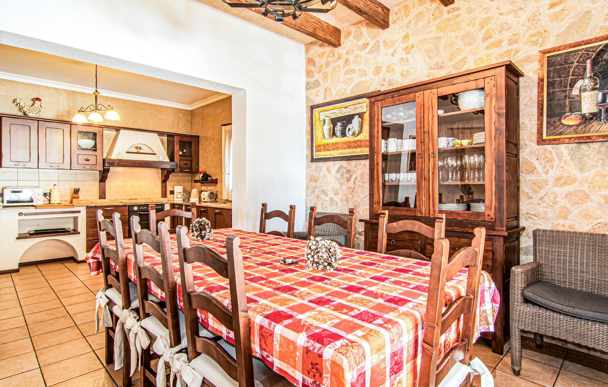 Eingebettet in ein ruhiges, weitläufiges Grundstück, heißt Sie dieses wunderschöne mallorquinische Anwesen herzlich willkommen. Treten Sie ein und erkunden Sie die liebevoll eingerichteten Räumlichkeiten, in denen gepflegte Holzbalken, Natursteinwände und prachtvolle, traditionelle Möbel für eine authentische Atmosphäre sorgen. Zaubern Sie köstliche Gerichte in der geräumigen Küche, plaudern Sie auf einem der vielen gemütlichen Sofas oder ziehen Sie sich für ruhige Lesestunden an Ihren Lieblingsort zurück.