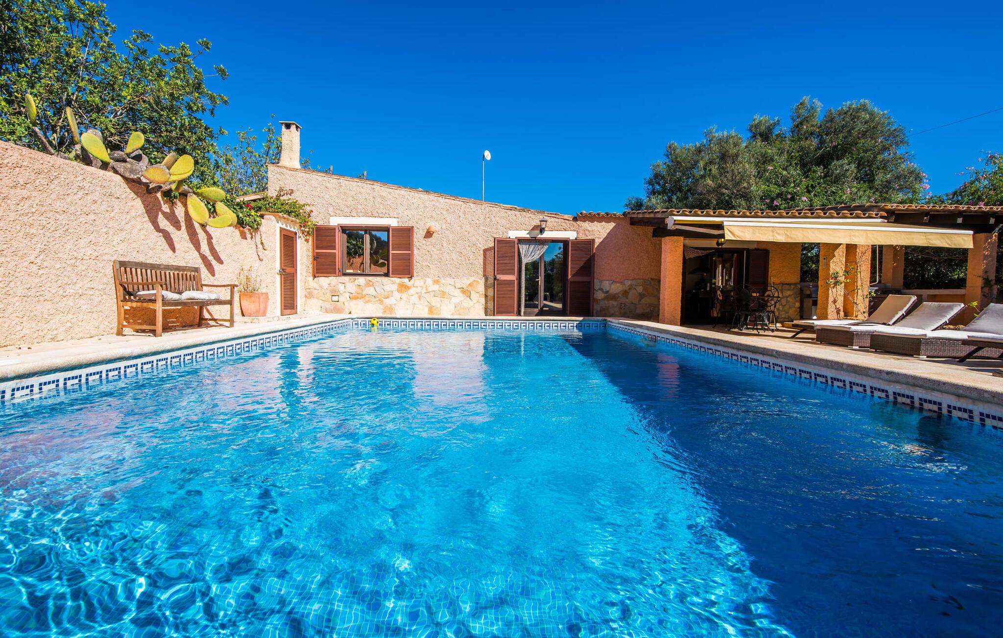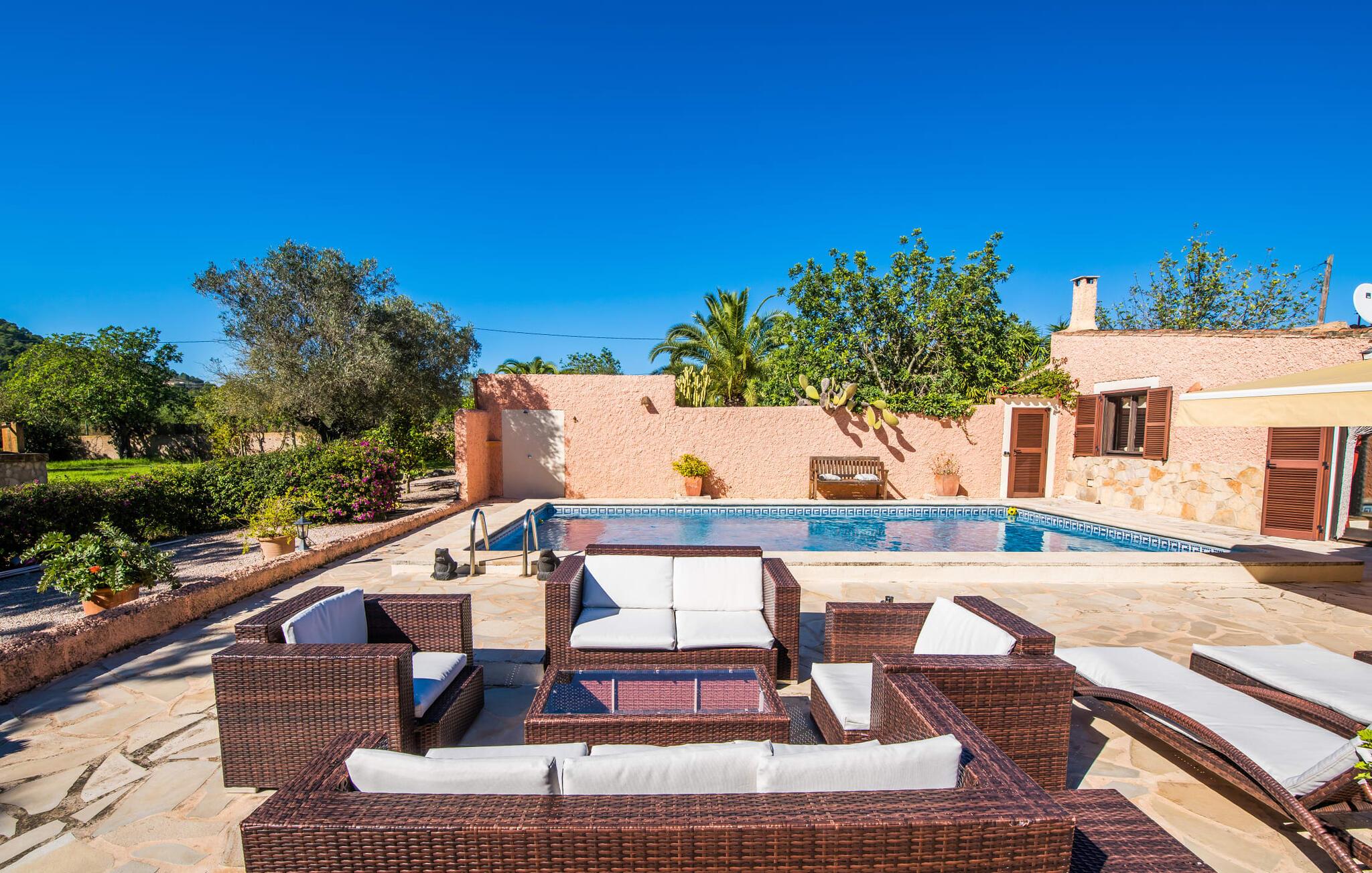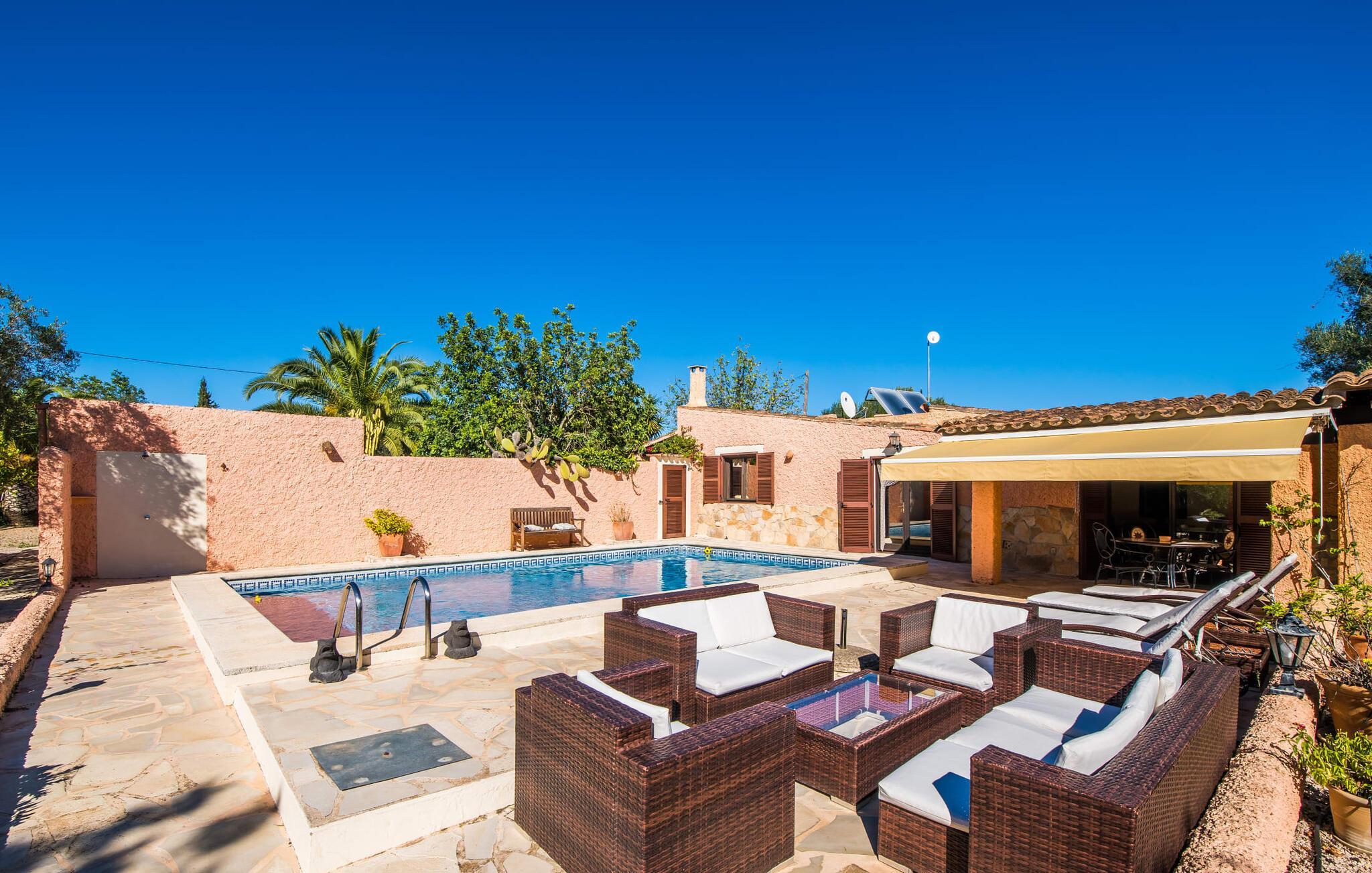 Die Villa bietet ca. 120 m² durchdacht eingerichtete ebenerdige Wohnfläche. Das helle Wohnzimmer mit seinen Naturtönen und fröhlichen Akzenten bietet einen gemütlichen Treffpunkt. Die offene Küche ist komplett für Selbstversorger ausgestattet und bietet einfachen Zugang zur Terrasse für ein nahtloses Leben im Innen- und Außenbereich. Es gibt zwei komfortable Schlafzimmer, zwei stilvoll gestaltete Badezimmer mit Tageslicht (eines davon en-suite) sowie eine nur 8 m entfernte Casita für zwei weitere Gäste, komplett mit Schlafzimmer und en-suite Badezimmer. Diese Villa bietet Privatsphäre und Entspannung und ist ideal für ruhesuchende Reisende, Golfer und Wanderer. Sie ist ein perfekter Rückzugsort, um die Schönheit Mallorcas abseits der Menschenmassen zu erkunden.