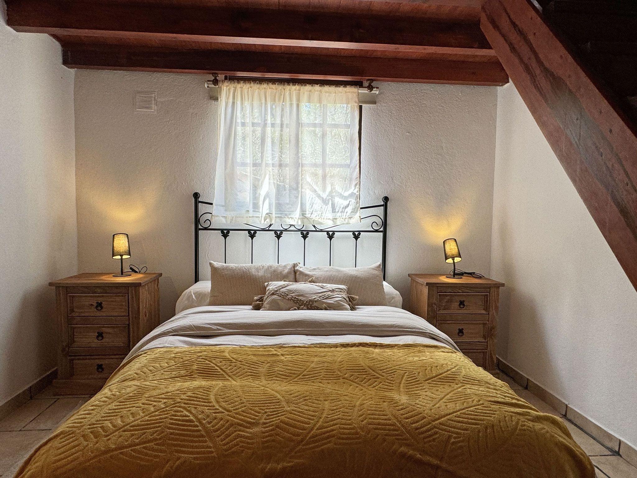 Schlafzimmer: Im Erdgeschoss befindet sich ein Schlafzimmer mit einem französischen Doppelbett und ein großer Wandschrank. Eine Treppe führt zum offenen Dachraum.