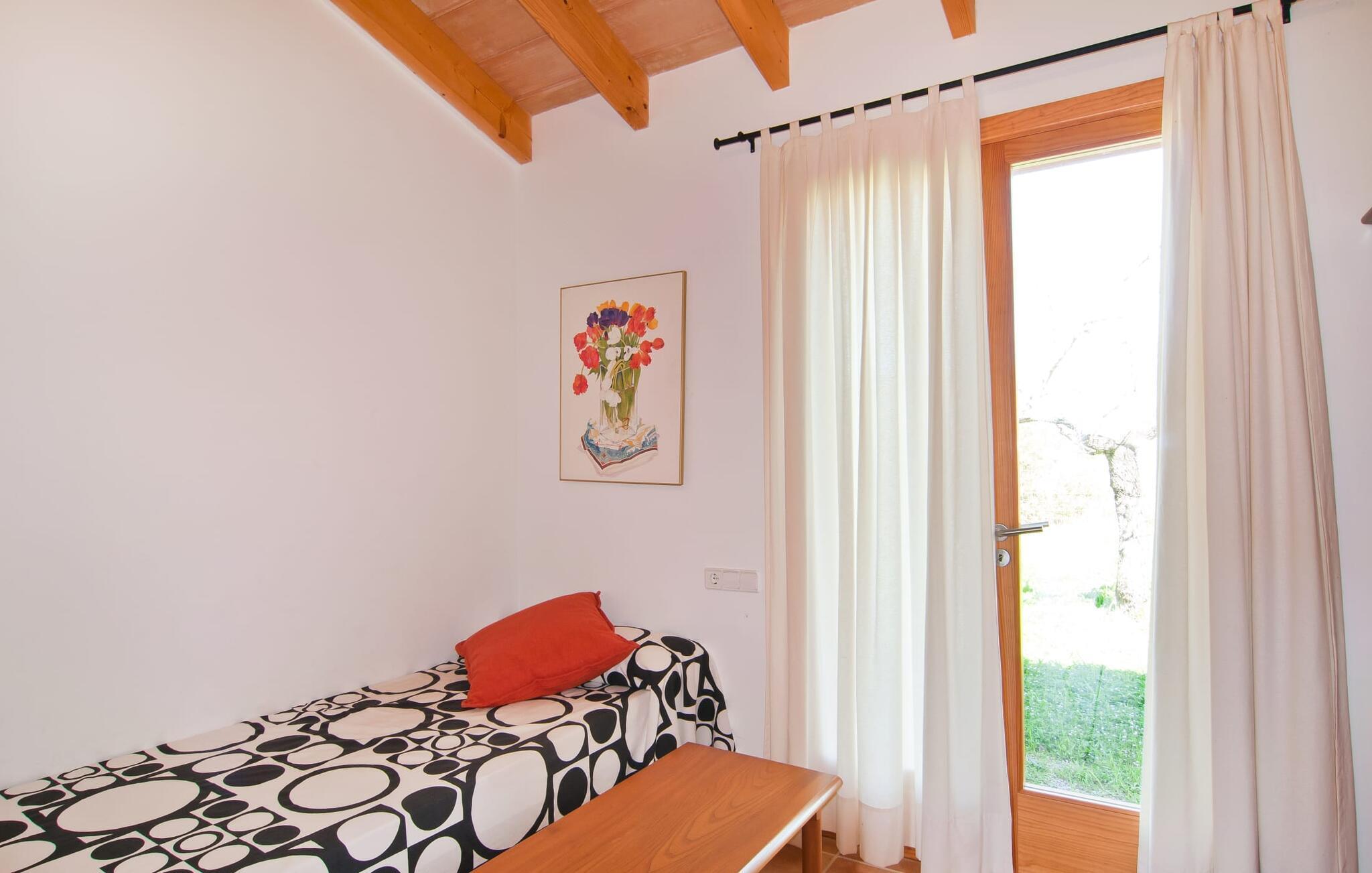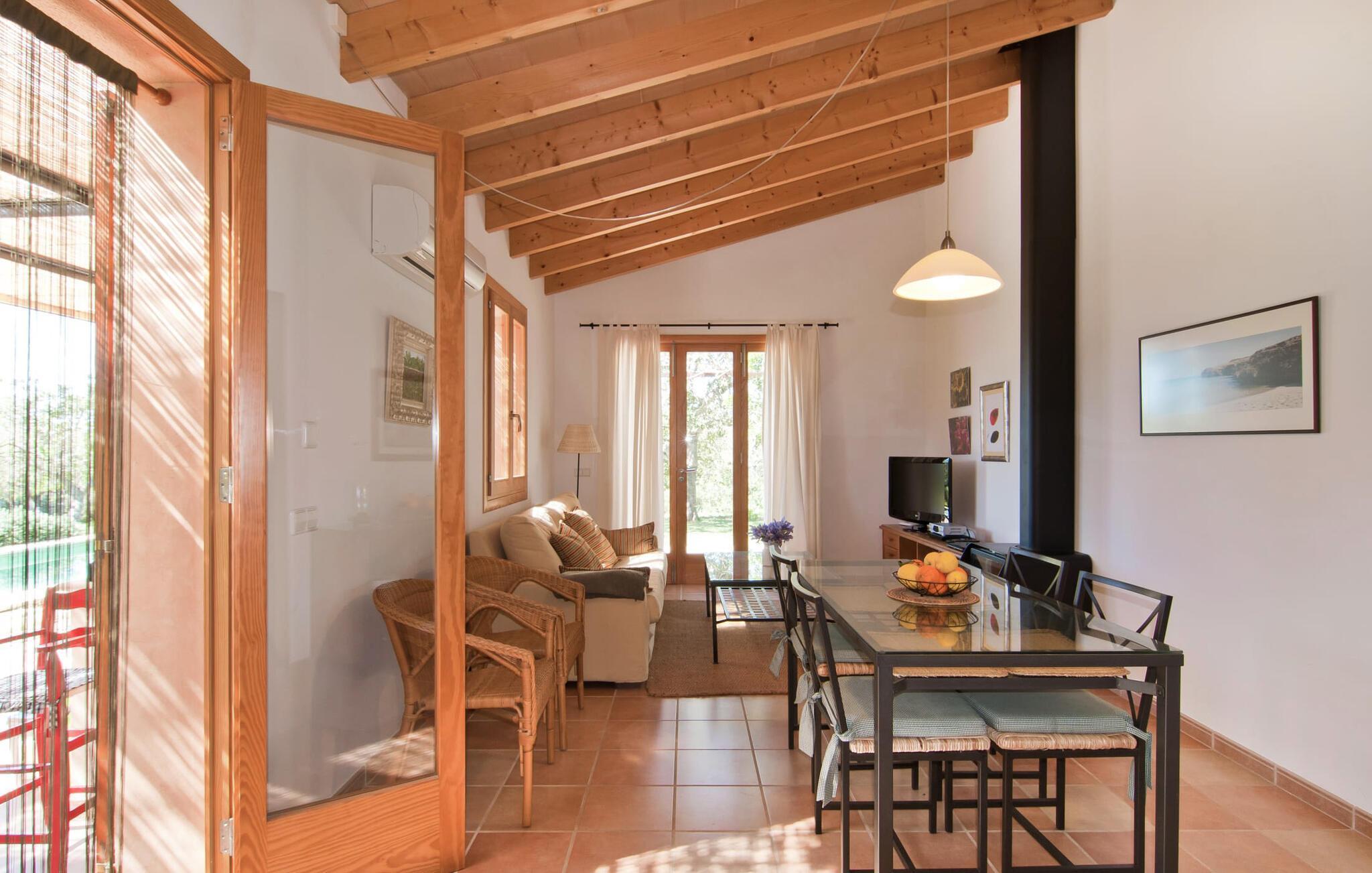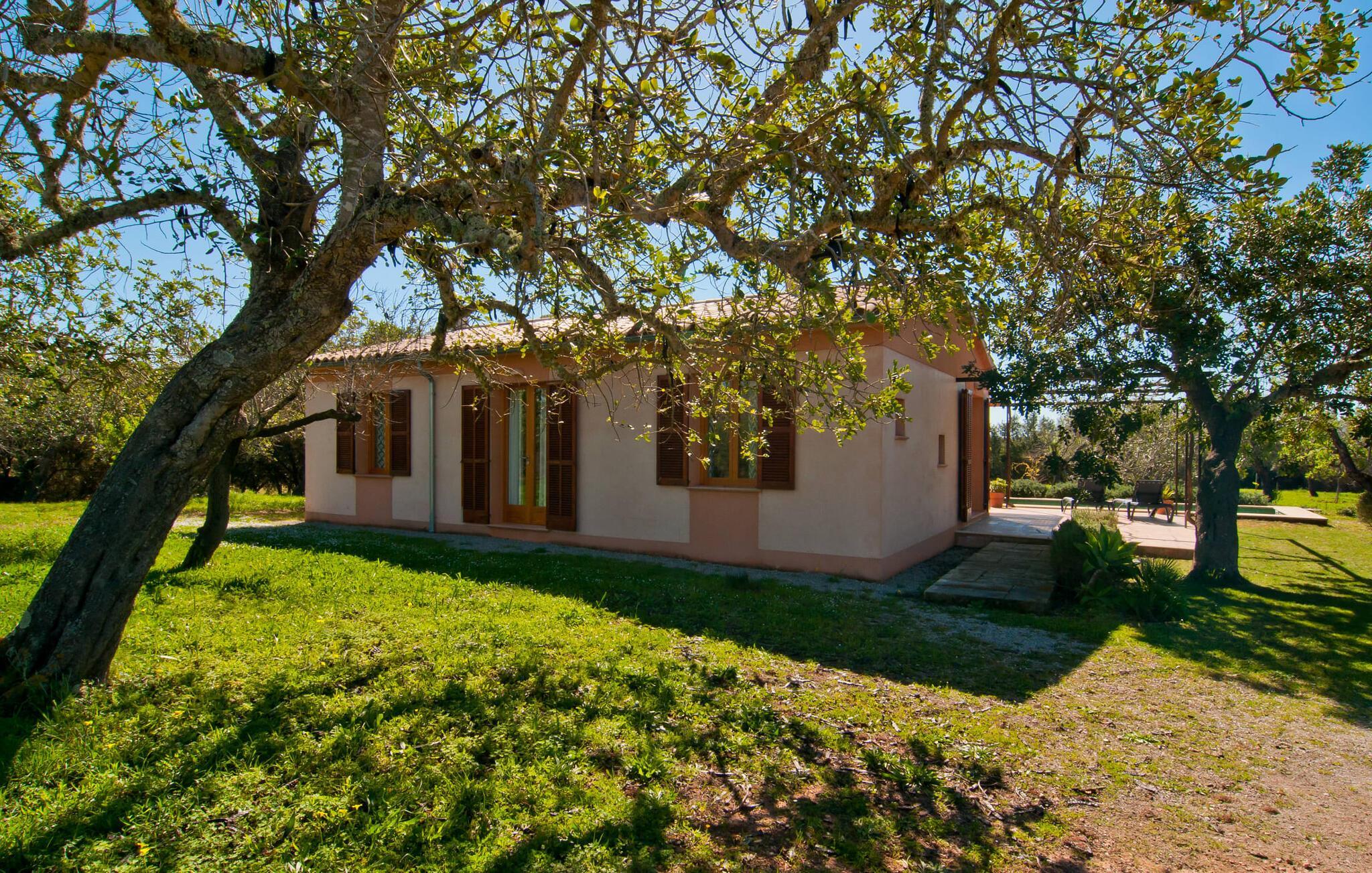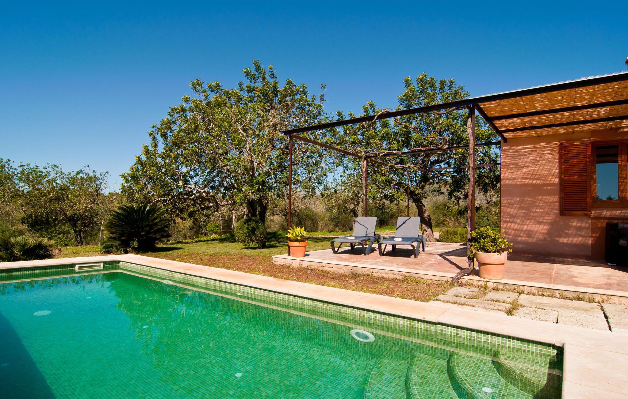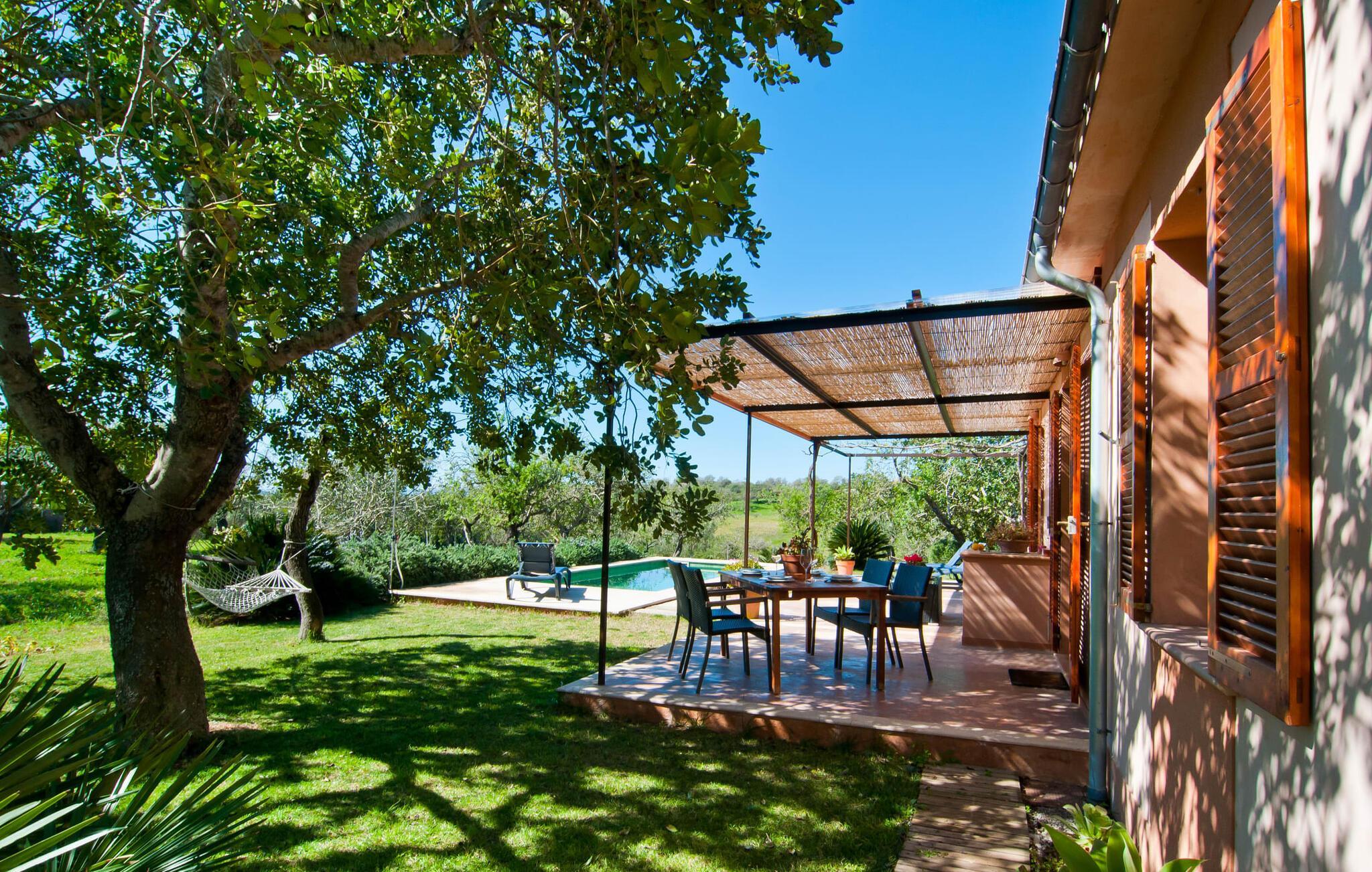 Dieses besonders schöne Ferienhaus ist eine bezaubernde Oase der Ruhe, umgeben von Natur und günstig in der Nähe von Sant Llorent gelegen. Ein von Obstbäumen umgebener Bereich empfängt die Gäste freundlich und eröffnet den Blick auf die idyllische Gartenanlage mit Terrassen und Rasenflächen. In seinem Herzstück verbirgt sich das Highlight des Außenbereichs: der dekorativ geflieste Swimmingpool. Für Ihre Entspannung stehen am 24 m² großen Pool zwei hübsche kleine Sonnenliegen zur Verfügung, die über eine Treppe erreichbar sind. Eine Außendusche ist ebenfalls vorhanden. Die Möbel auf der geschmackvoll eingerichteten, lichtdurchfluteten, mit Bambus überdachten Terrasse laden zum Verweilen und Entspannen ein – und eignen sich auch perfekt für ein erfrischendes Getränk. Der hübsche Esstisch in der Nähe lädt einfach dazu ein, draußen zu speisen und die ländliche Aussicht zu genießen. Abends werden Sie es lieben, an diesem attraktiven kleinen Ort zu sitzen und ein kulinarisches BBQ zu veranstalten, bei dem Sie die frischen lokalen Köstlichkeiten genießen, die Sie am Tag zuvor gekauft haben.