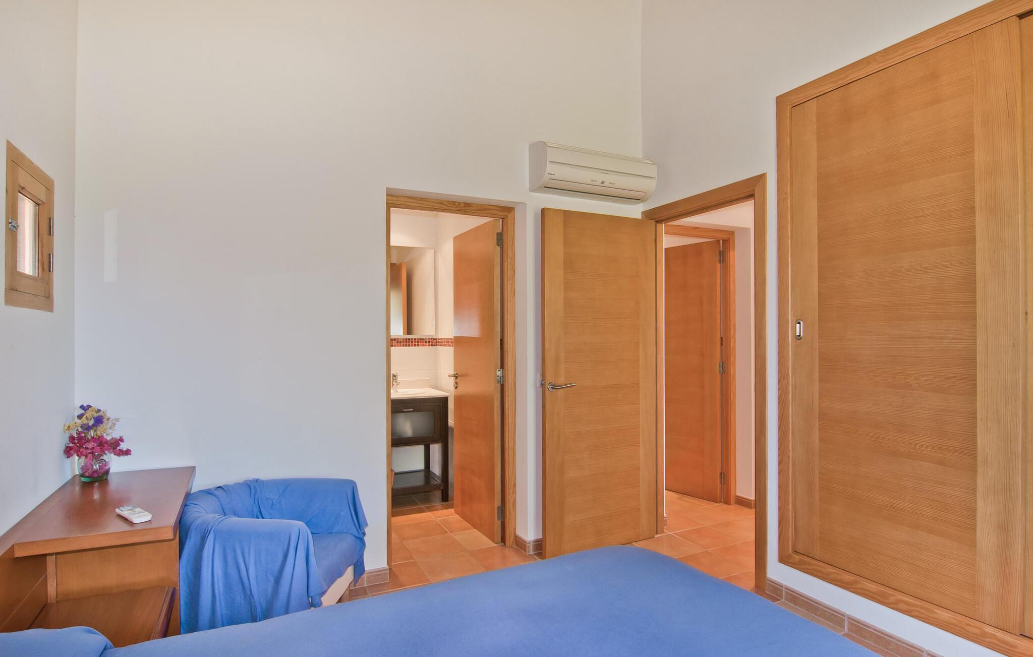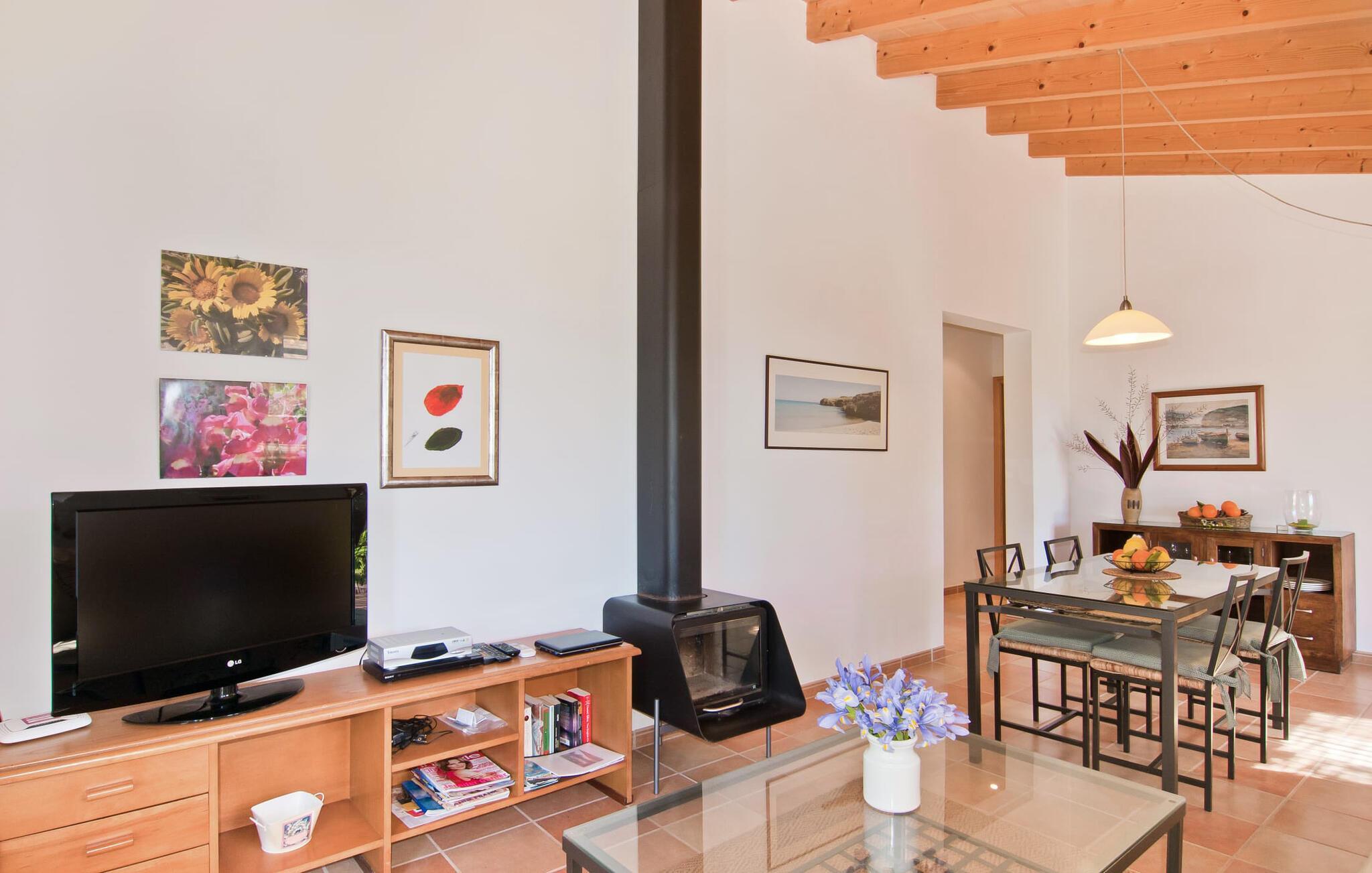Das Innere des Anwesens wirkt rustikal und liebevoll und bietet ein tolles und gemütliches Ambiente. Über die Terrasse gelangt man in das kombinierte Wohn-/Esszimmer, auf der rechten Seite befindet sich die Küche. Eine Tür führt geradeaus in einen Flur, von wo aus Sie in die Schlafzimmer gelangen. Zwei davon sind Doppelzimmer, eines davon mit eigenem Bad. Das zweite Badezimmer sowie das Einzelschlafzimmer befinden sich ebenfalls hier. Das angenehme Ambiente dieses Hauses wird durch seine hübschen Einzelmöbel sowie das harmonische Grundgerüst aus hellen Wänden, Holzdecken und Terrakottafliesen unterstrichen. An kühlen Abenden zaubert der moderne Kamin im Wohnzimmer eine heimelige Stimmung und wohlige Wärme, während der Sat-TV die Möglichkeit bietet, auf dem bequemen beigen Sofa einen guten Film zu schauen. Die Küche mit ihren auffälligen grünen Wandfliesen und der schönen Aussicht auf die Umgebung bietet alles für den täglichen Bedarf – Cerankochfeld, Backofen, Kühlschrank, Mikrowelle, Wasserkocher und Kaffeemaschine. In den sehr schön eingerichteten Schlafzimmern (zwei davon klimatisiert) ist Ihnen eine erholsame Nacht gewiss und Sie werden sich nachhaltig erholen können. Es stehen zwei Betten von 1,5 x 1,9 m sowie ein weiteres von 0,9 x 1,9 m zur Verfügung. Zwei helle und voll funktionsfähige Badezimmer vervollständigen den Innenbereich.