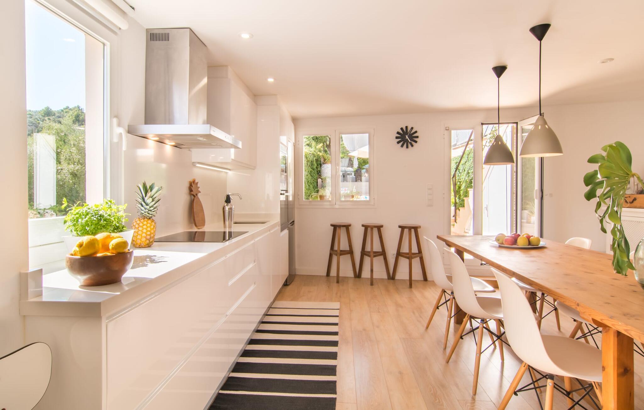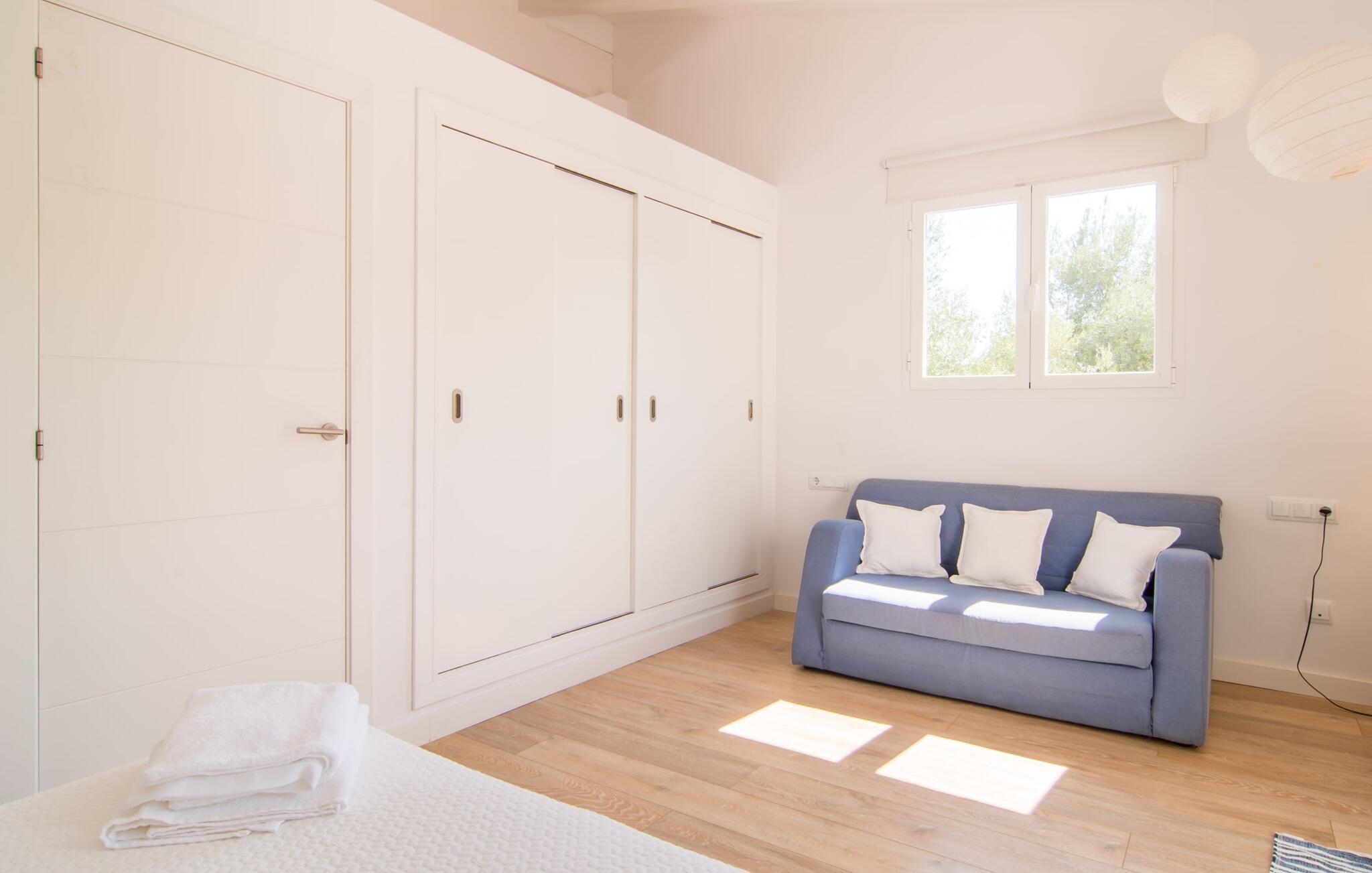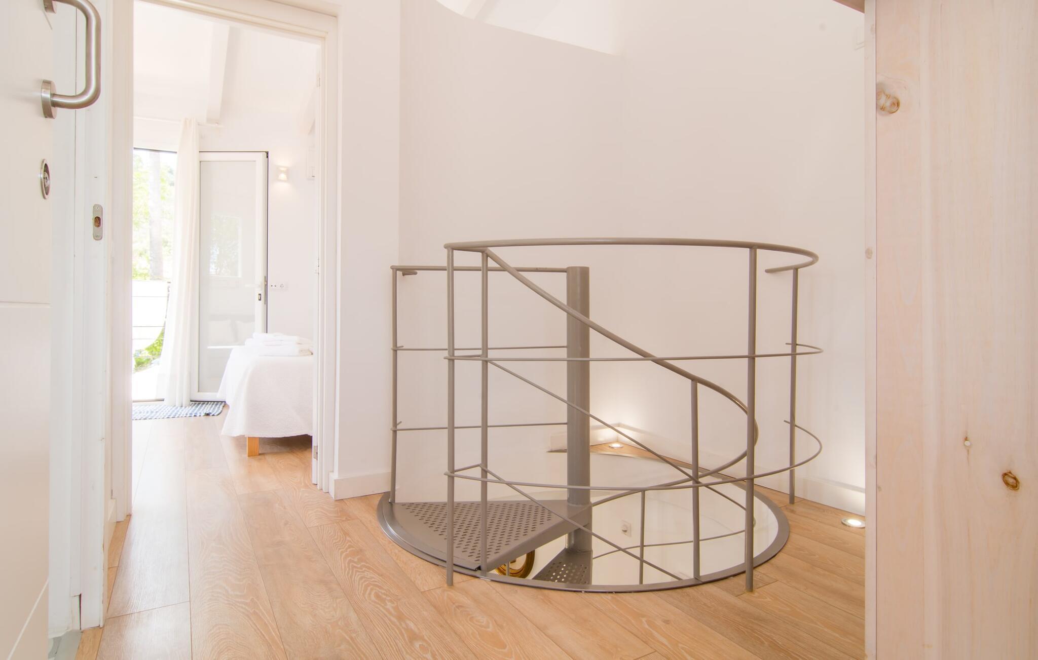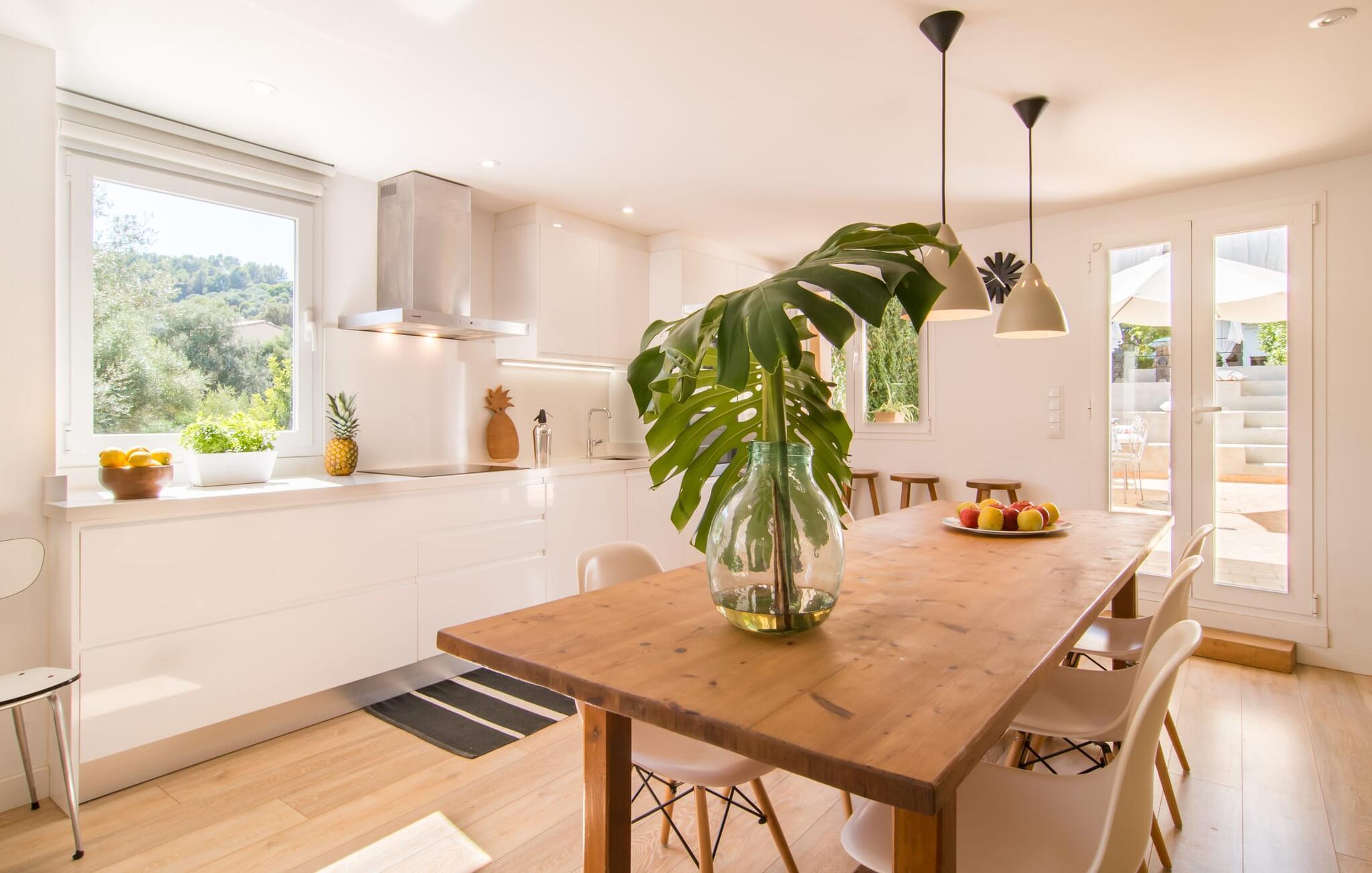 Von der Terrasse hinter dem Haus haben Sie Zugang zum trendigen, in Weiß gehaltenen Interieur der Villa. Das helle und lebendige Erdgeschoss empfängt Sie mit einer modernen und voll ausgestatteten, offenen Küche. Der große Holztisch mit viel Platz für gemeinsame Mahlzeiten bietet an kühleren Tagen eine Alternative zum Esstisch im Freien direkt vor der Terrassentür. Dies ist auch ein toller Ort für einen geselligen Abend mit Brettspielen. Ein kleiner Schreibtisch zum Schreiben Ihrer Urlaubspostkarten oder zum Erledigen mitgebrachter Arbeiten und ein großes, bequemes Ecksofa runden den Wohn-/Essbereich ab. Außerdem finden Sie auf dieser Etage ein Badezimmer und ein helles, weißes Doppelzimmer. Im Obergeschoss stehen den Gästen zwei weitere Schlafzimmer und ein Badezimmer zur Verfügung. Eines der beiden Schlafzimmer hat über eine Außentreppe Zugang zum Garten, so dass Sie für ein morgendliches Bad auf dem kürzesten Weg zum Pool gelangen. Das Schlafzimmer an der Vorderseite verfügt außerdem über eine große Terrasse, die mit schöner Aussicht und Liegestühlen zum Sonnenbaden einlädt.