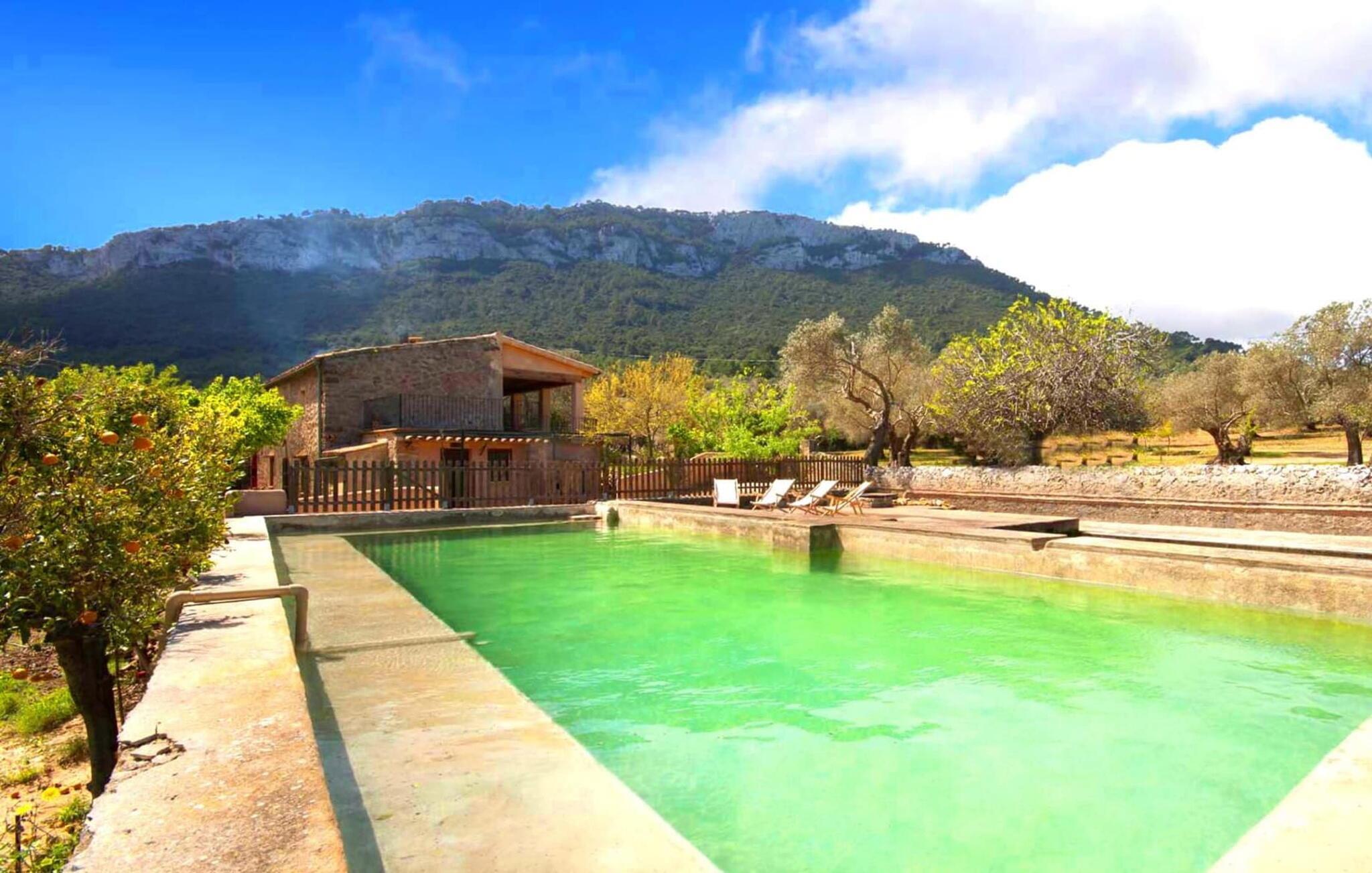 Wenn Sie das hübsche Künstlerdorf Valldemossa verlassen und in Richtung Banyalbufar fahren, gelangen Sie in eine der schönsten, einsamsten und unerschlossensten Küstenregionen auf ganz Mallorca. Hier zeigt sich die Insel von ihrer friedlichsten und ursprünglichsten Seite. Nur 3 km nach dem Verlassen von Valldemossa finden Sie die sehr abgelegene Villa „Gonzalo“, ein altes mallorquinisches Landhaus, das 2011 komplett restauriert und renoviert wurde. Es präsentiert sich nun vor einer atemberaubend malerischen Kulisse. Der idyllische Außenbereich ist bestens auf die Bedürfnisse erholungssuchender Urlauber abgestimmt. Der 9 m lange Pool, der gleichzeitig das Herzstück des weitläufigen, terrassenförmigen Außenbereichs mit überdachtem Bereich ist, lädt zum Schwimmen und Entspannen ein und bietet eine ideale Alternative zum Schwimmen im Meer. Der Großteil der Villa ist übrigens rein organisch. Es liegt in einer ländlichen Gegend, die nicht vom Tourismus überschwemmt ist und daher eine eigene Infrastruktur entwickeln musste. Moderne alternative Energieerzeugung mit autarken Ver- und Entsorgungsanlagen ermöglichen den Betrieb der Villa in naturnaher Umgebung. Die hier lebenden Schafe kommen zu Besuch direkt vor das Haus, was für die Kinder besonders spannend ist.