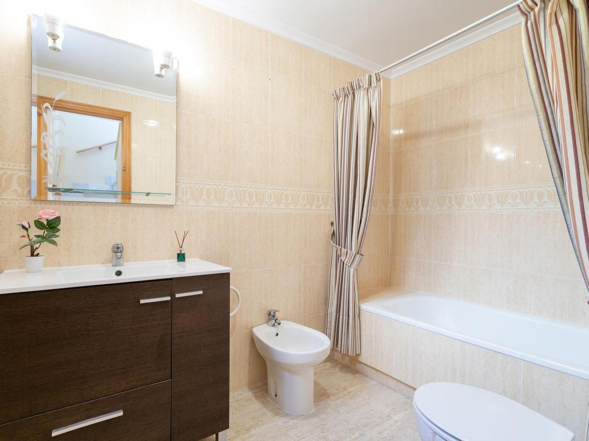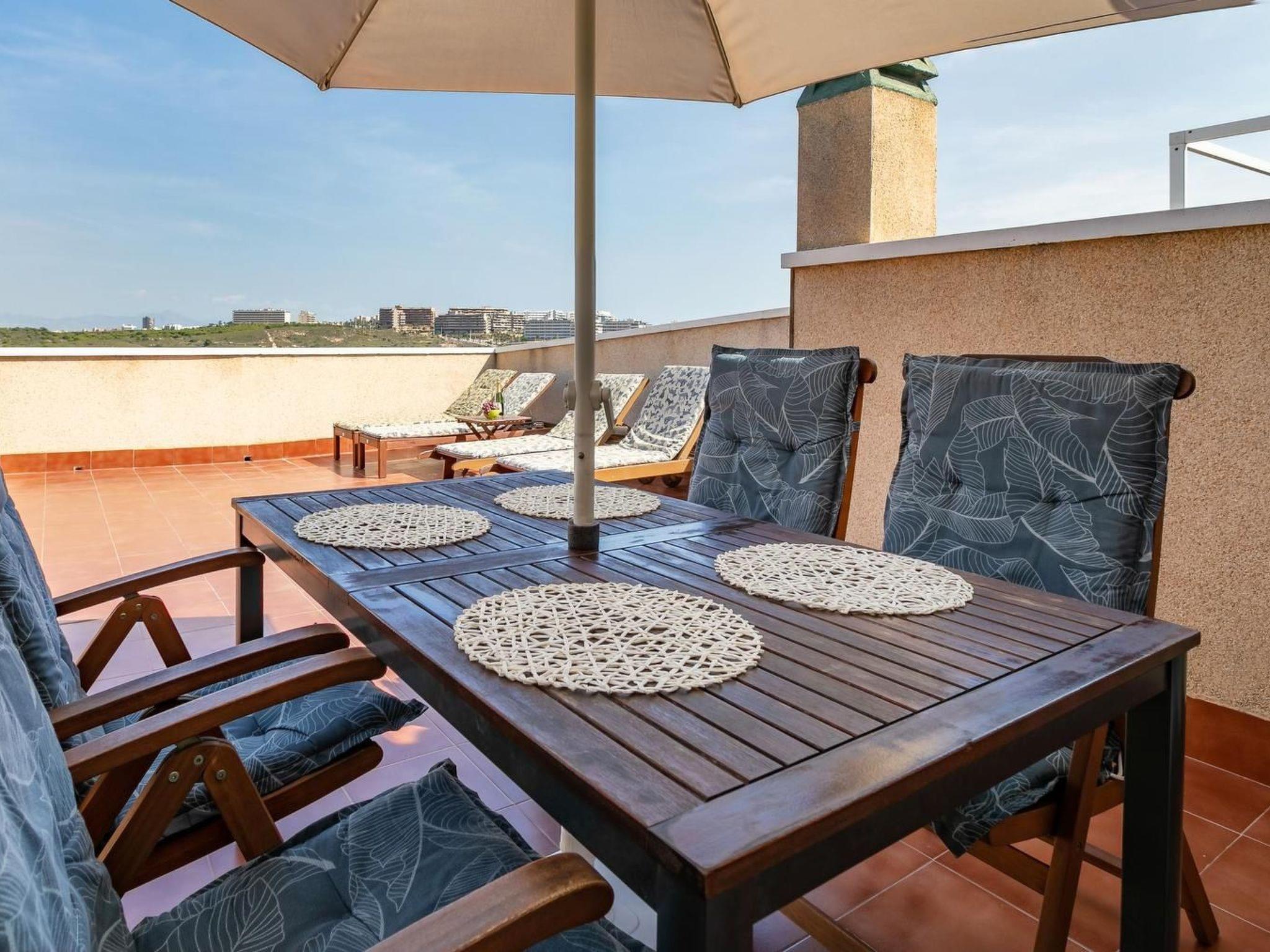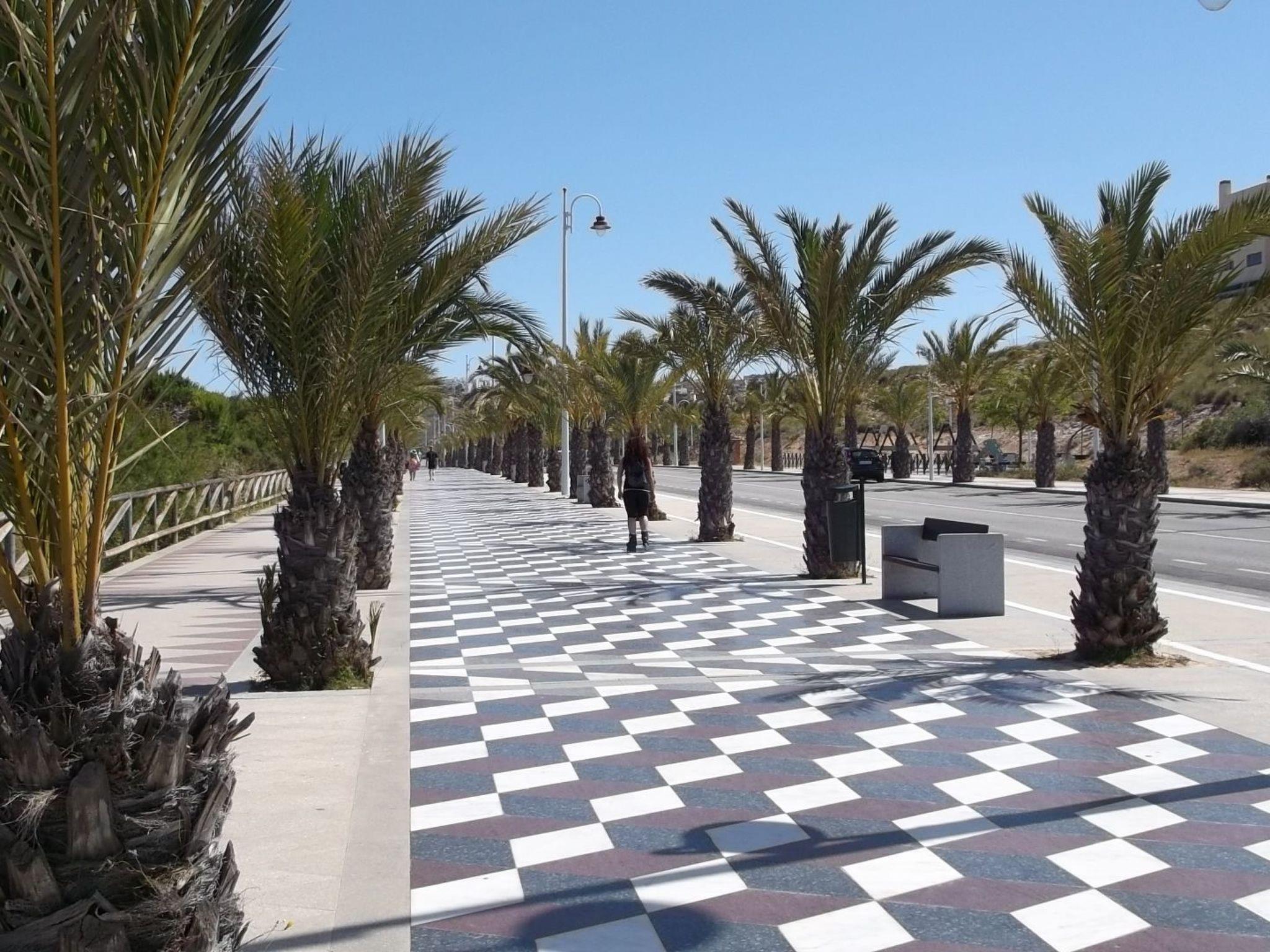 Die Entfernung zum Meer beträgt nur 800 m. Sie können diese Strecke in 15 Minuten zu Fuß zurücklegen und dabei die mediterrane Vegetation bewundern: Bougainvillea, Jasmin, Oleander und Palmen. Gran Alacant ist ein ruhiges Küstendorf an der Costa Blanca, 12 km südlich von Alicante, 5 km vom Zentrum des hübschen Touristenortes Santa Pola und nur 9 km vom internationalen Flughafen Alicante entfernt. Gran Alacant liegt direkt am Meer, am reizvollen Sandstrand von Carabassi, der seit vielen Jahren mit der Blauen Flagge ausgezeichnet ist. An den Strand grenzt ein breiter Dünenstreifen mit geschützter tropischer Vegetation und ein Naturschutzgebiet, das Teil des sogenannten El Paraje Natural Municipal Clot de Galvany ist. Der Naturpark trennt Gran Alacant im Norden von dem Dorf Arenales del Sol, das in der Hochsaison belebt ist und alle üblichen Attraktionen eines Touristenortes bietet. Die beiden Dörfer sind durch eine schöne, palmengesäumte Strandpromenade verbunden, ein beliebter Ort für Spaziergänge am Nachmittag und am Abend, und es dauert etwa 40 Minuten, um von einem Dorf zum anderen zu laufen. Am Eingang von Gran Alacant, etwa 1800 m von der Wohnung entfernt, befindet sich ein Einkaufszentrum mit zahlreichen Restaurants und Geschäften, darunter Burger King, Mercadona, Lidl, Consum.