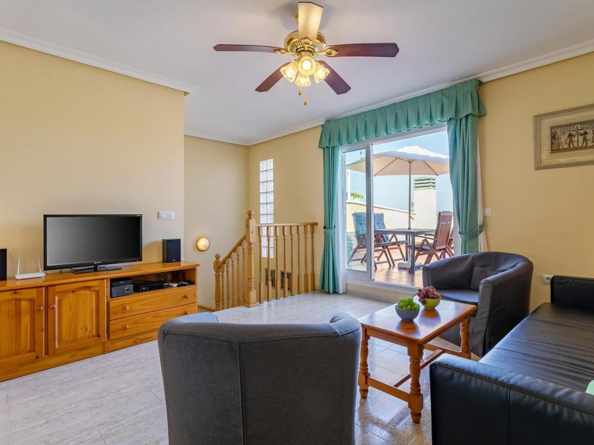 Das Wohnzimmer im ersten Stock ist mit einer Sofagarnitur mit Couchtisch, Tisch, vier Stühlen, LCD-TV, Sat-TV, kostenlosem WiFi, DVD/CD/MP3 ausgestattet. Das Wohnzimmer öffnet sich auf eine geräumige (50m2 ) möblierte Terrasse mit Blick auf das Meer und die Berge. Auf der Terrasse stehen den Gästen ein Tisch, 4 Stühle, ein Sonnenschirm und 3 Liegestühle zur Verfügung. Die gesamte Wohnung ist klimatisiert. Im ersten Stock gibt es auch eine Küche, die mit einem Elektroherd mit Cerankochfeld, Backofen, Kaffeemaschine, Toaster, Mikrowelle, Wasserkocher, Geschirr, Töpfen, Besteck, Gläsern und Bechern ausgestattet ist. Neben der Küche befindet sich ein Hauswirtschaftsraum mit Waschmaschine. Im Erdgeschoss befinden sich zwei Schlafzimmer: eines mit einem Doppelbett, das andere mit zwei Einzelbetten. Den Gästen stehen 2 Bäder zur Verfügung: im Erdgeschoss mit Badewanne und Bidet, im Erdgeschoss mit Duschkabine.